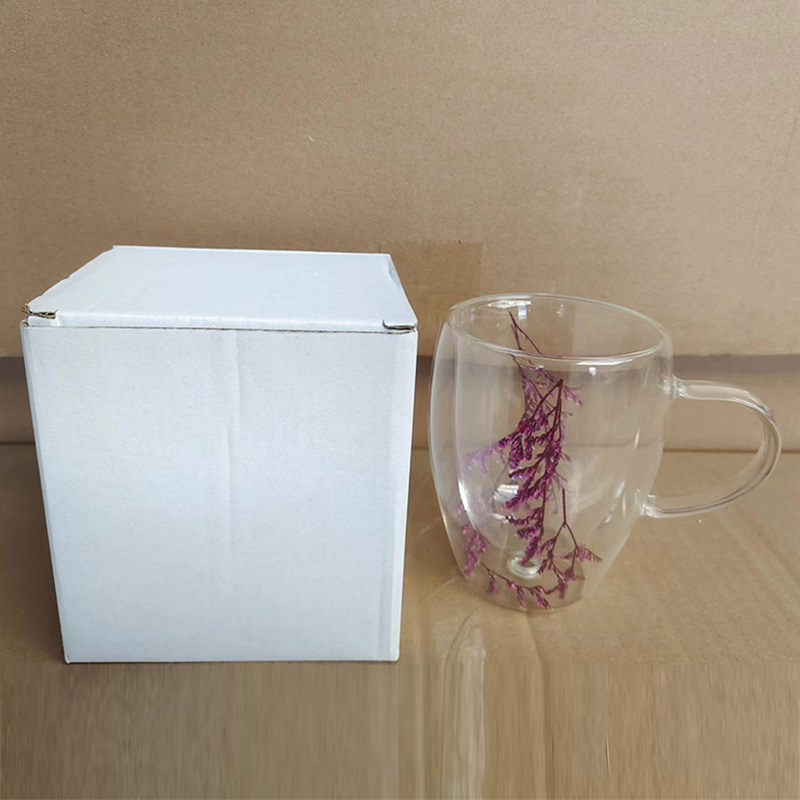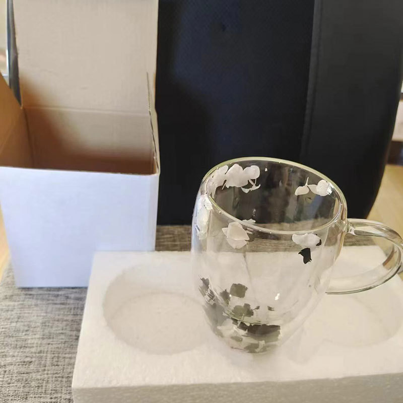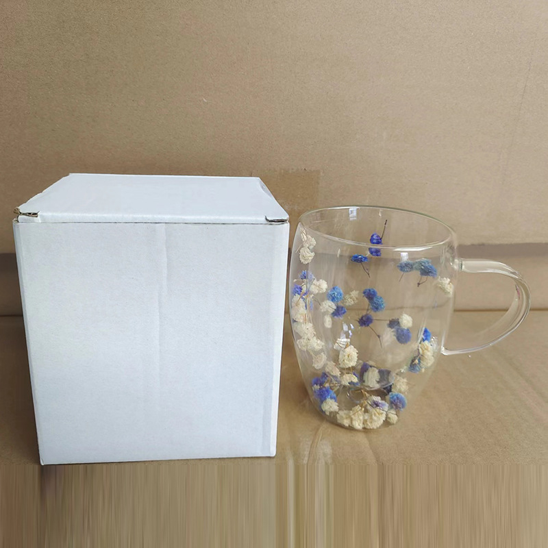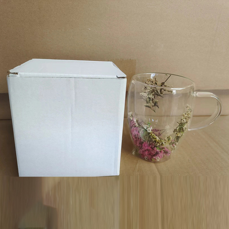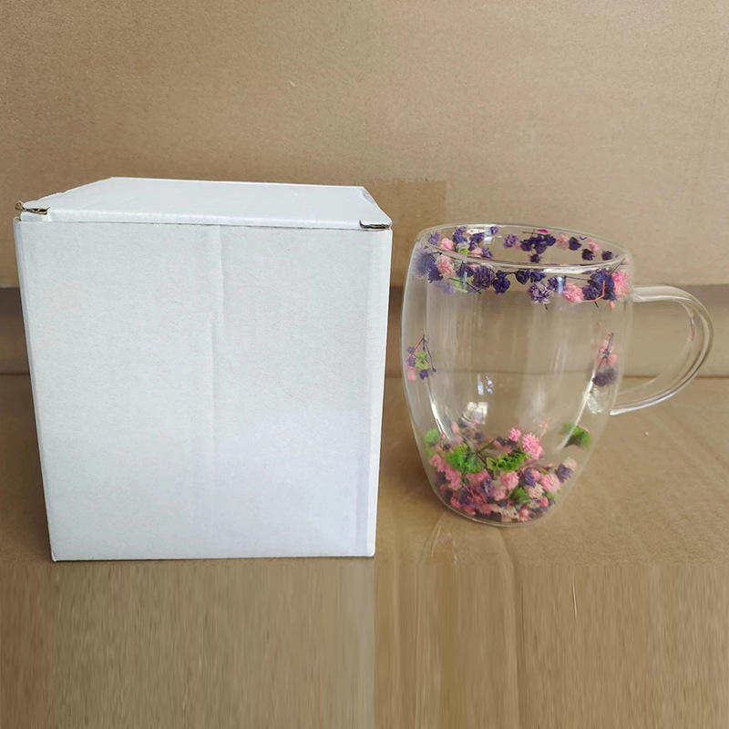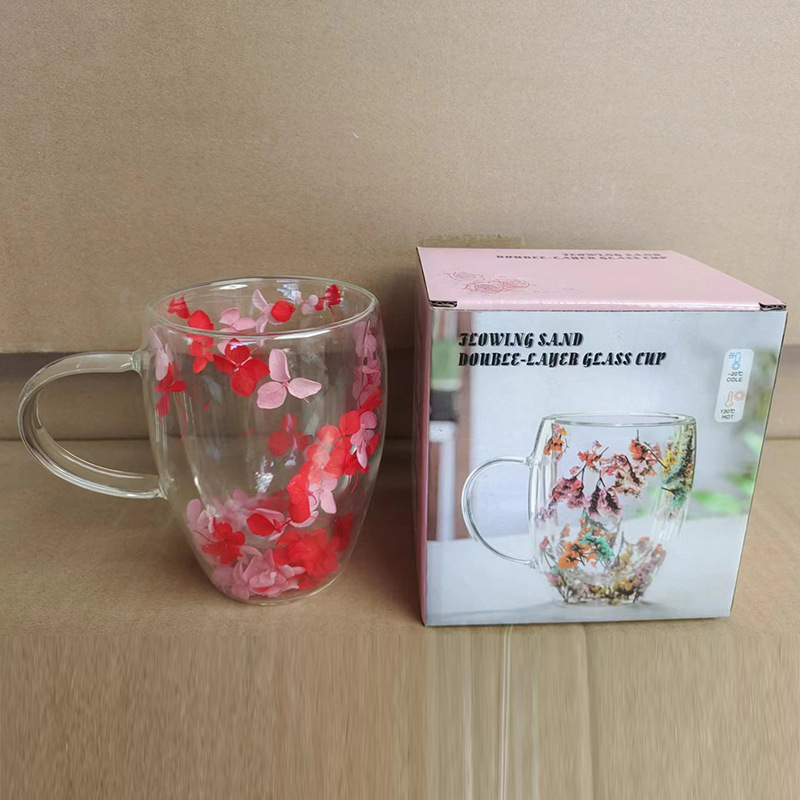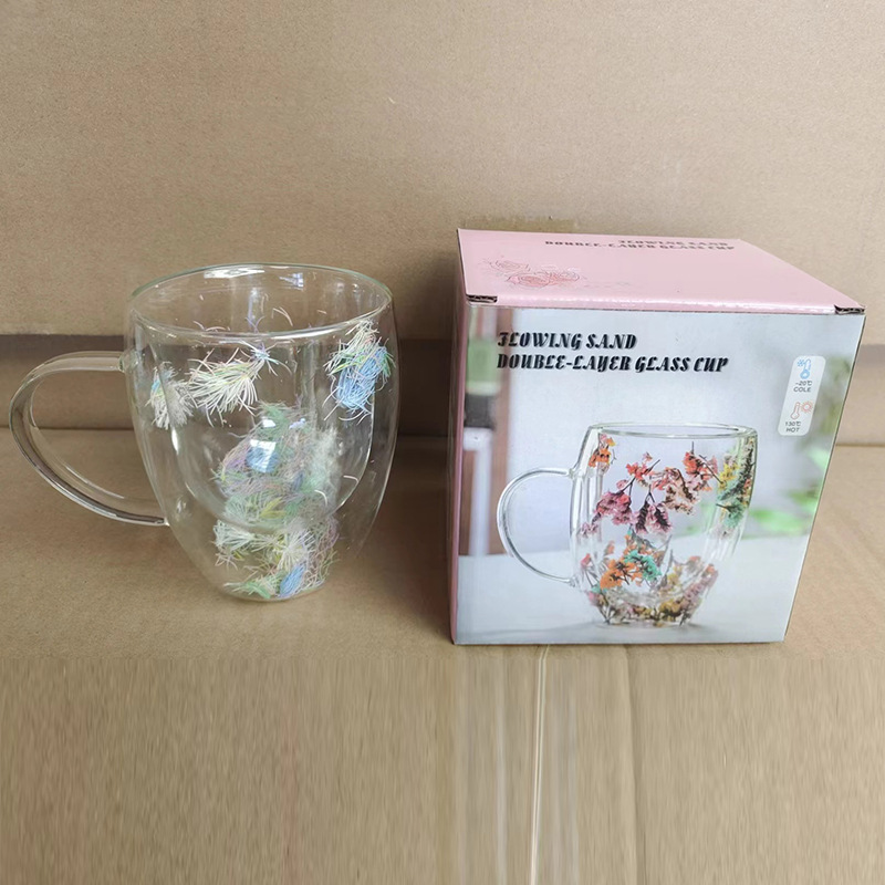 双层玻璃杯真花杯高颜值水杯家用带把手茶杯玻璃杯子批发耐高温