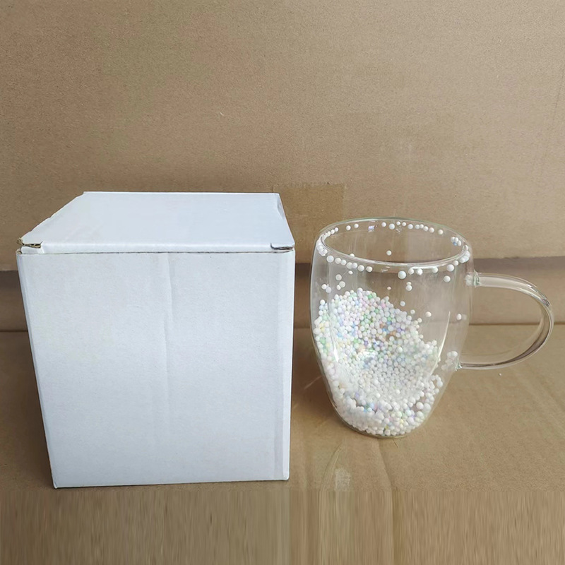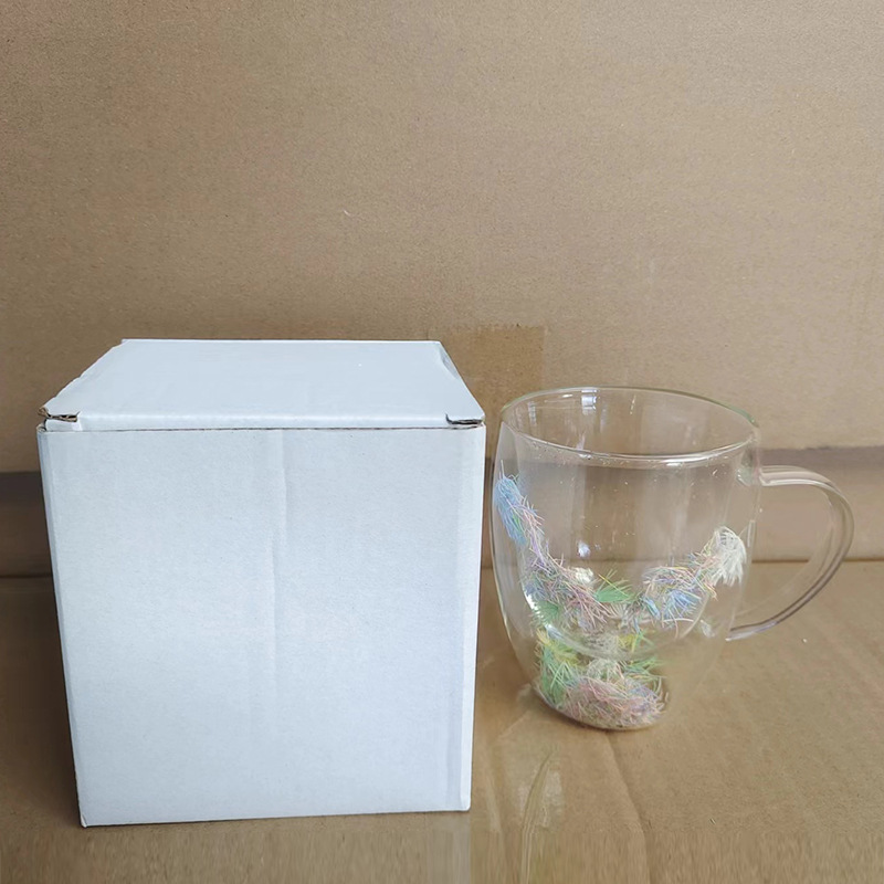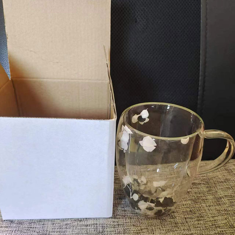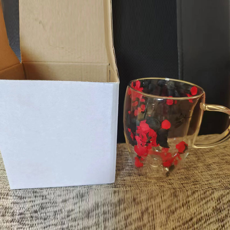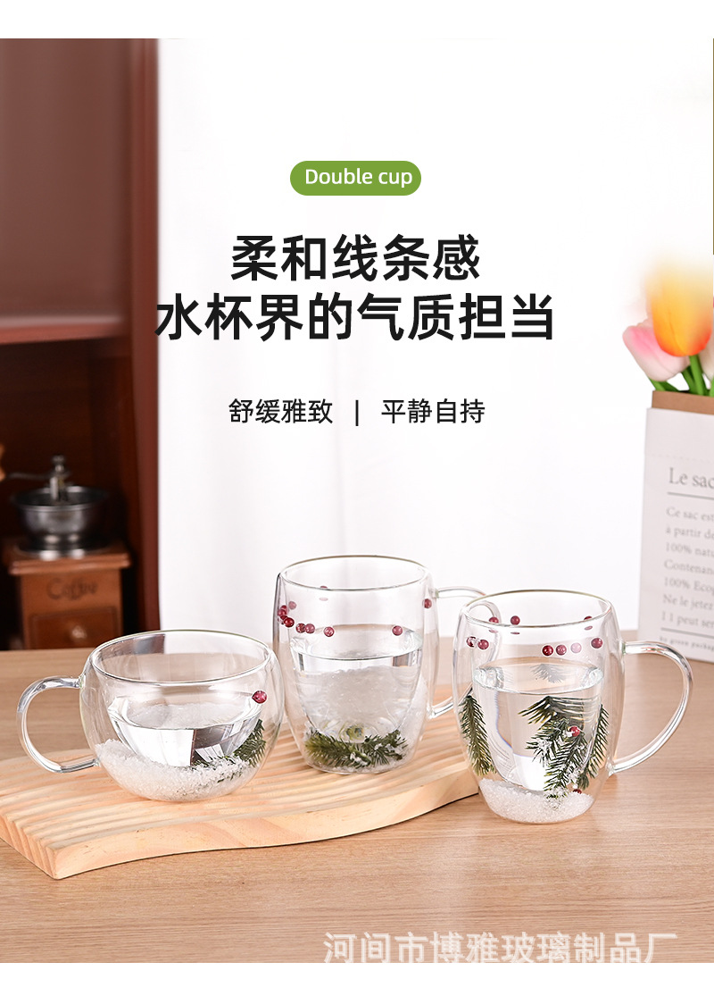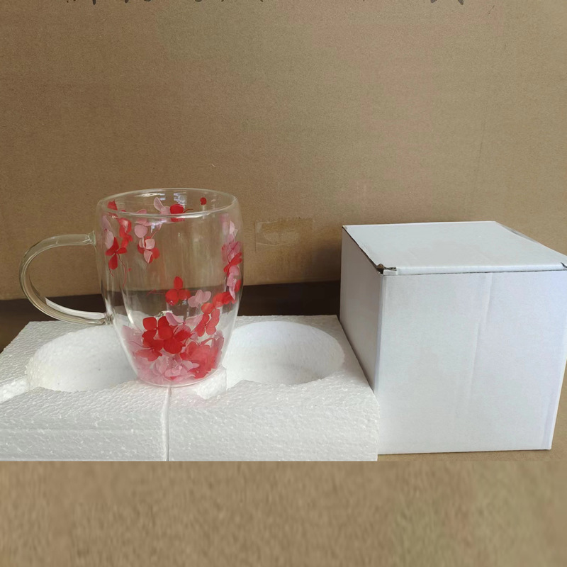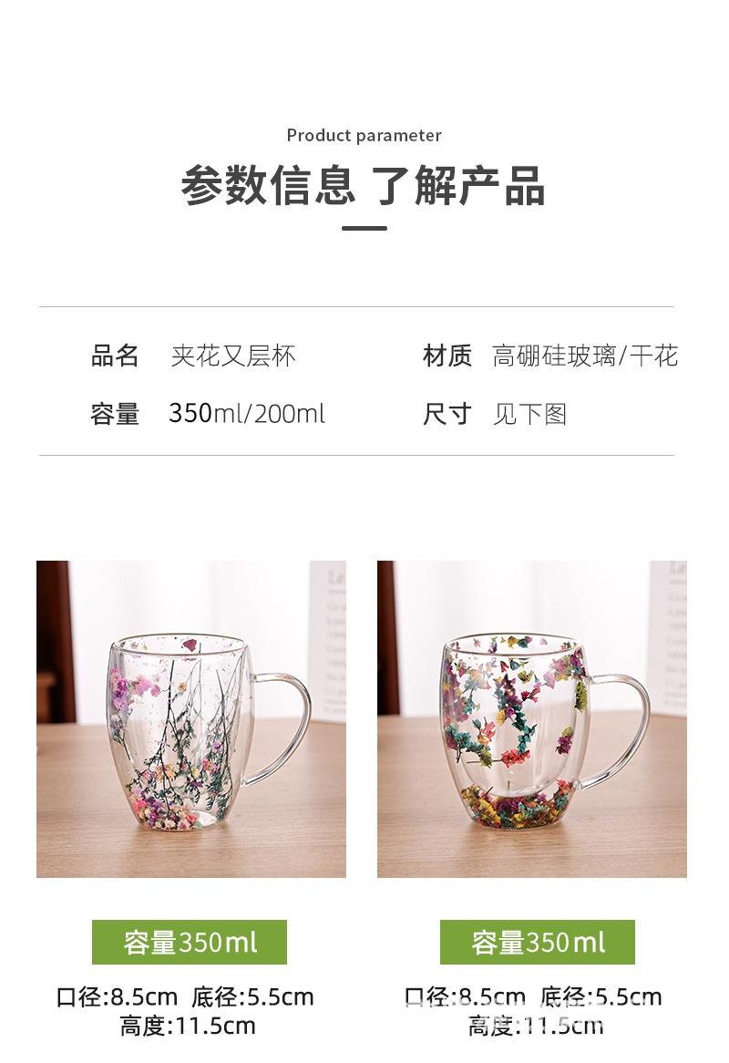 双层玻璃杯真花杯高颜值水杯家用带把手茶杯玻璃杯子批发耐高温