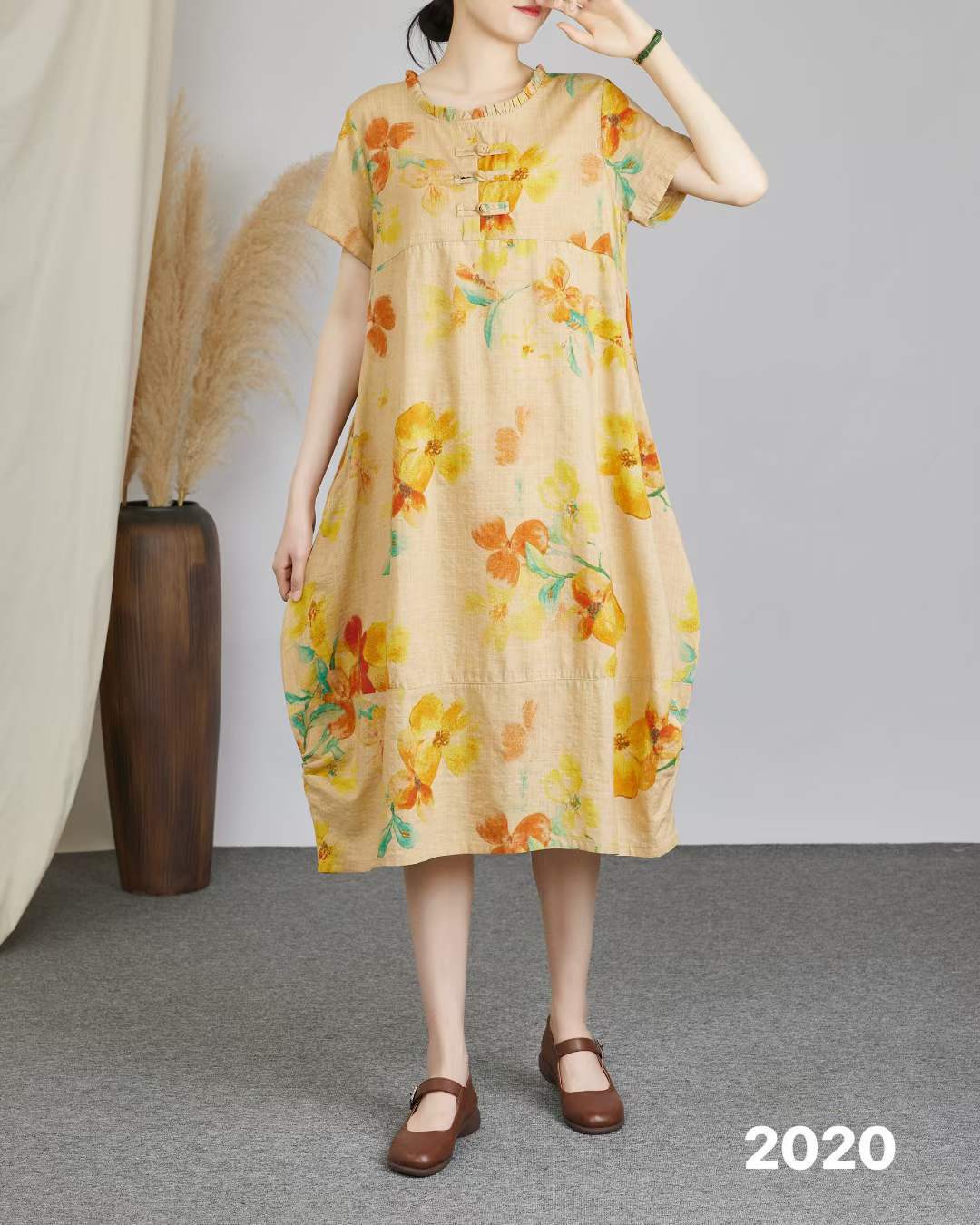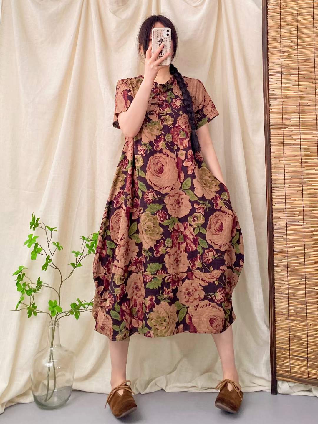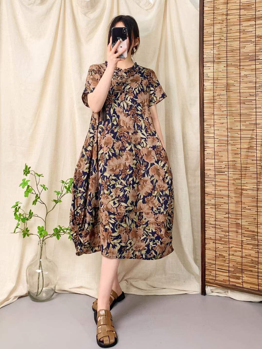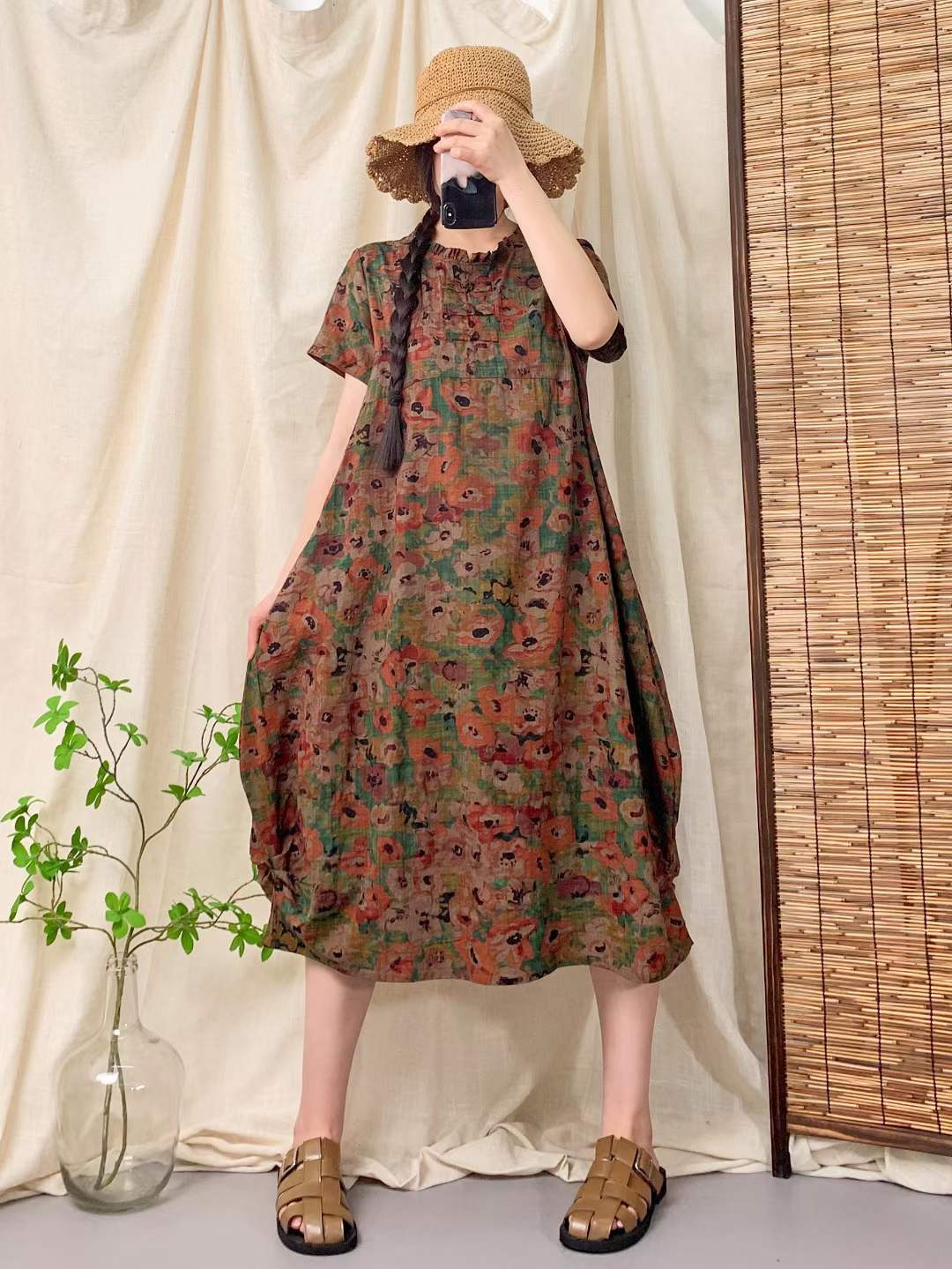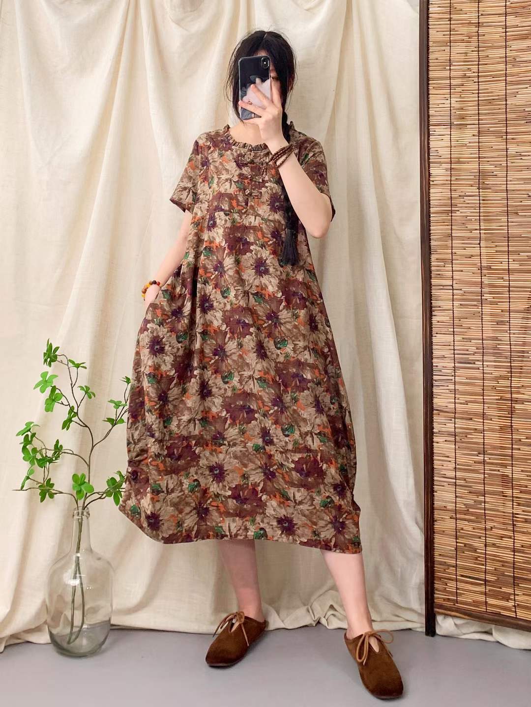 2023夏季碎花棉麻灯笼裙长款短袖花边领三盘扣宽松女式大码连衣裙