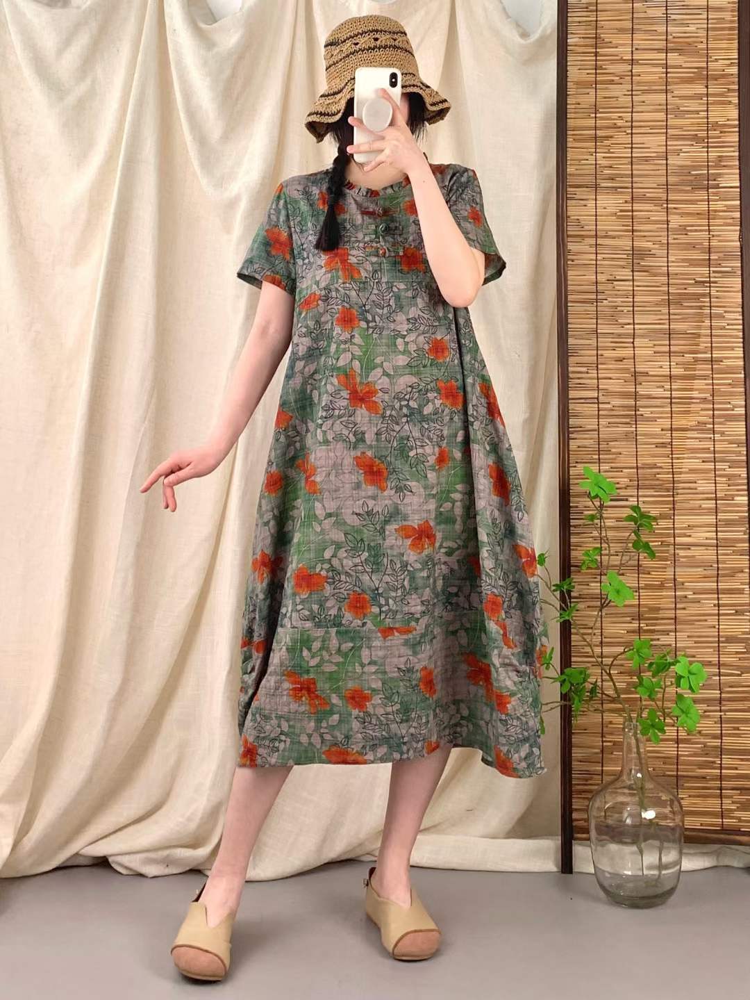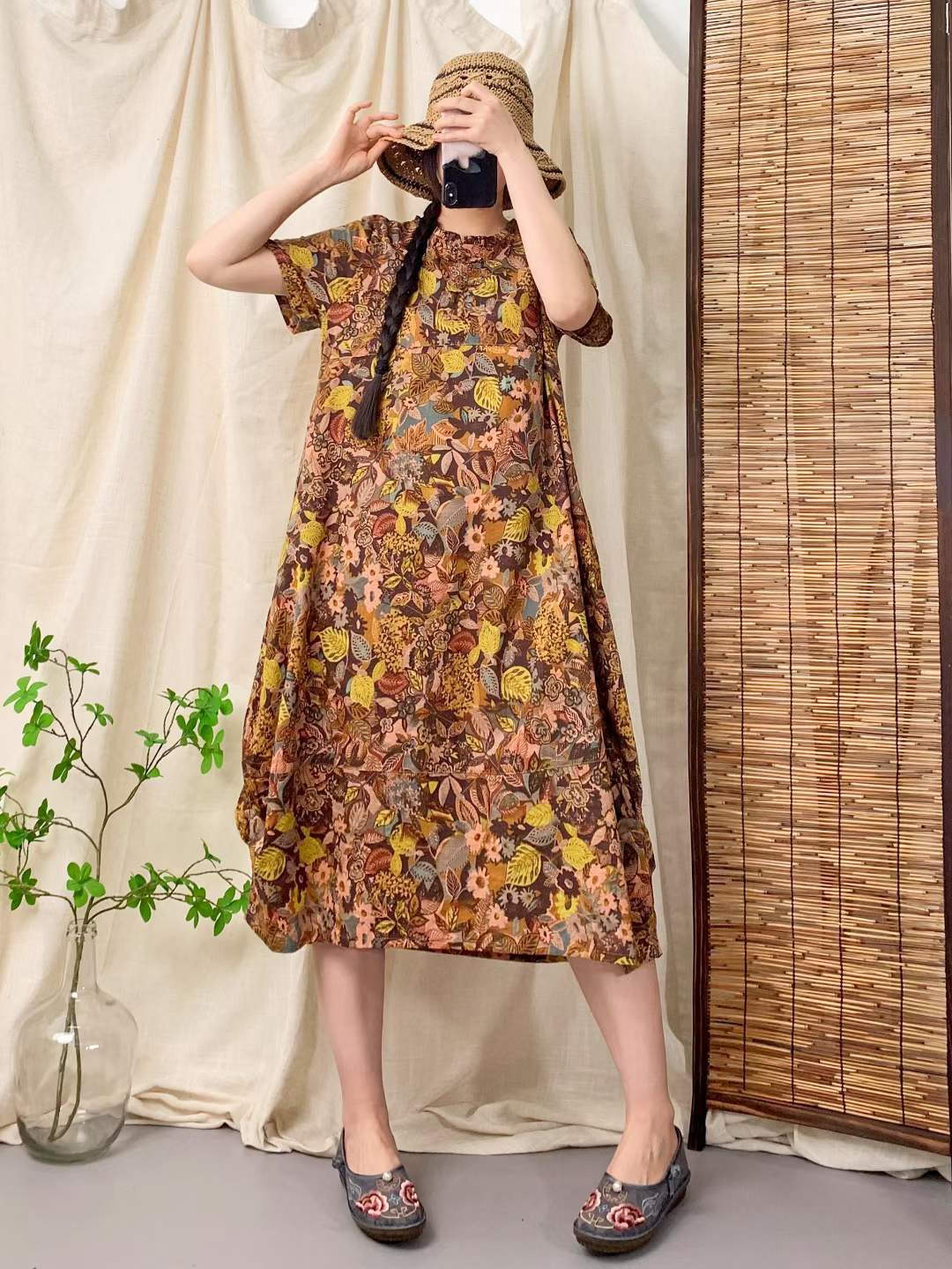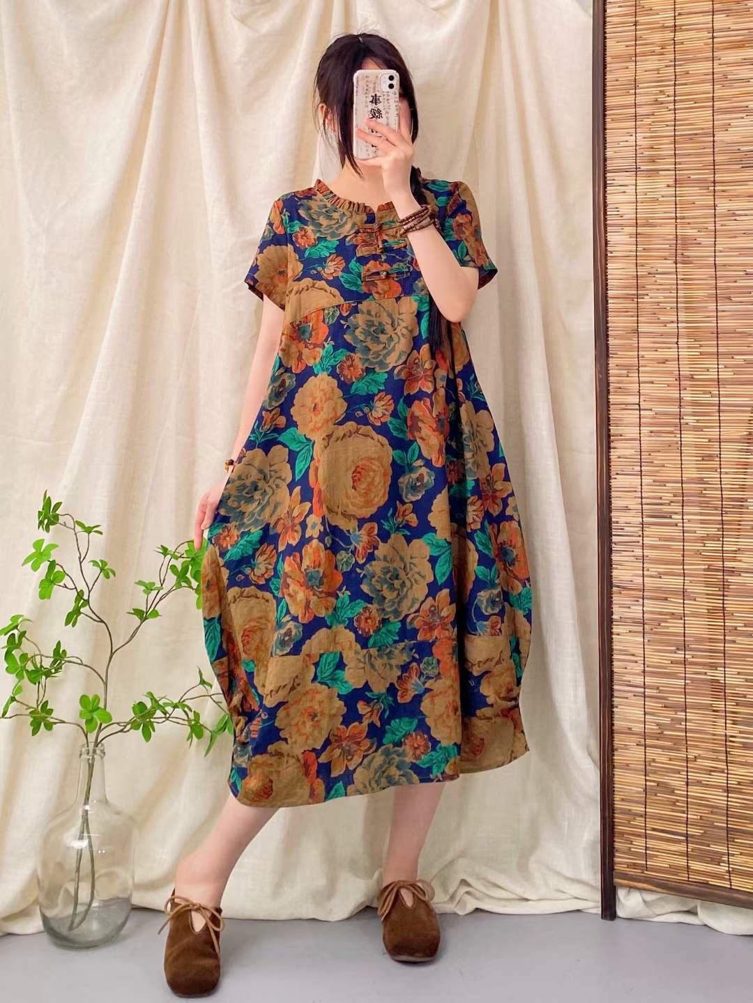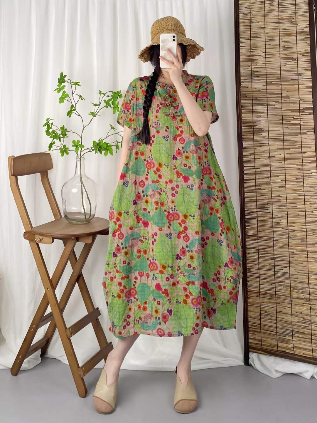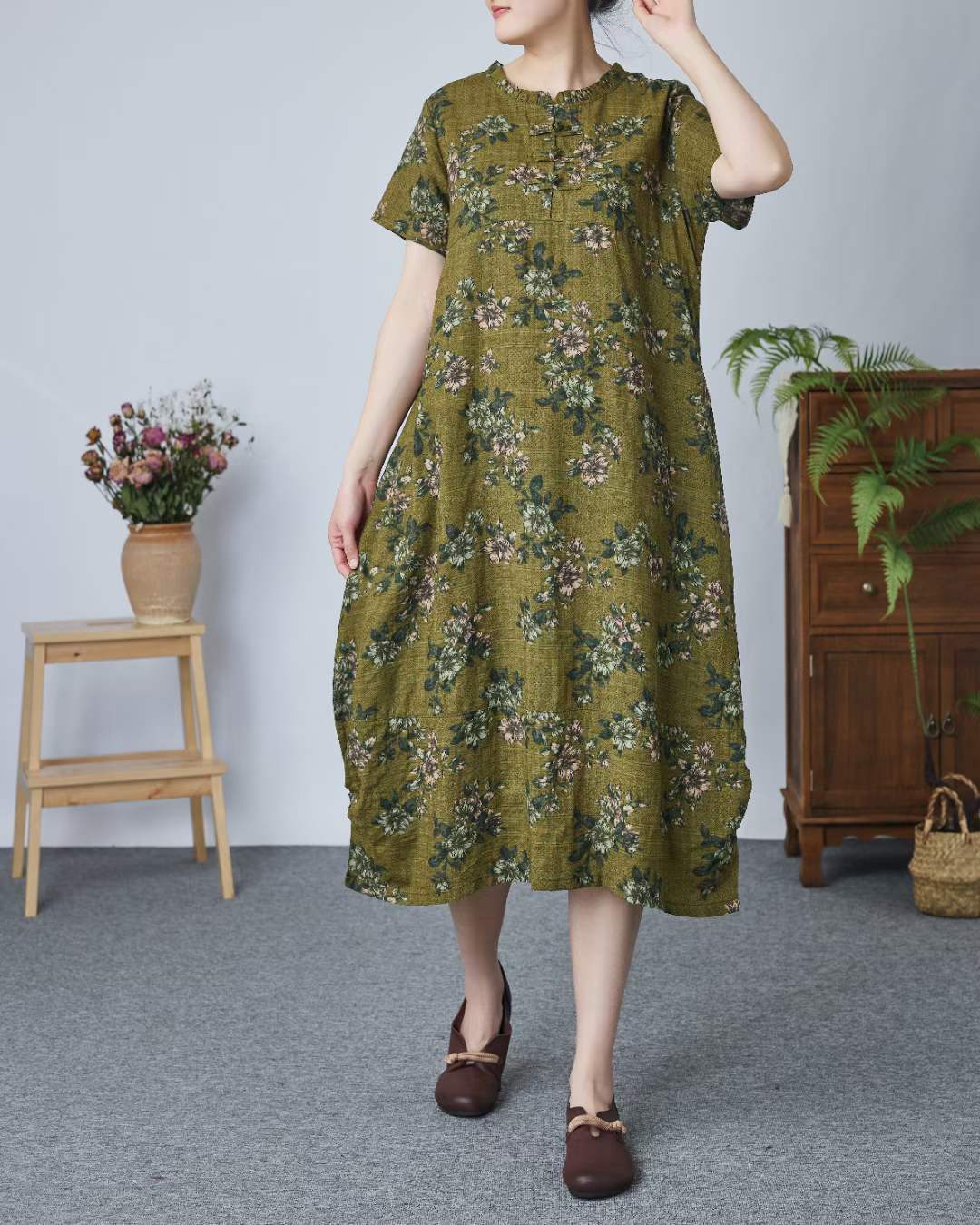 2023夏季碎花棉麻灯笼裙长款短袖花边领三盘扣宽松女式大码连衣裙