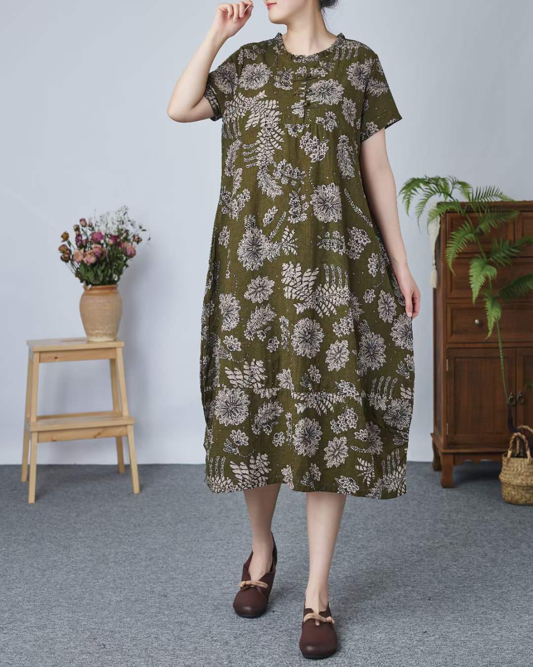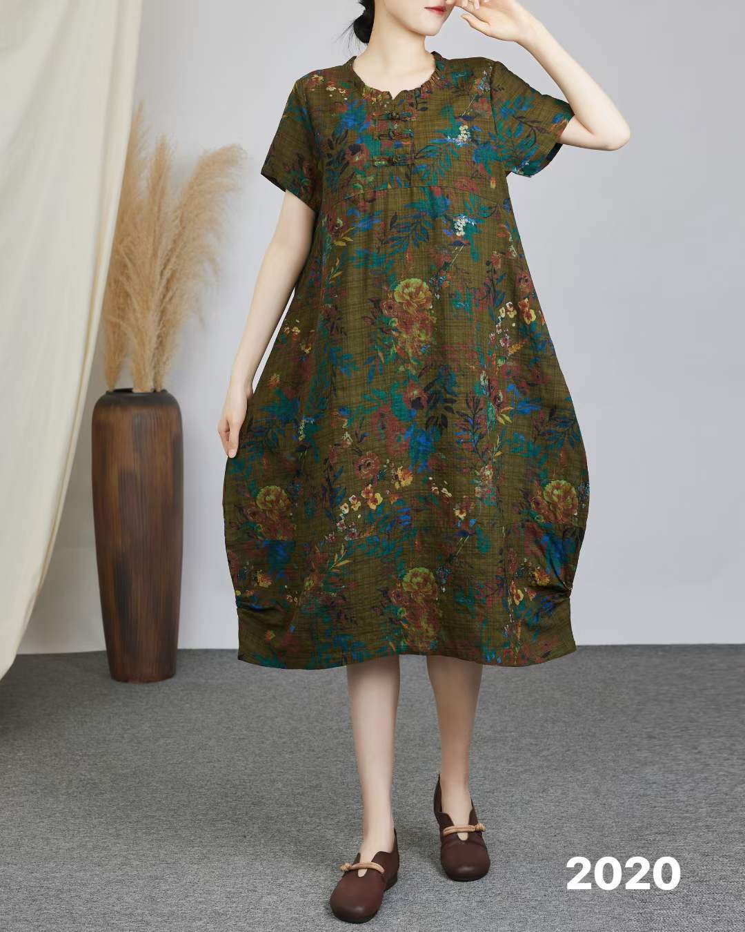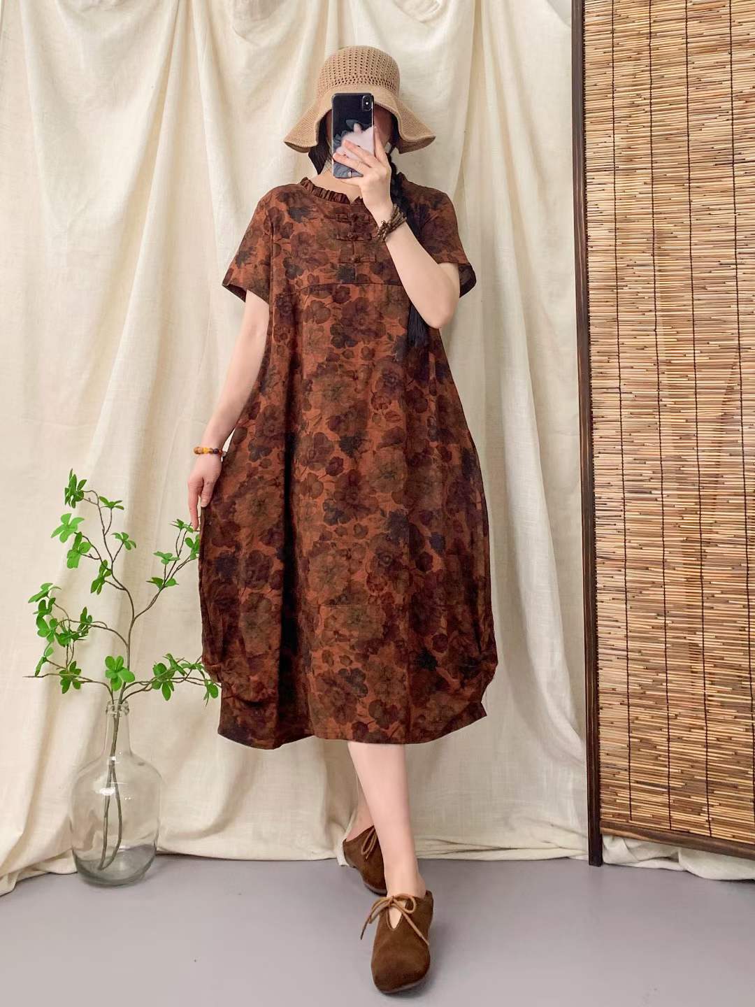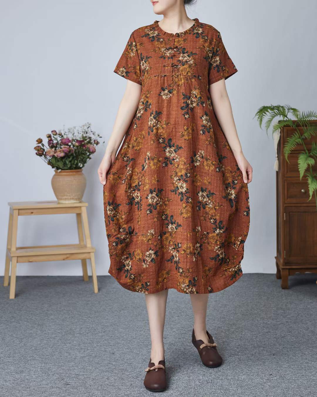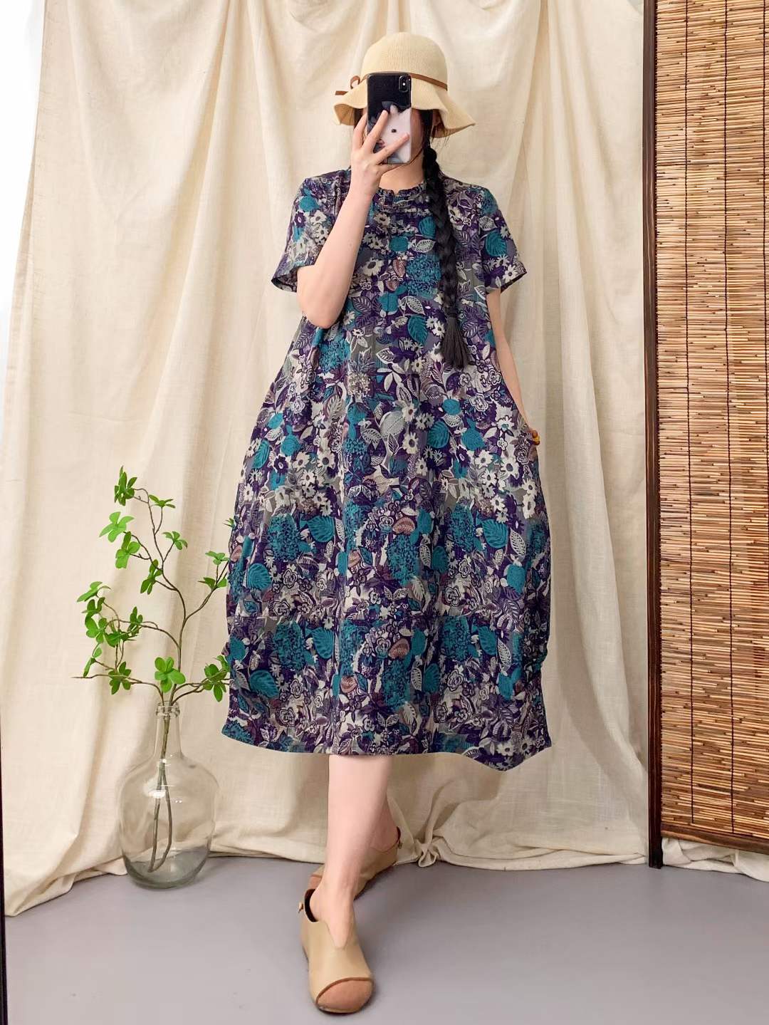 2023夏季碎花棉麻灯笼裙长款短袖花边领三盘扣宽松女式大码连衣裙