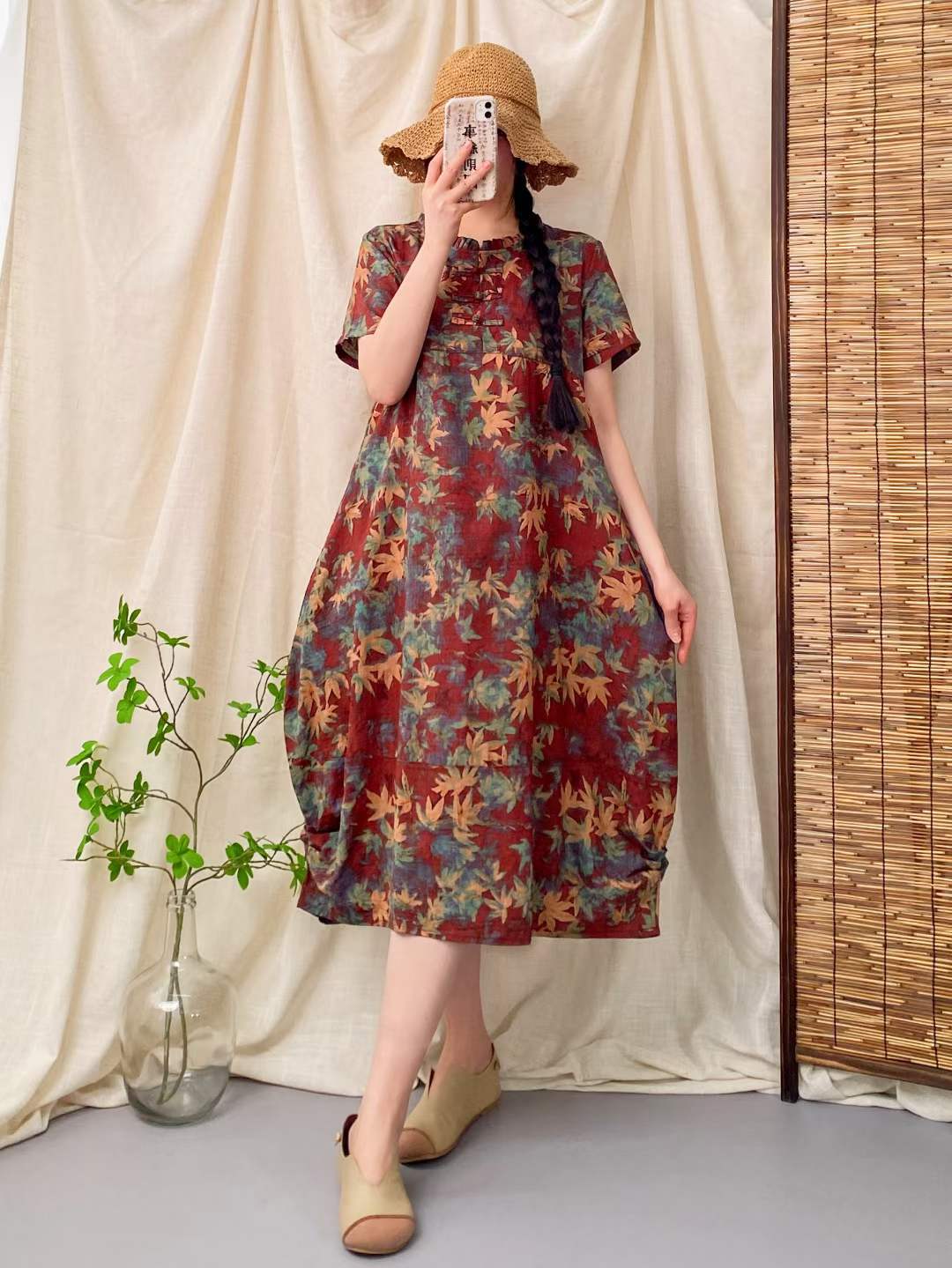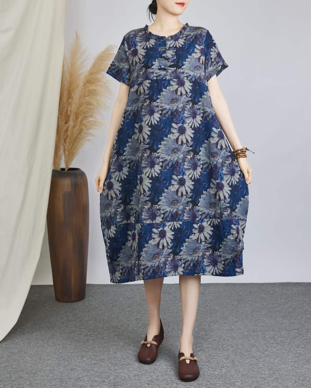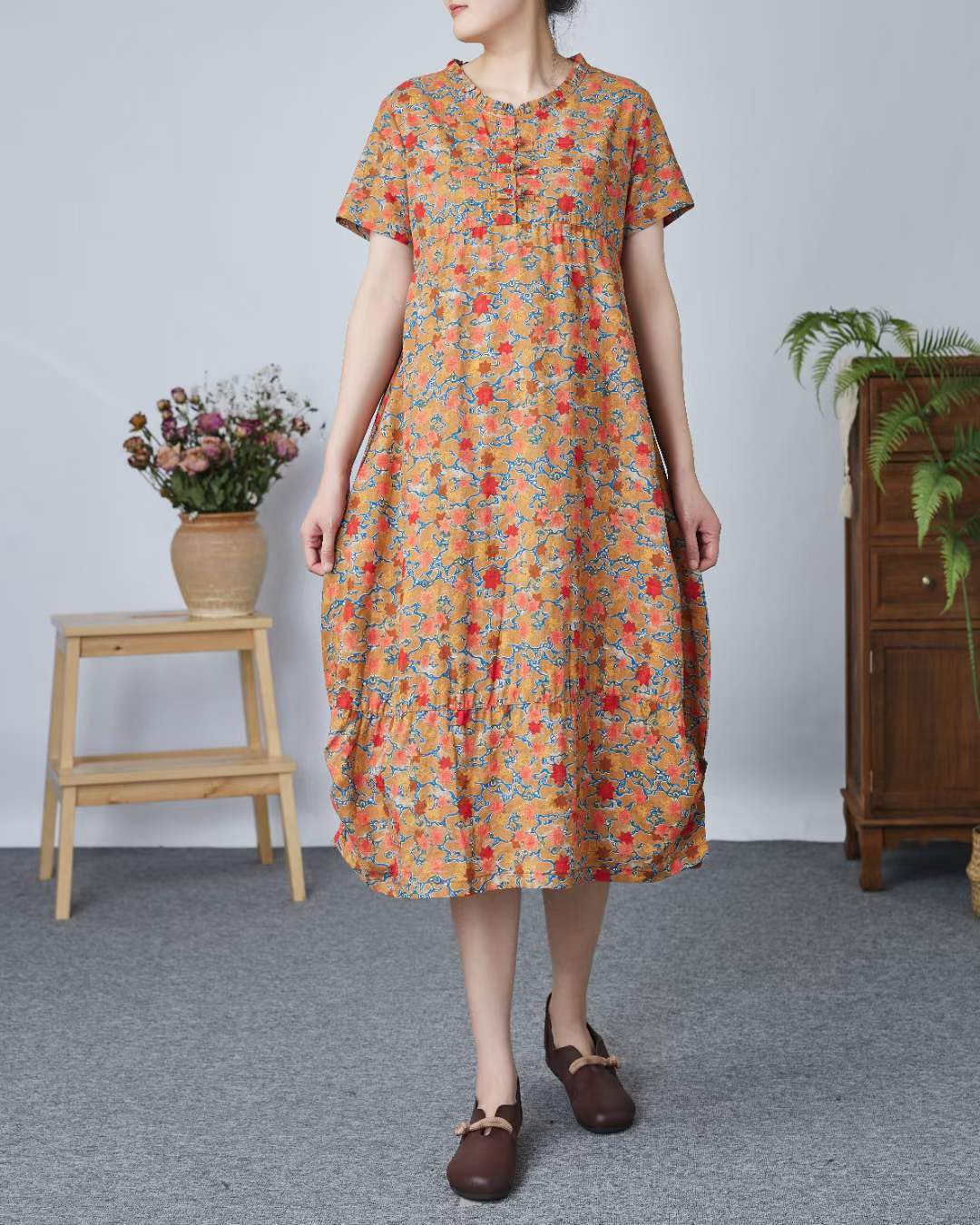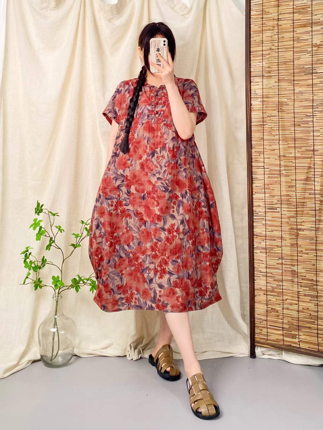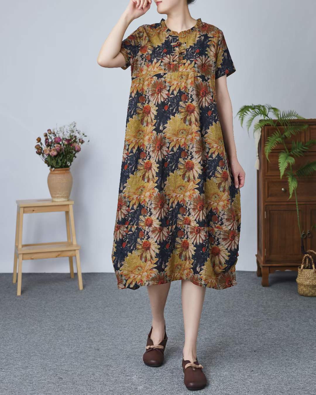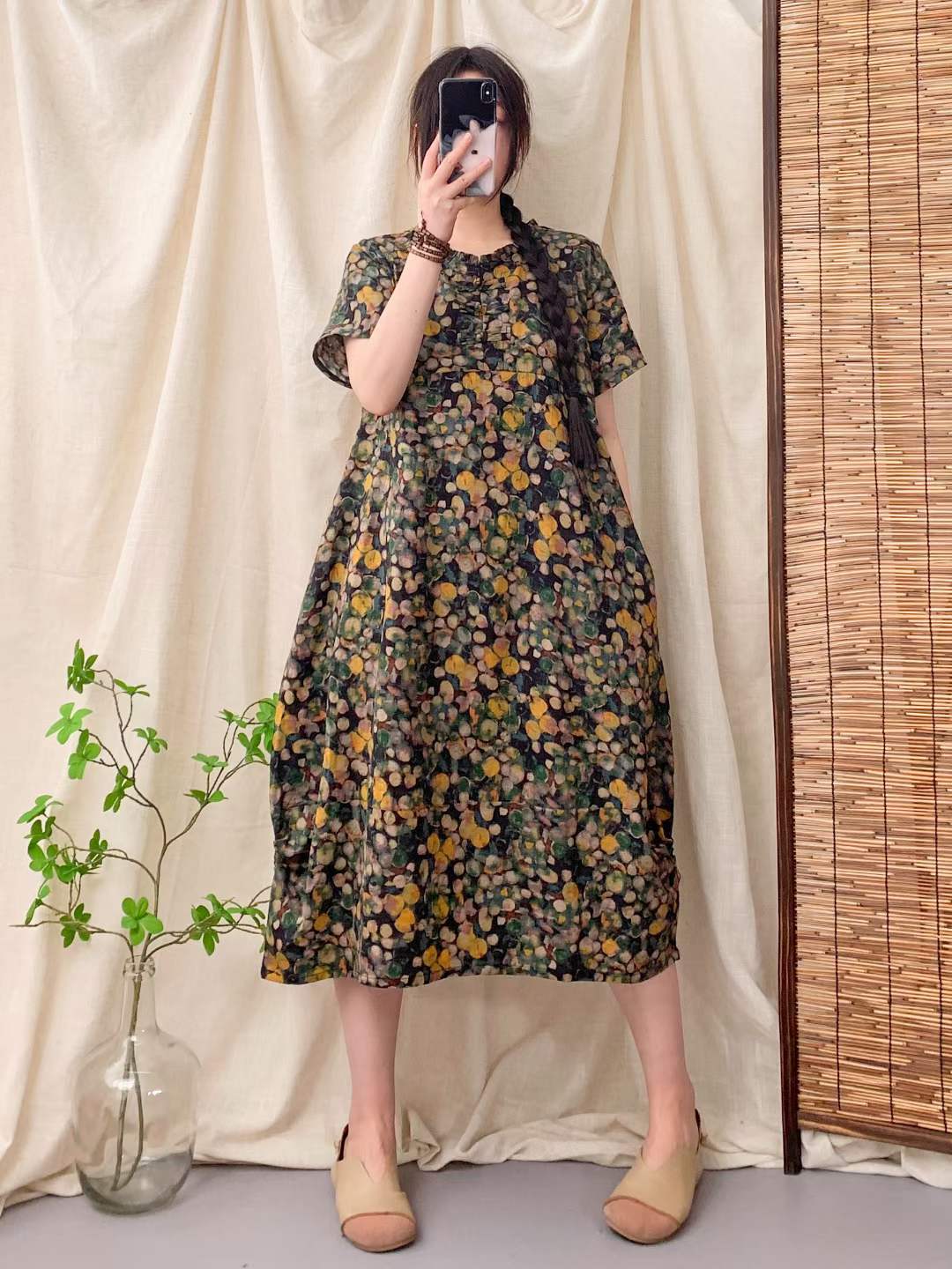 2023夏季碎花棉麻灯笼裙长款短袖花边领三盘扣宽松女式大码连衣裙