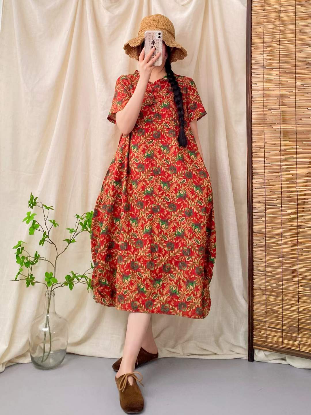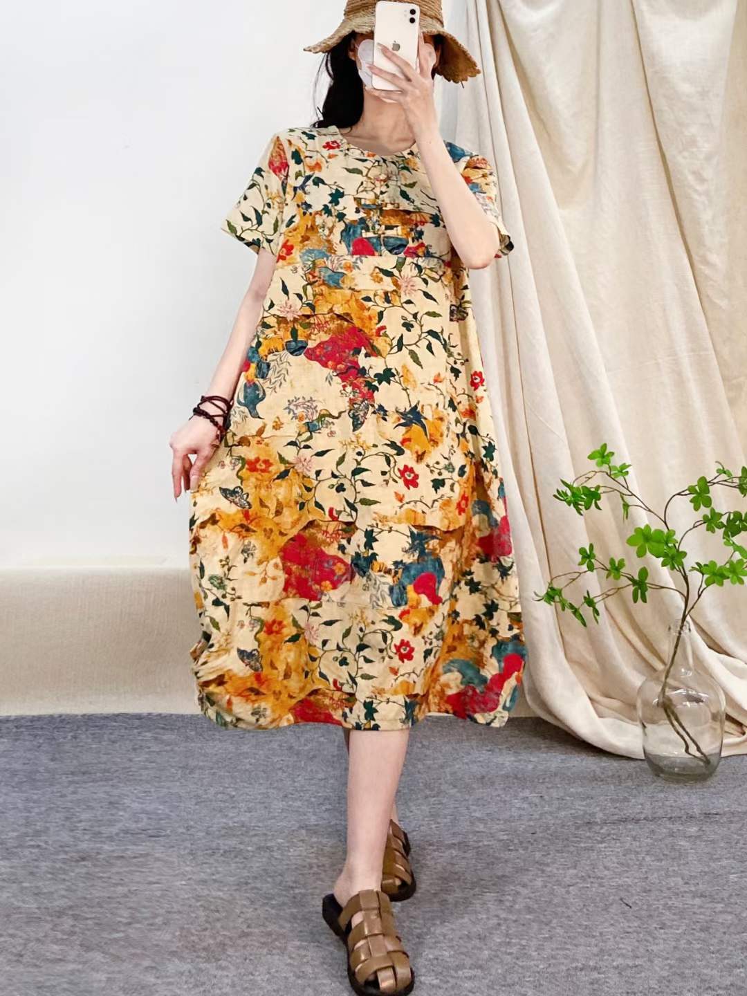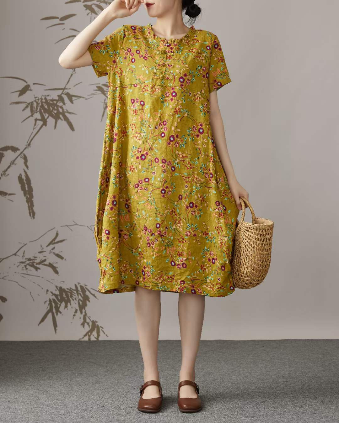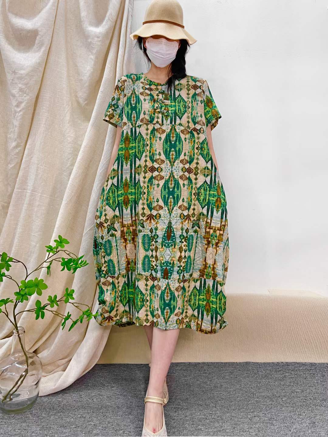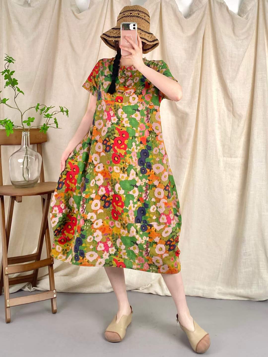 2023夏季碎花棉麻灯笼裙长款短袖花边领三盘扣宽松女式大码连衣裙
