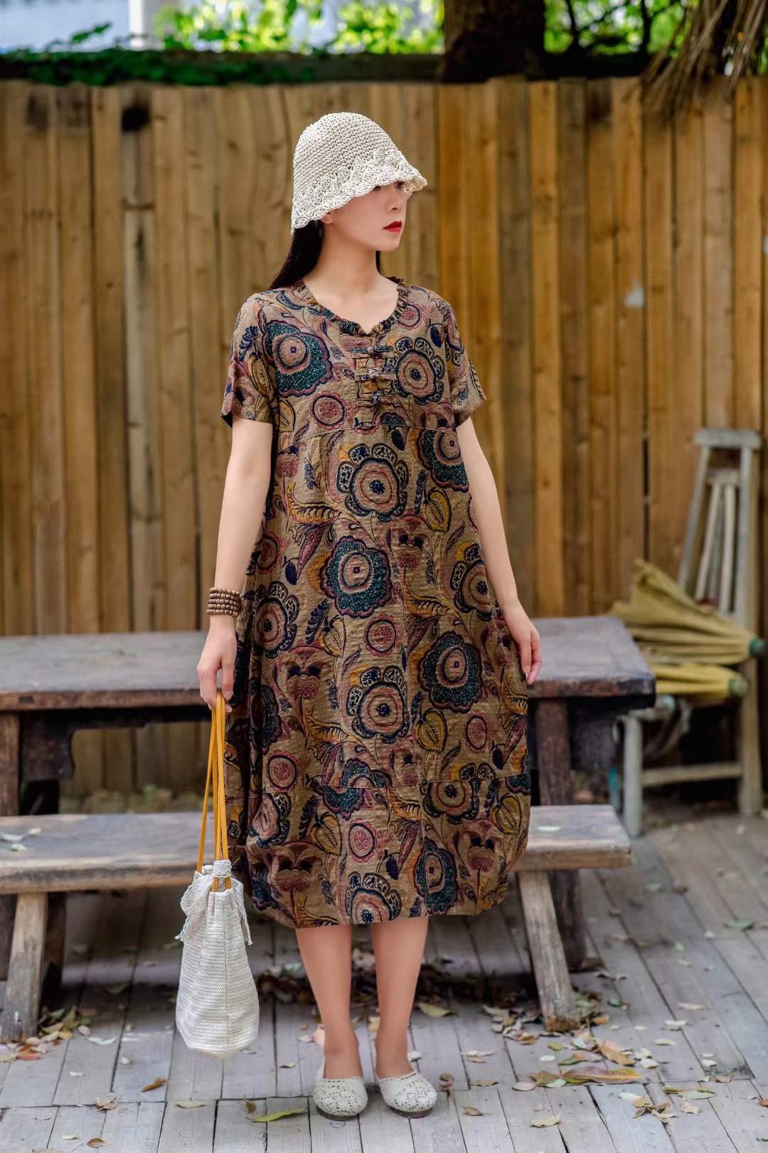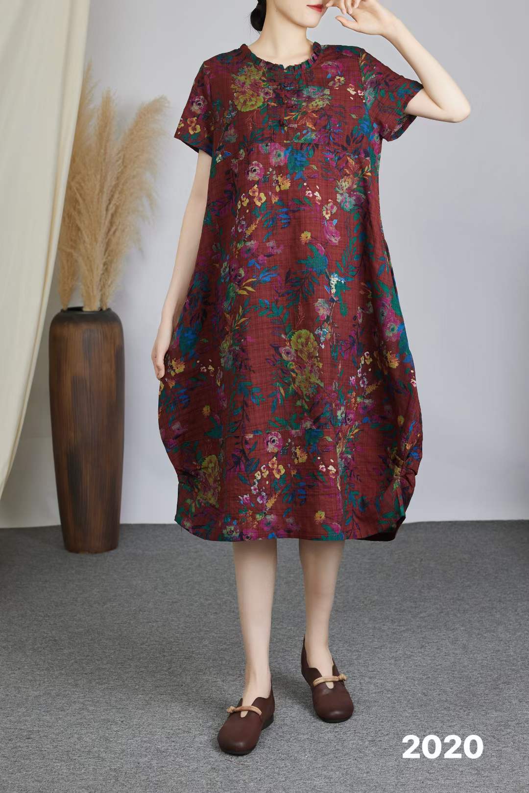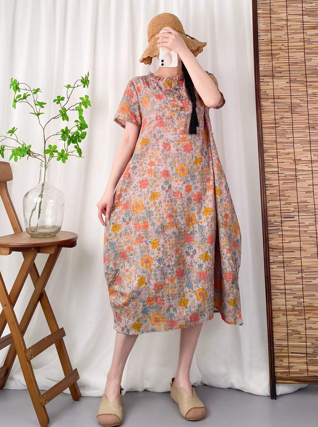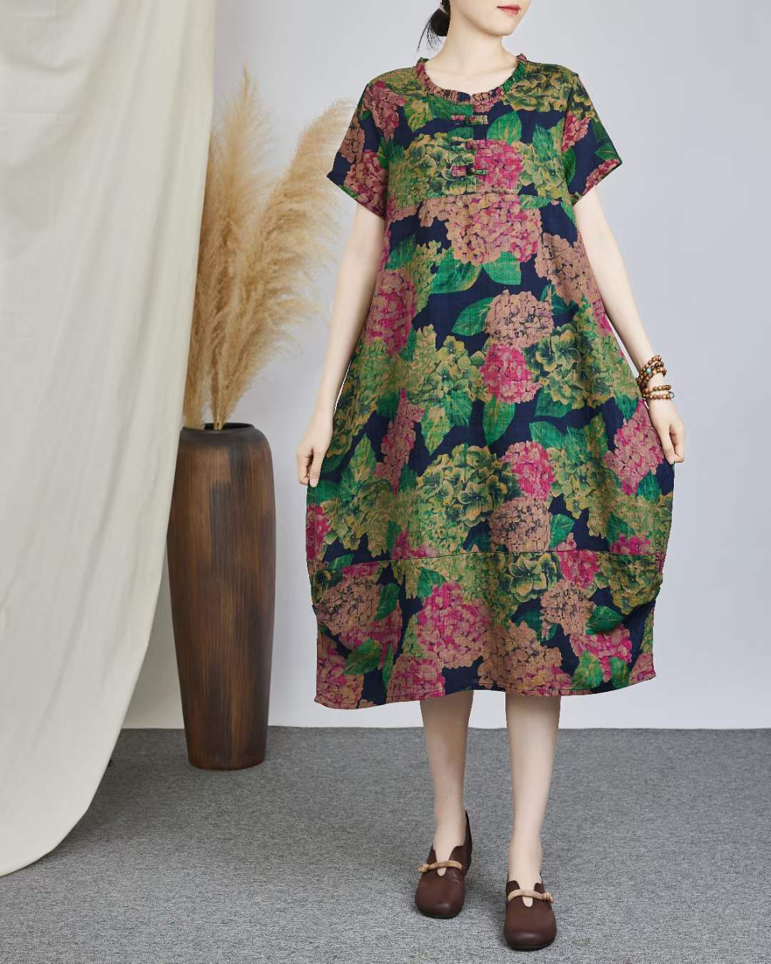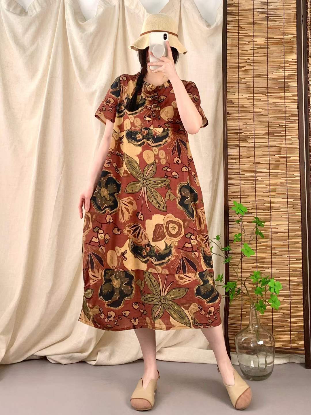 2023夏季碎花棉麻灯笼裙长款短袖花边领三盘扣宽松女式大码连衣裙