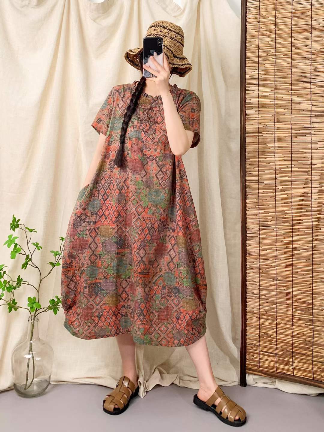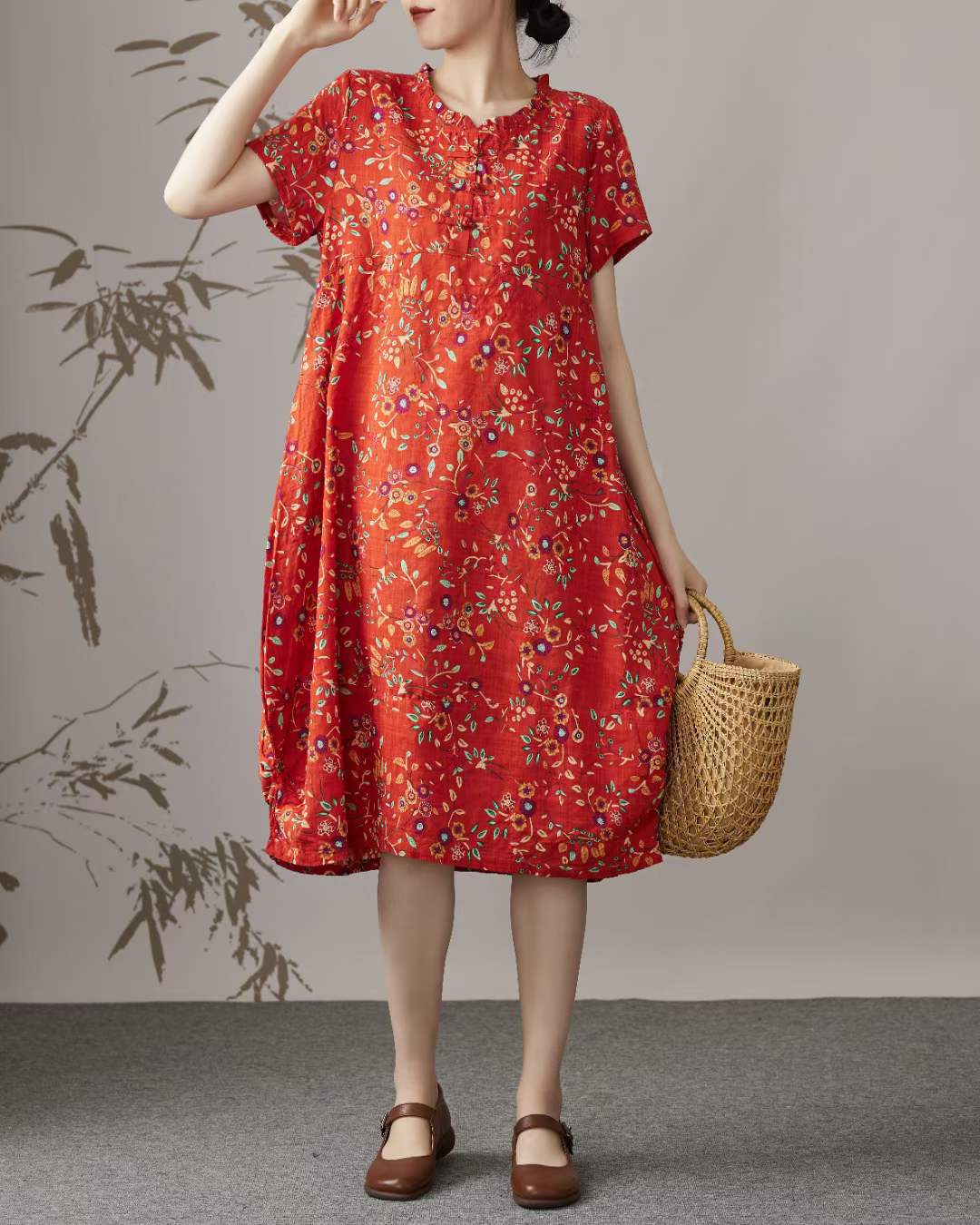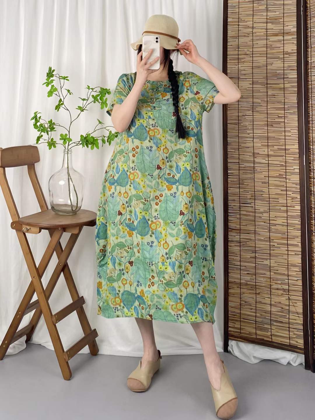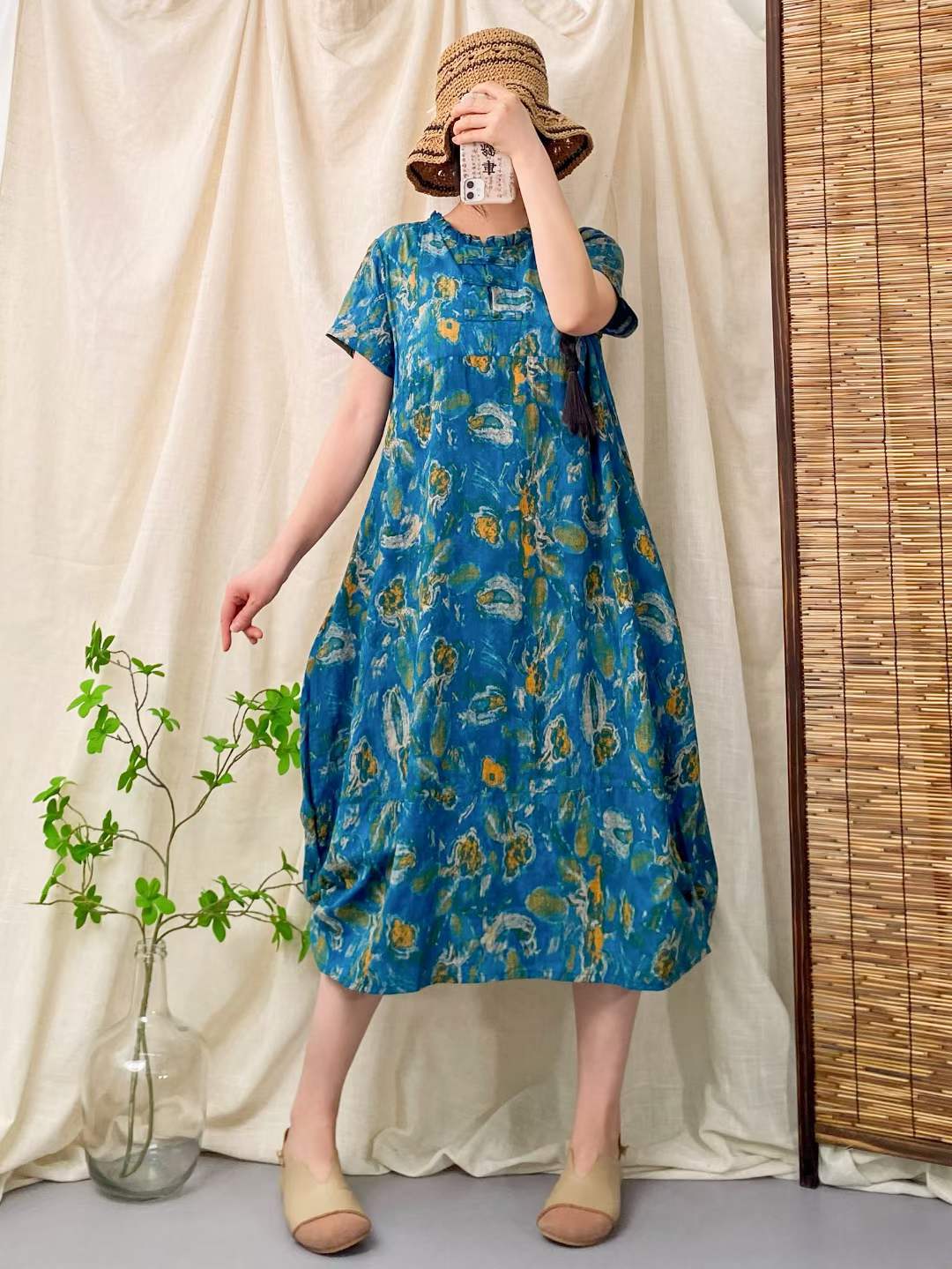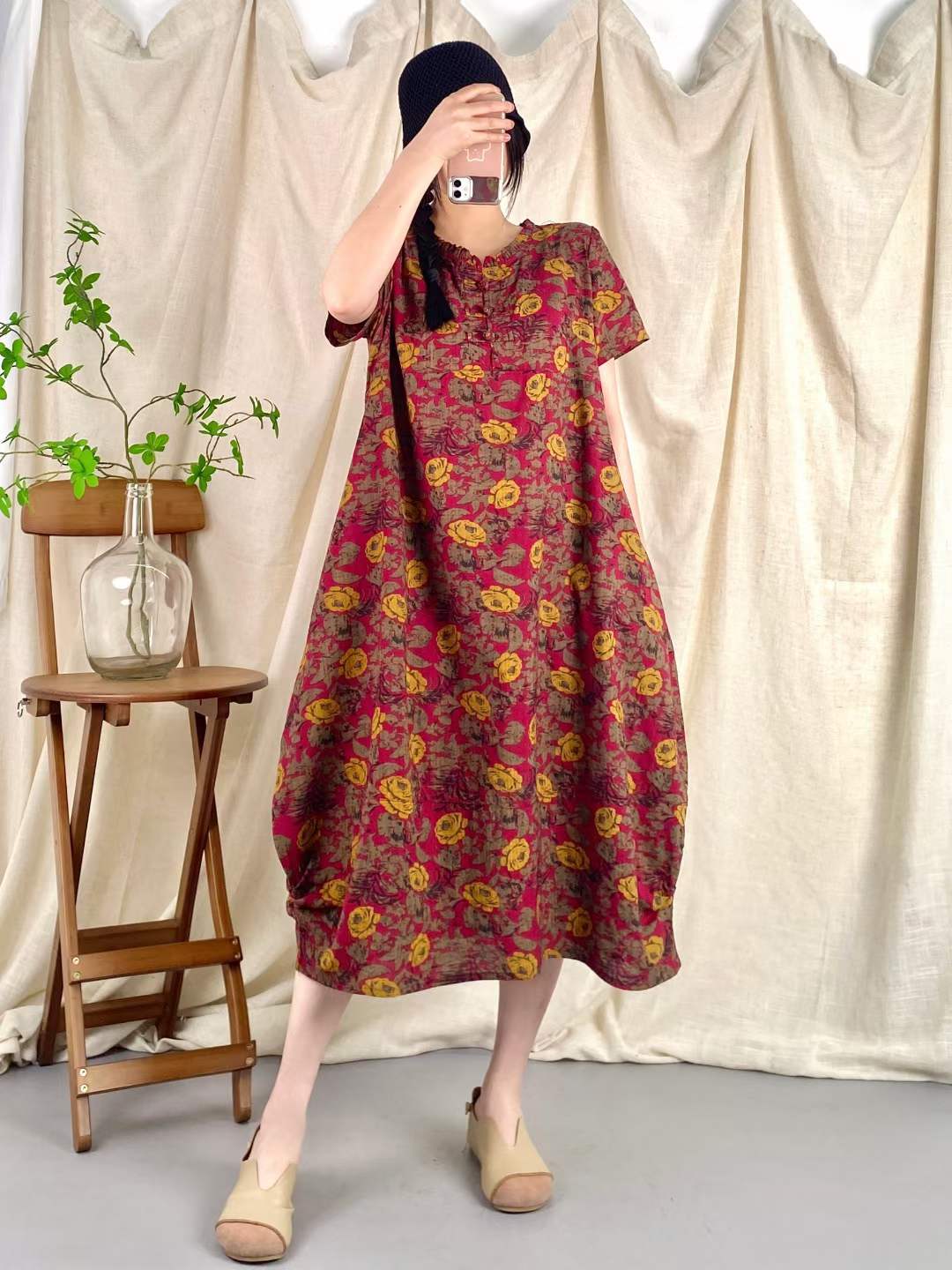 2023夏季碎花棉麻灯笼裙长款短袖花边领三盘扣宽松女式大码连衣裙