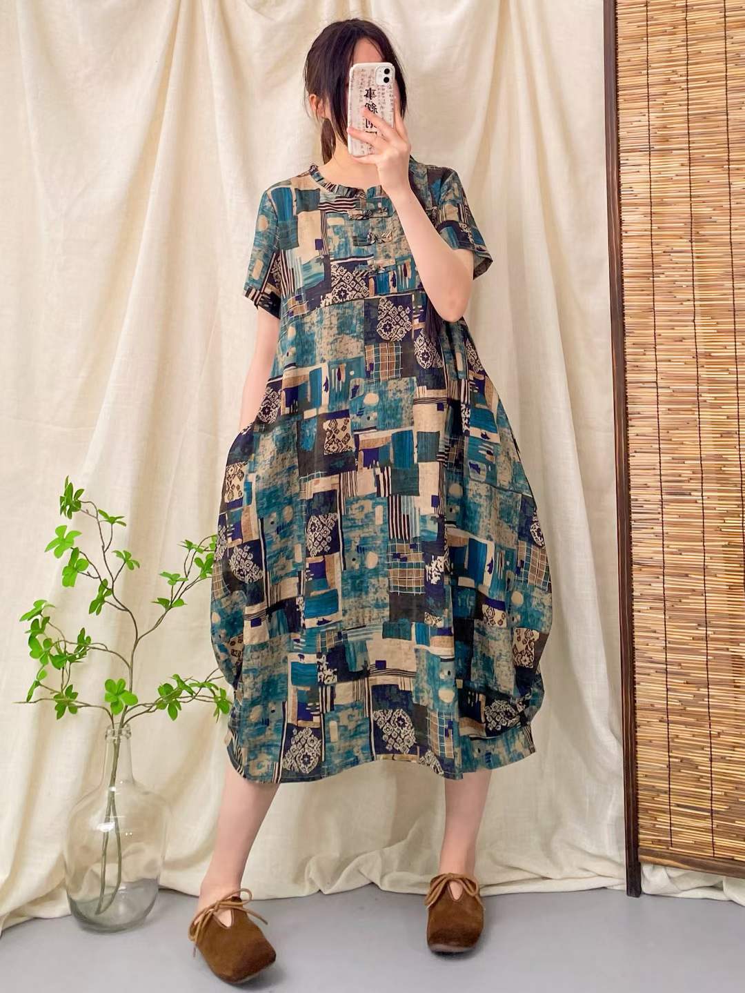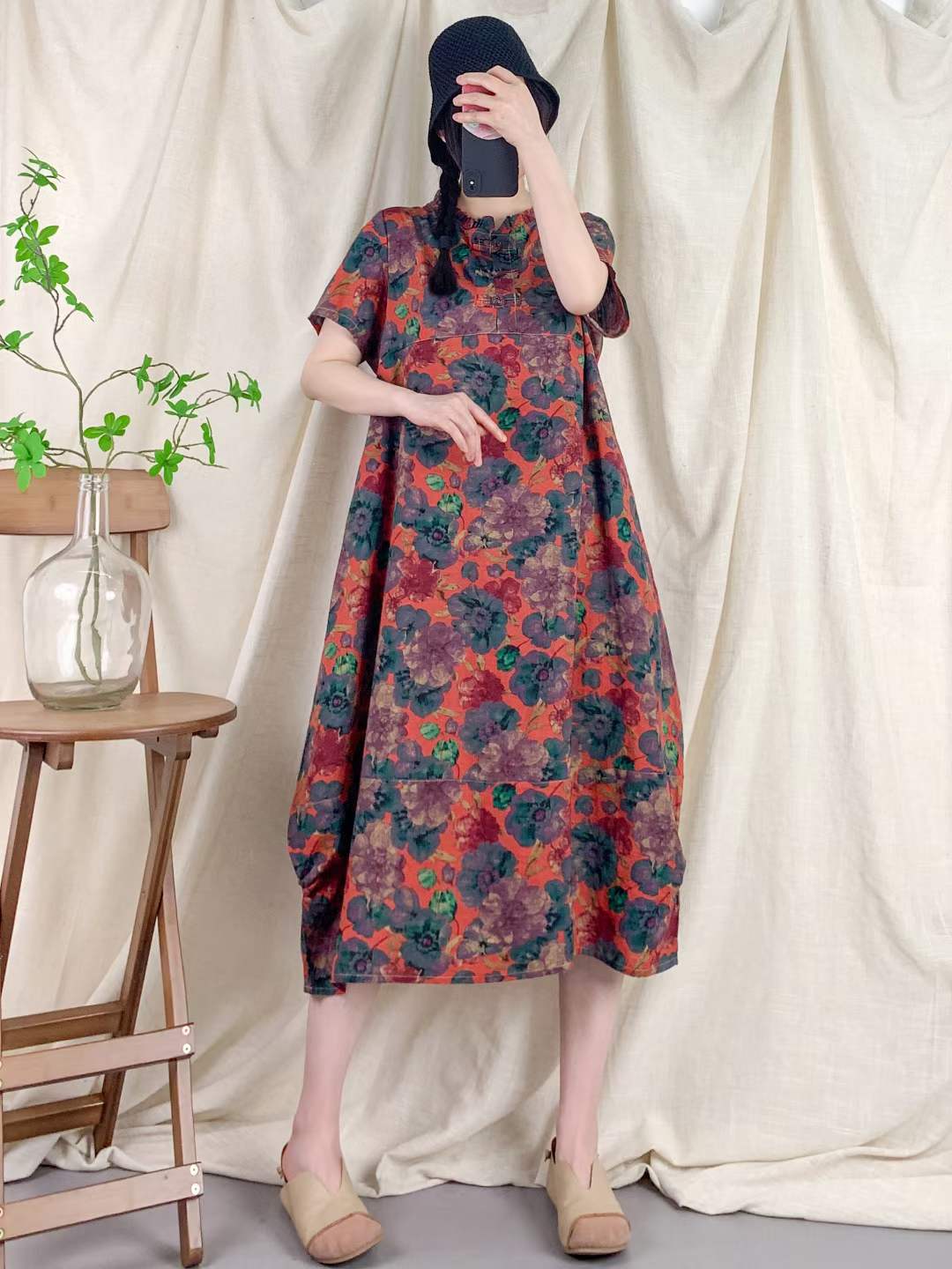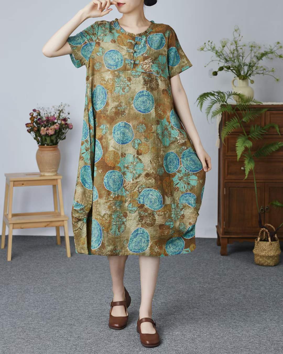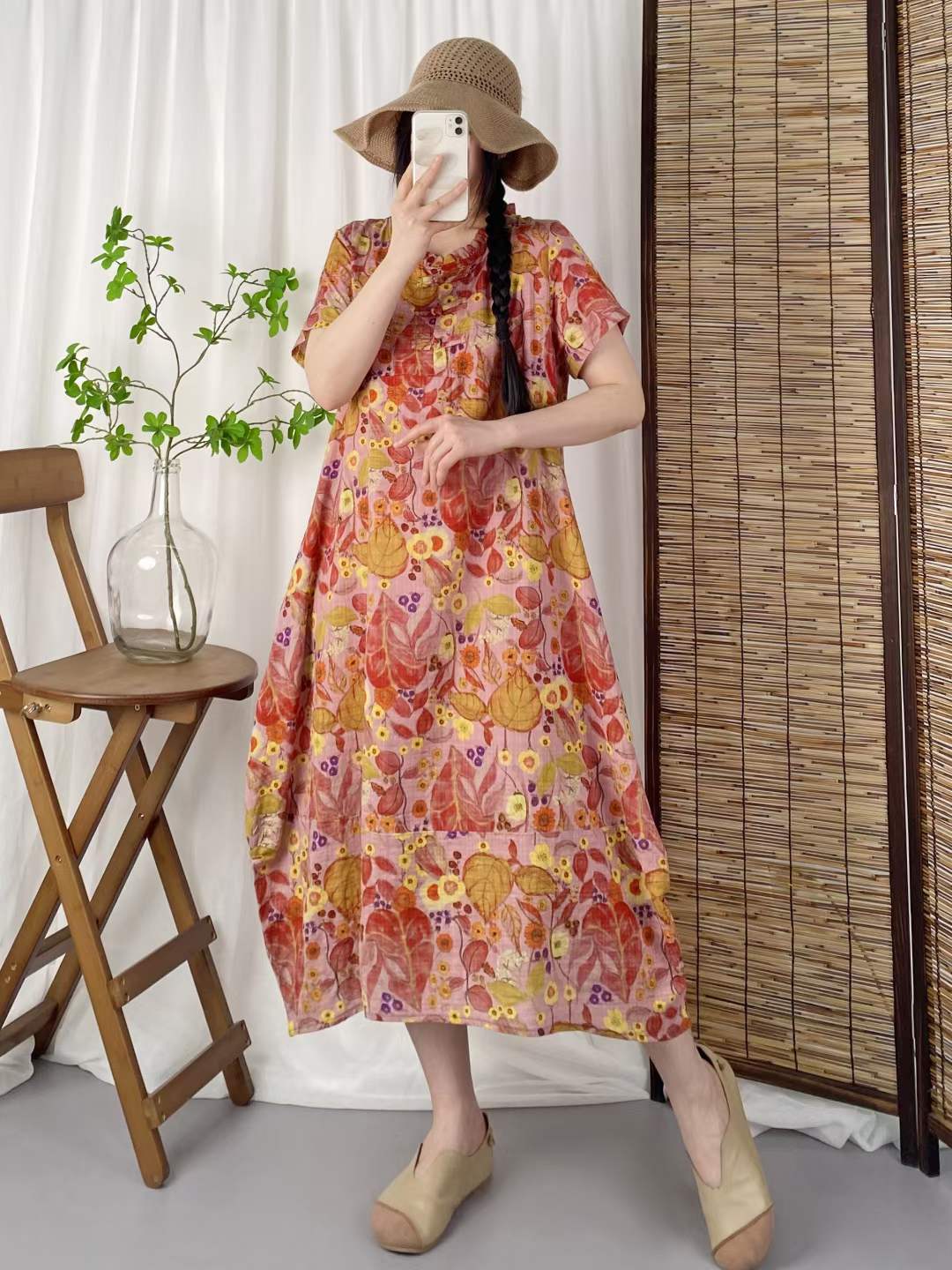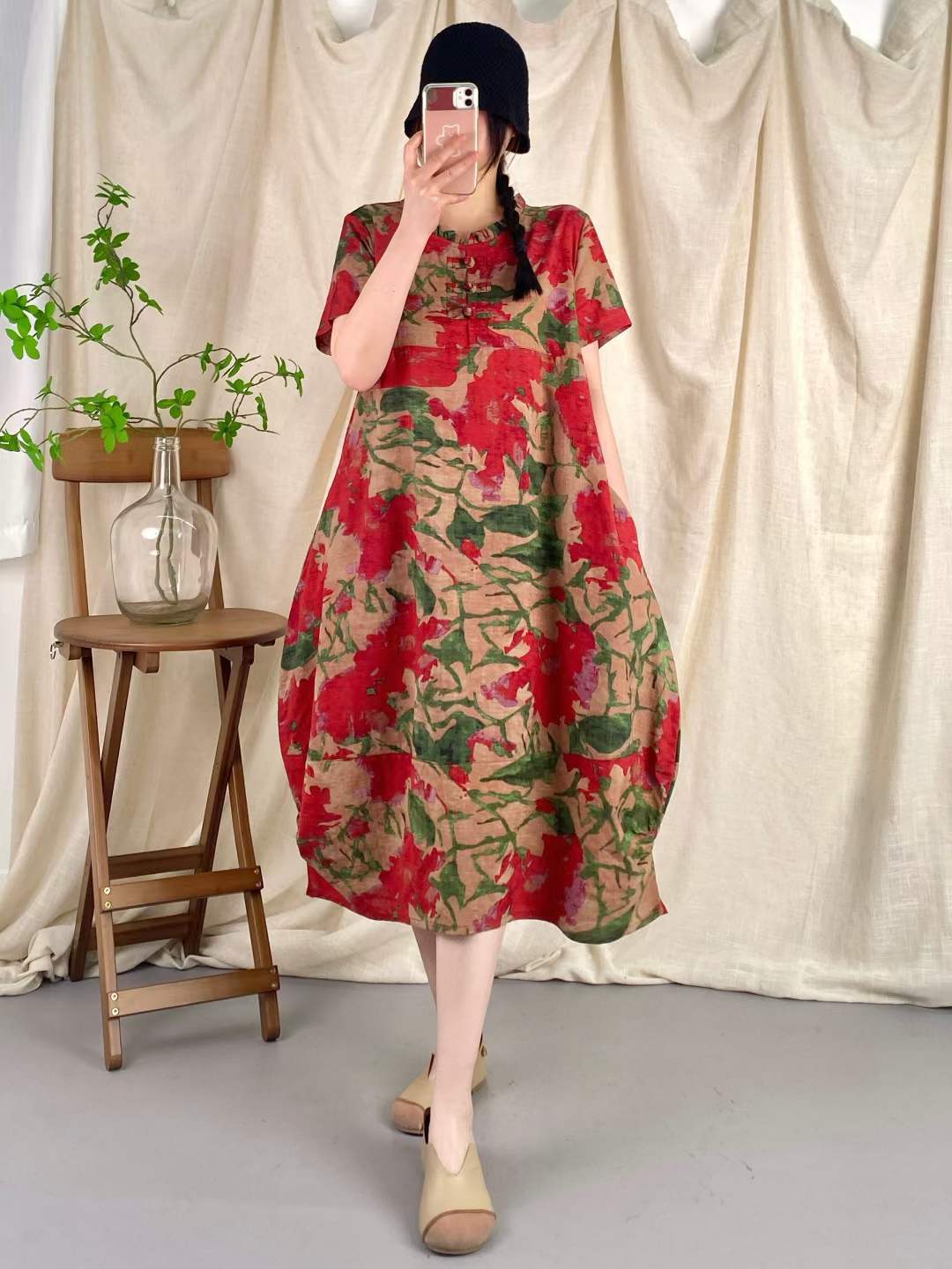2023夏季碎花棉麻灯笼裙长款短袖花边领三盘扣宽松女式大码连衣裙
