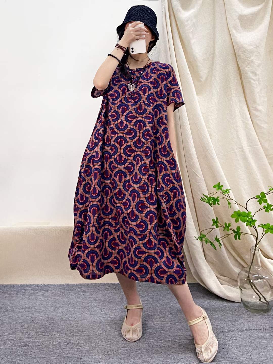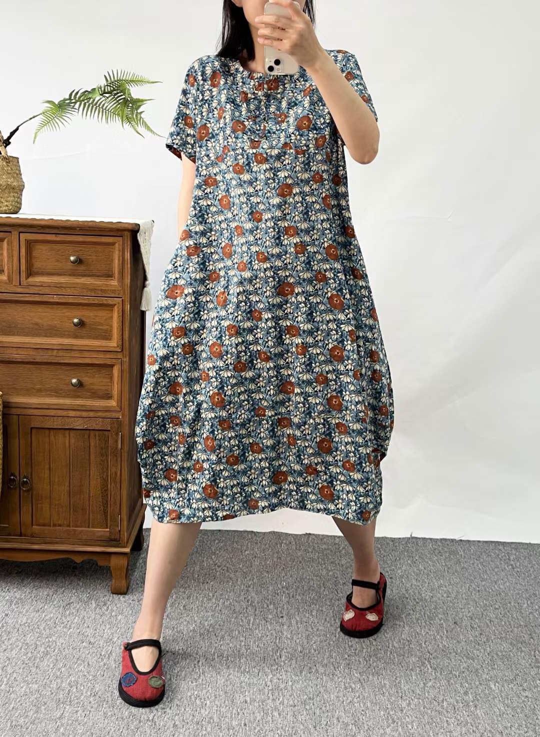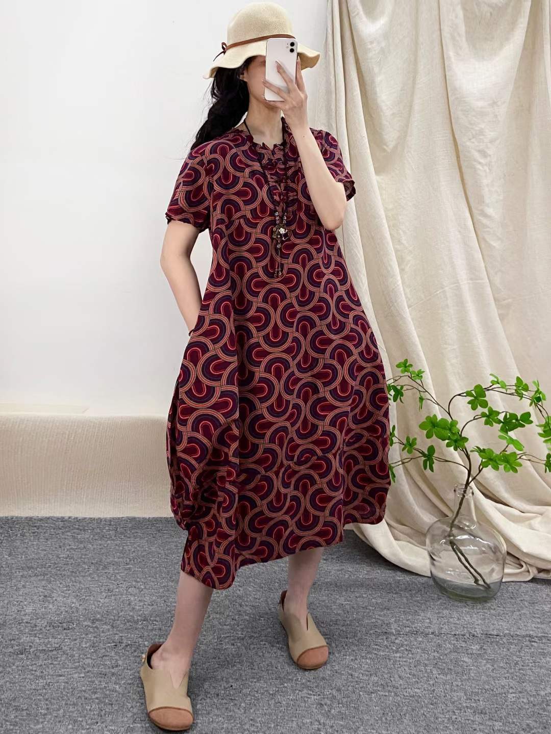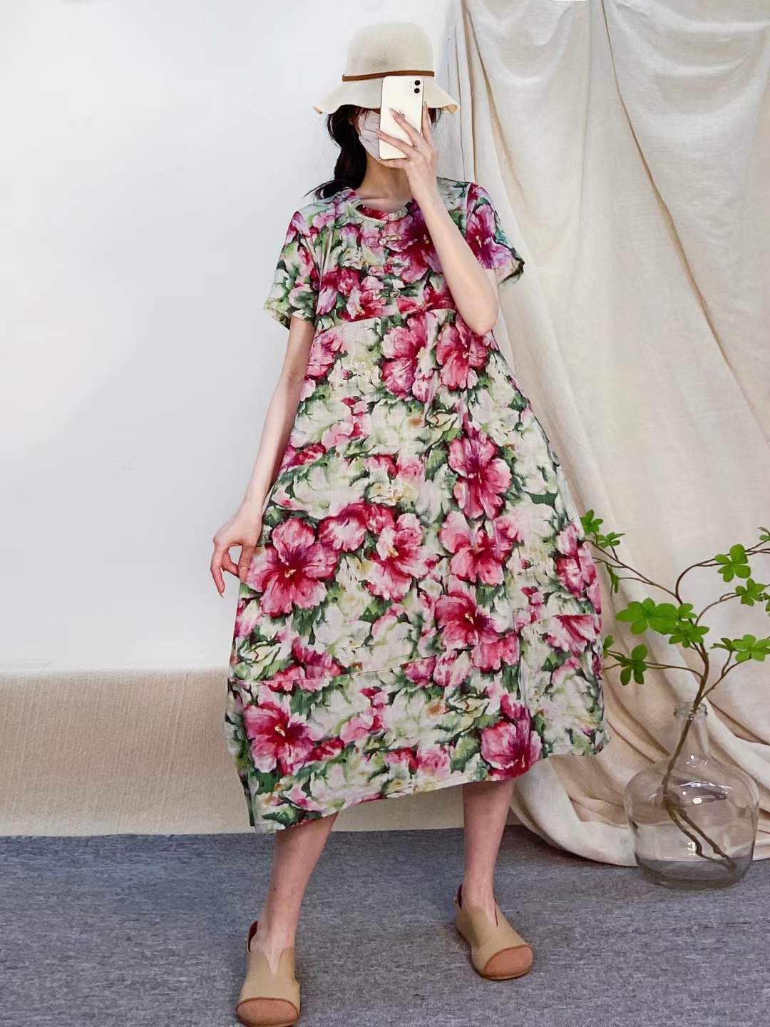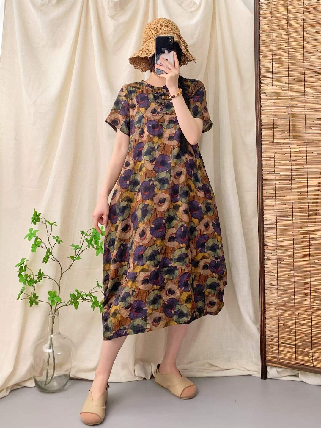 2023夏季碎花棉麻灯笼裙长款短袖花边领三盘扣宽松女式大码连衣裙
