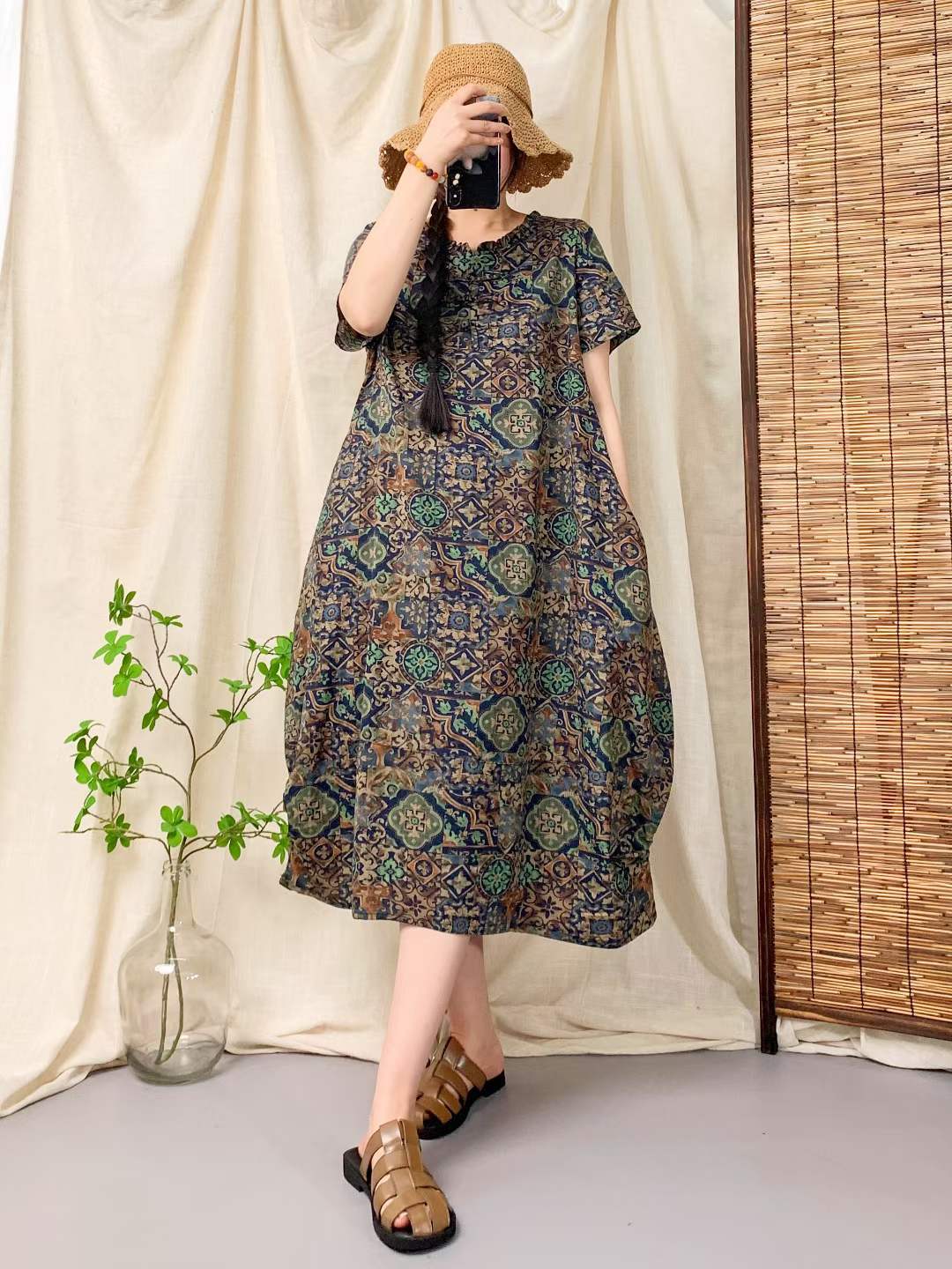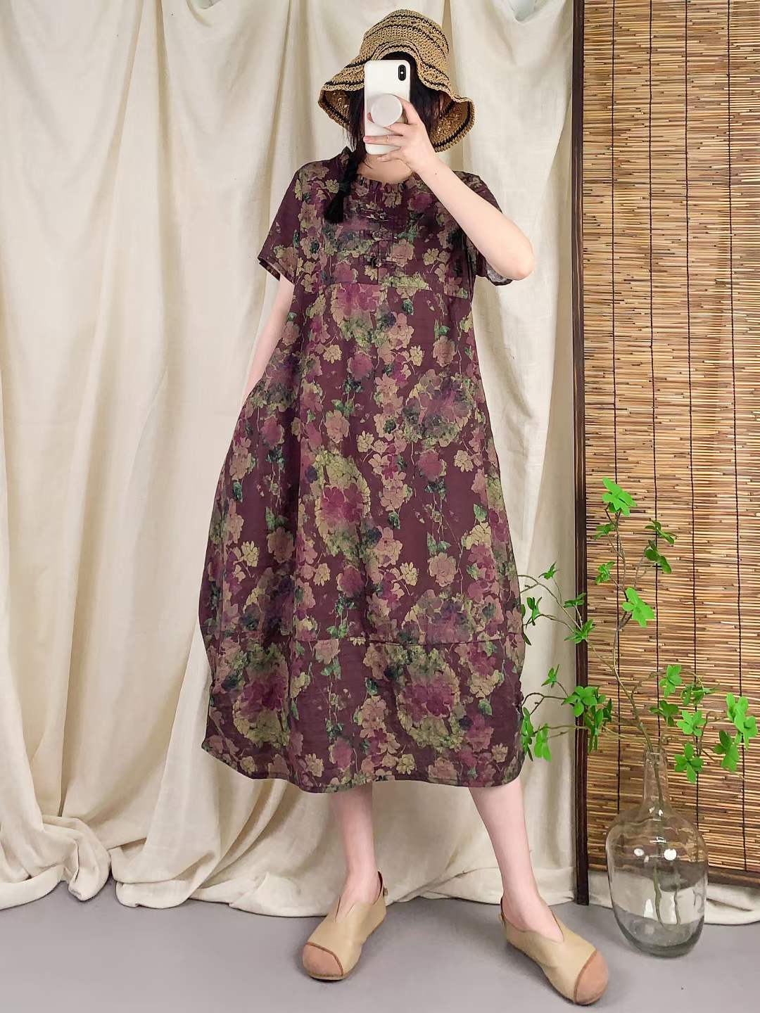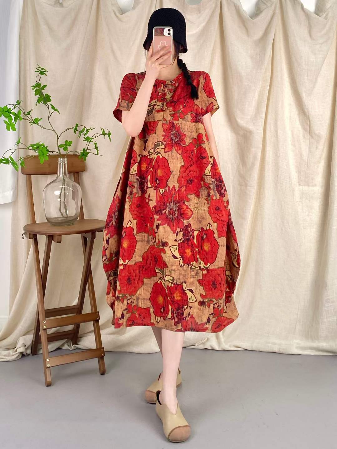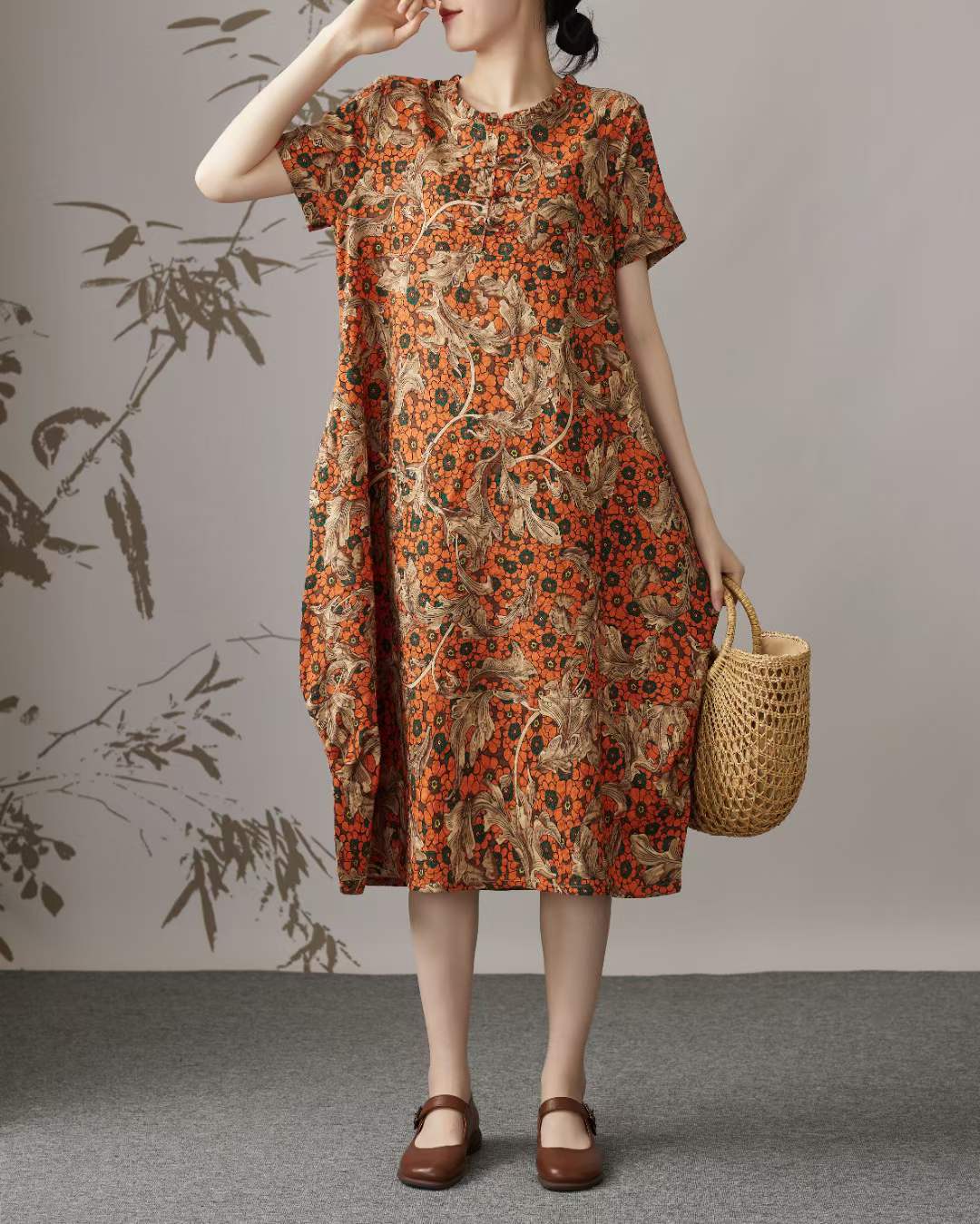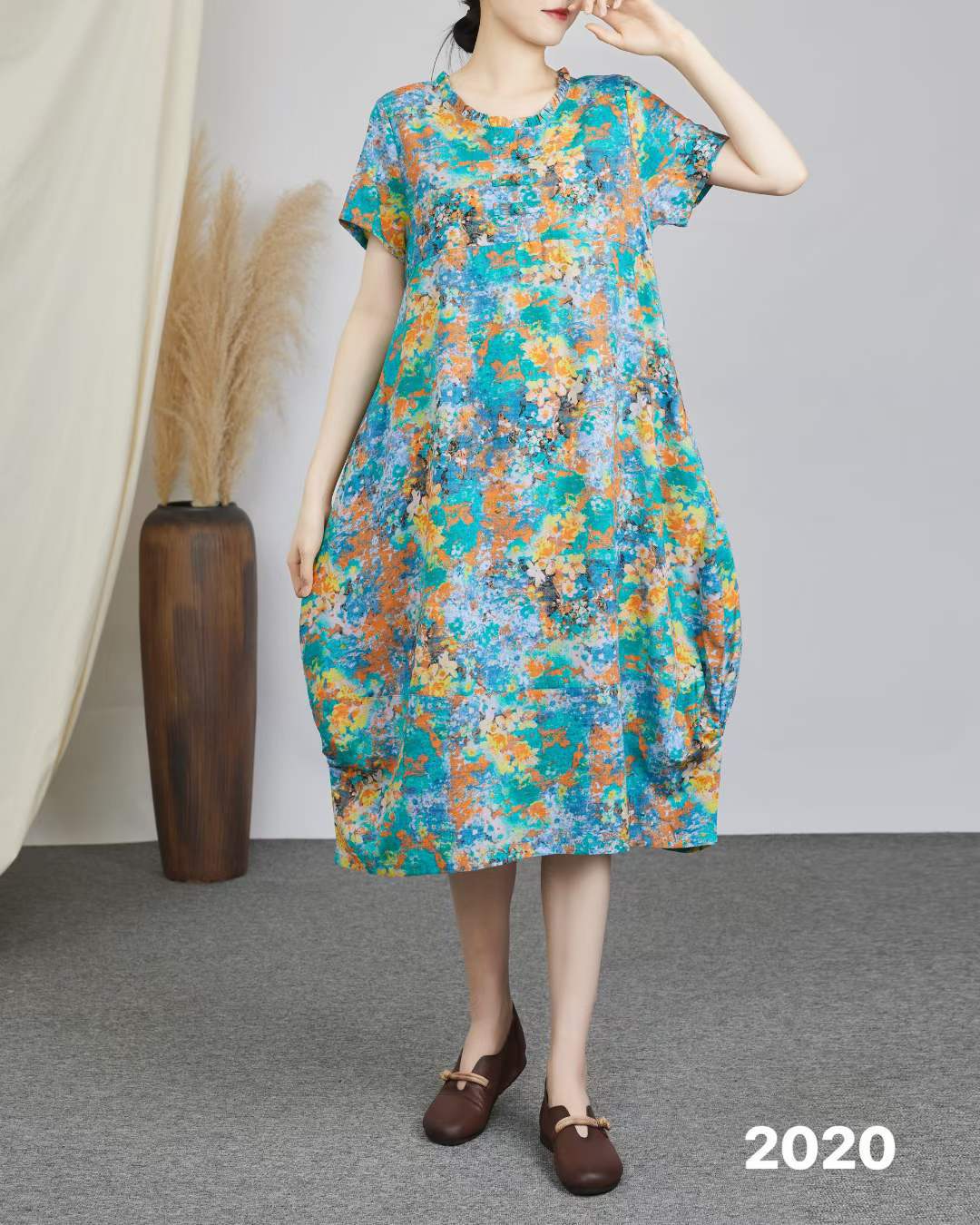 2023夏季碎花棉麻灯笼裙长款短袖花边领三盘扣宽松女式大码连衣裙
