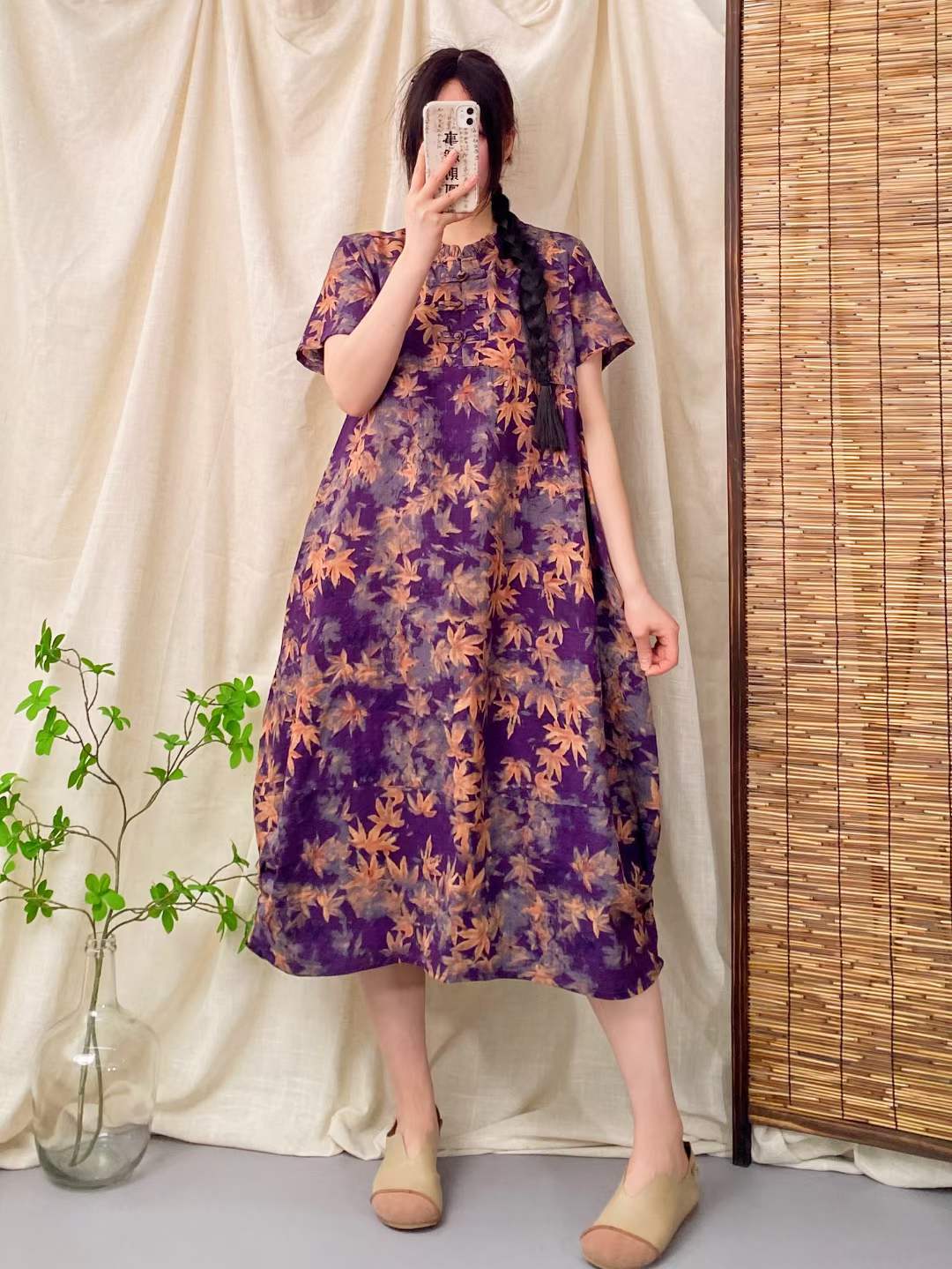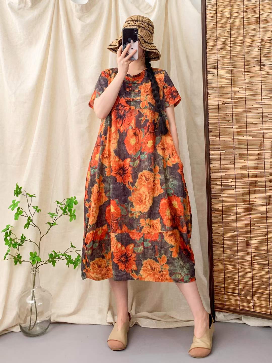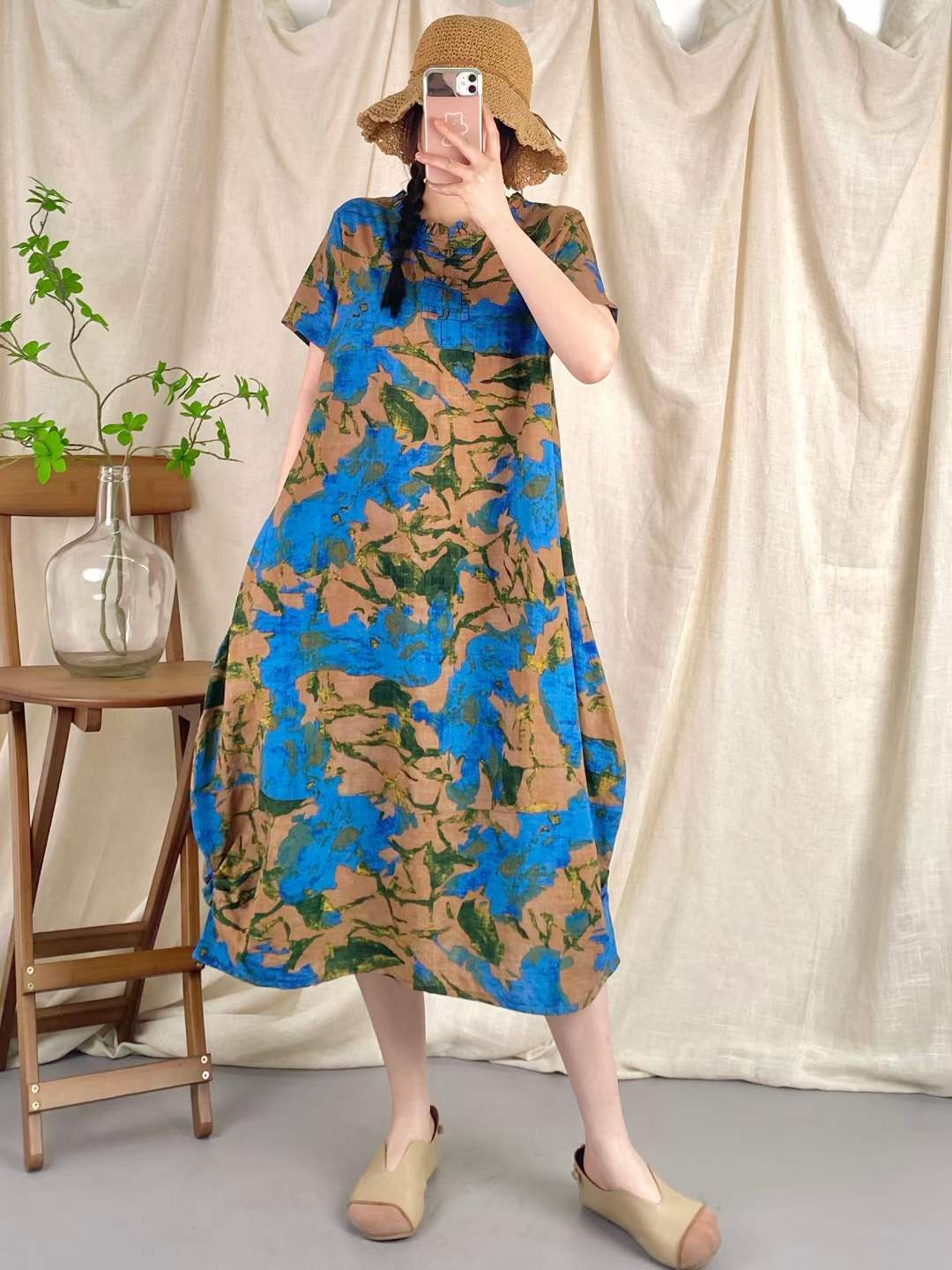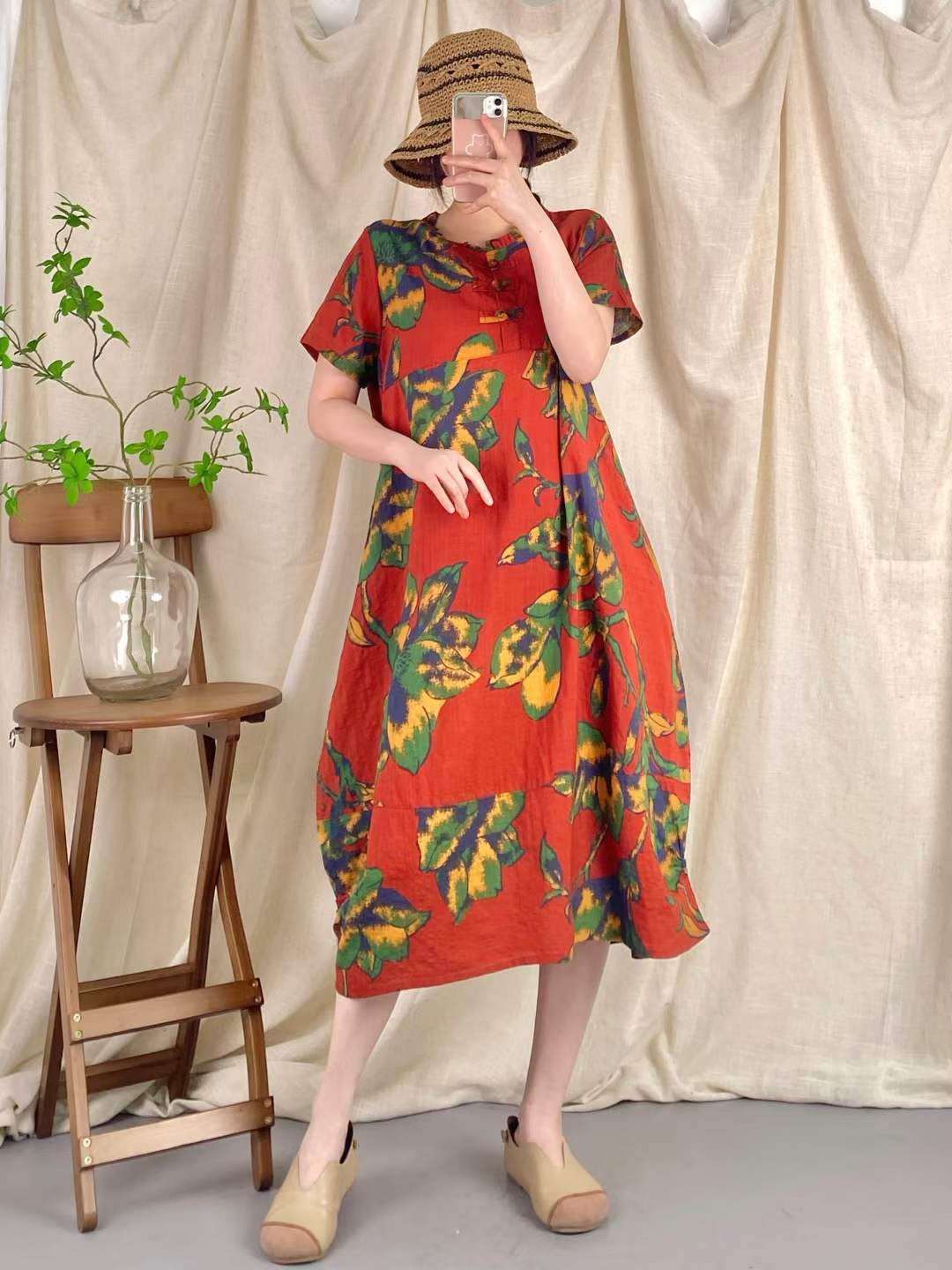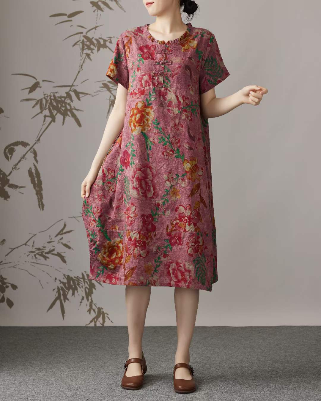 2023夏季碎花棉麻灯笼裙长款短袖花边领三盘扣宽松女式大码连衣裙