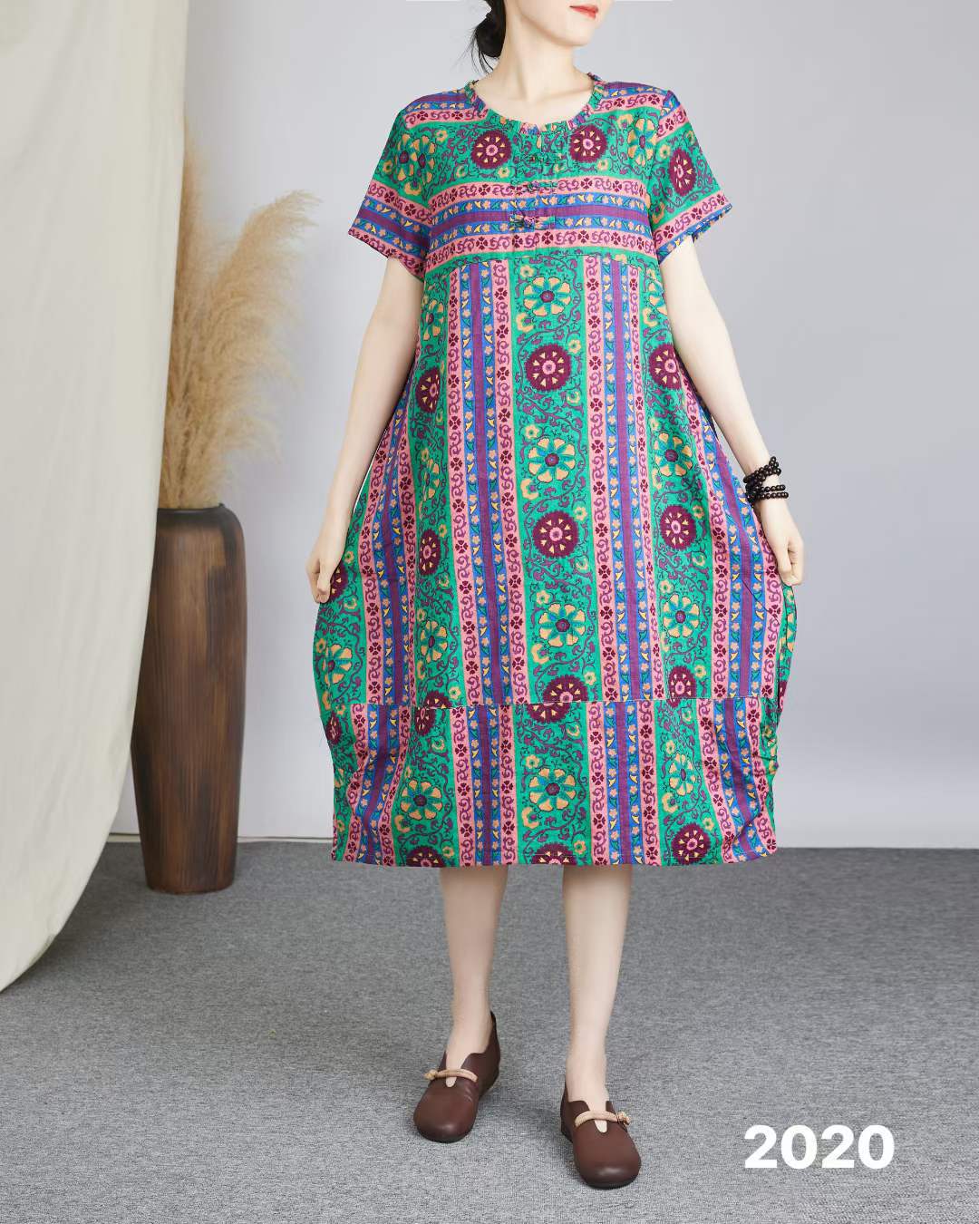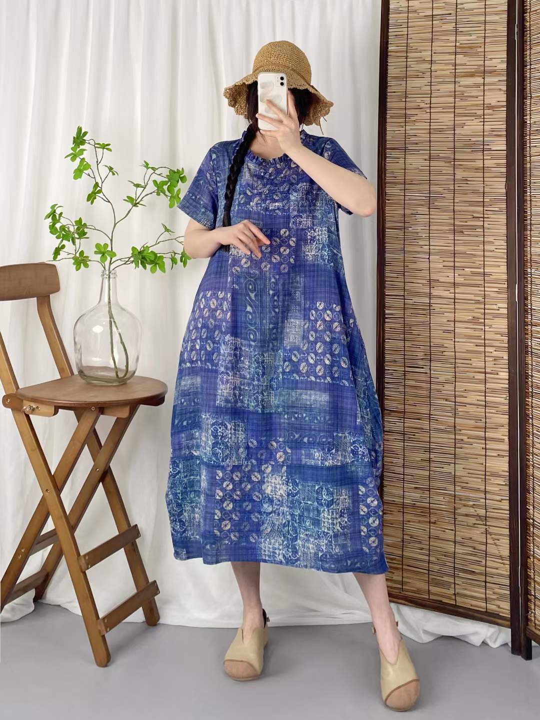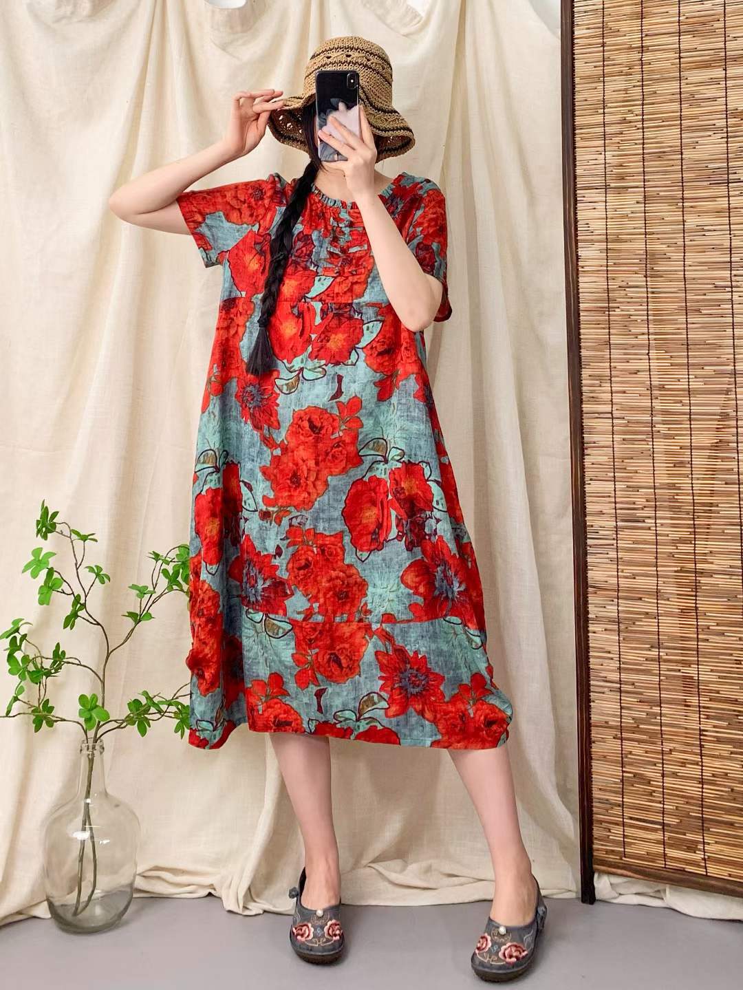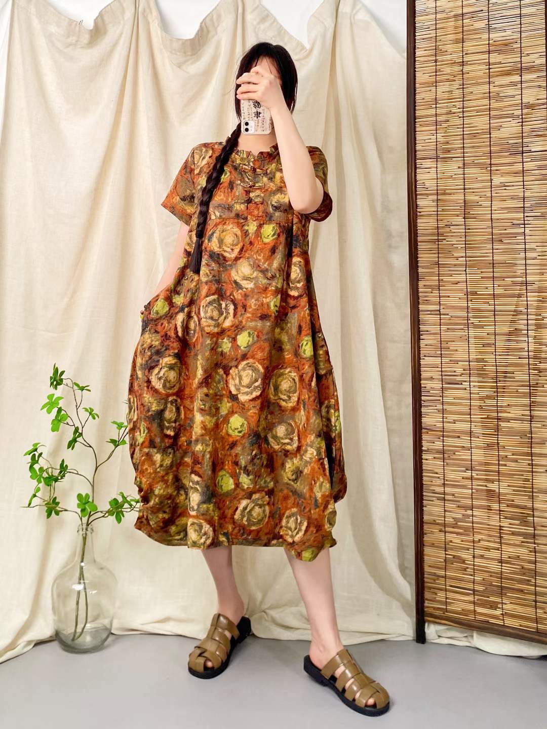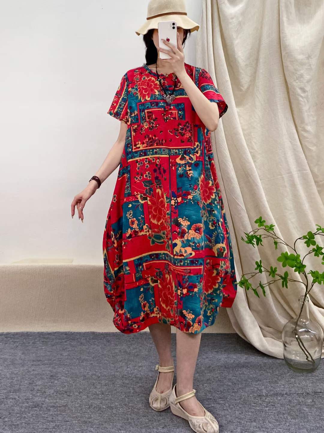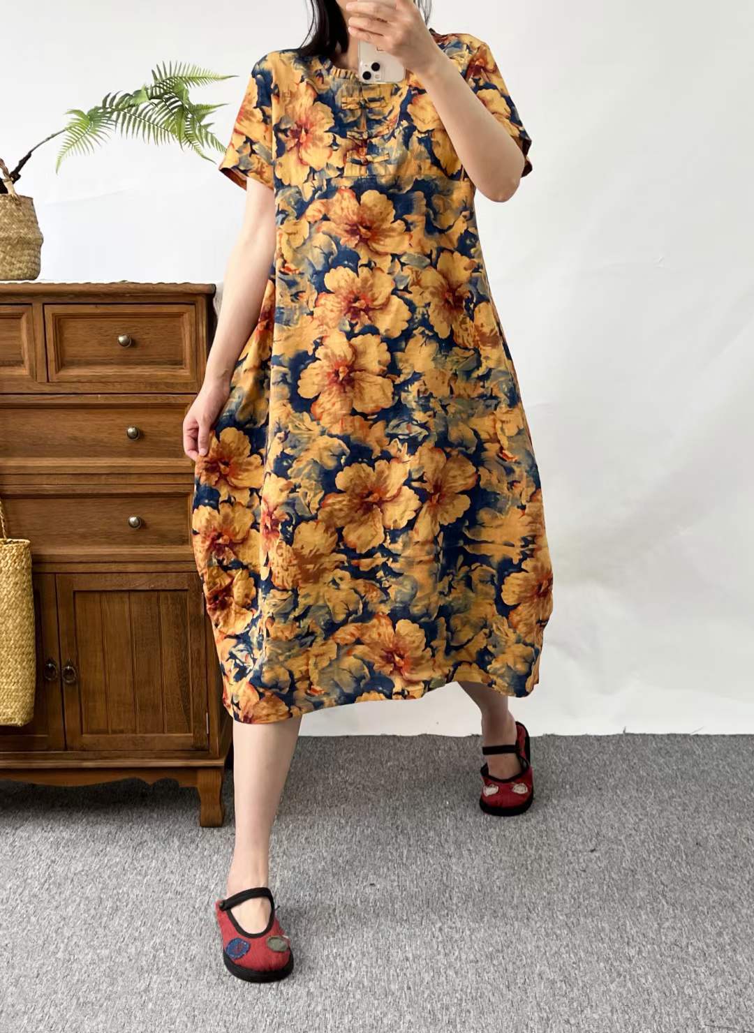 2023夏季碎花棉麻灯笼裙长款短袖花边领三盘扣宽松女式大码连衣裙