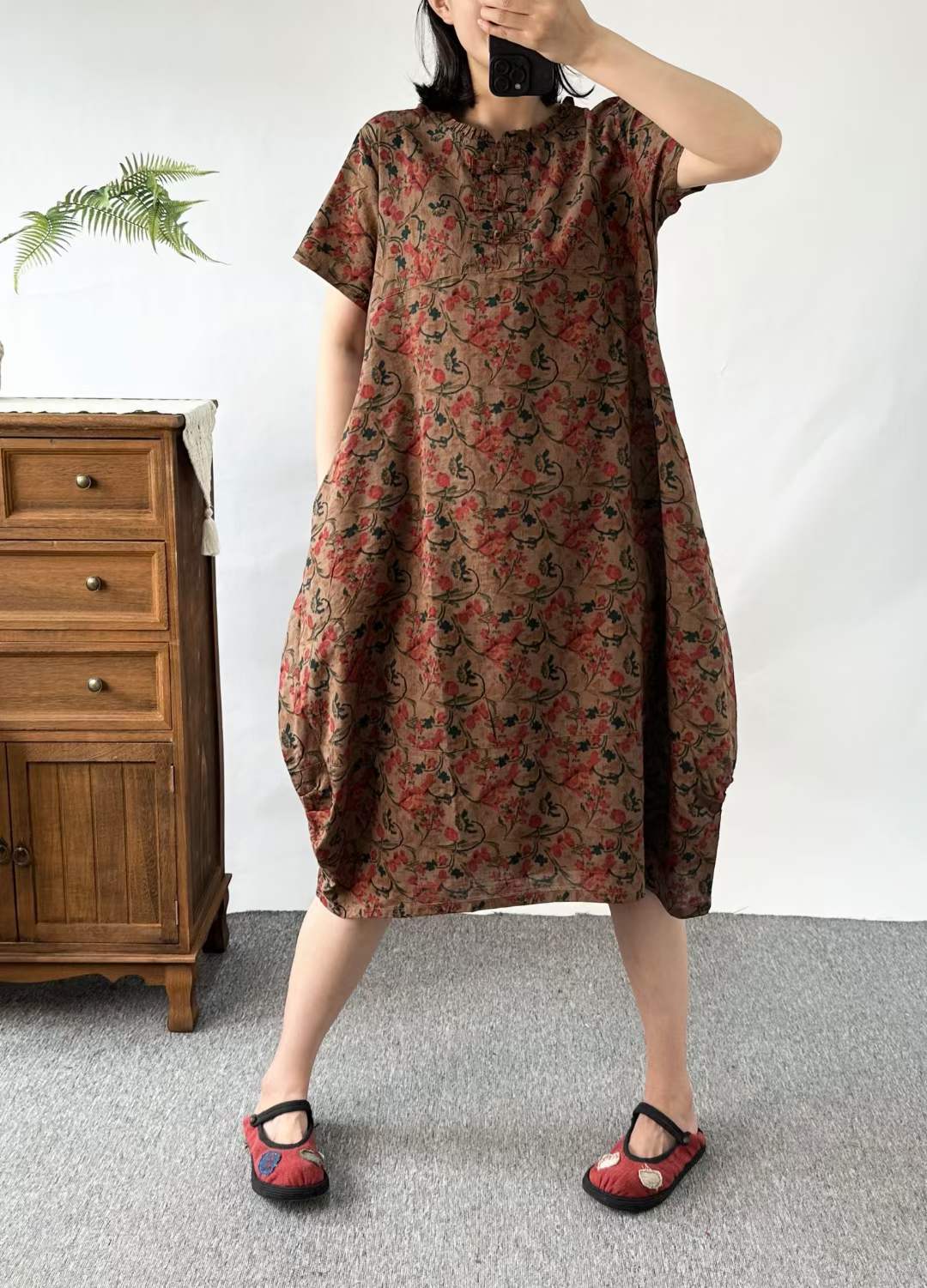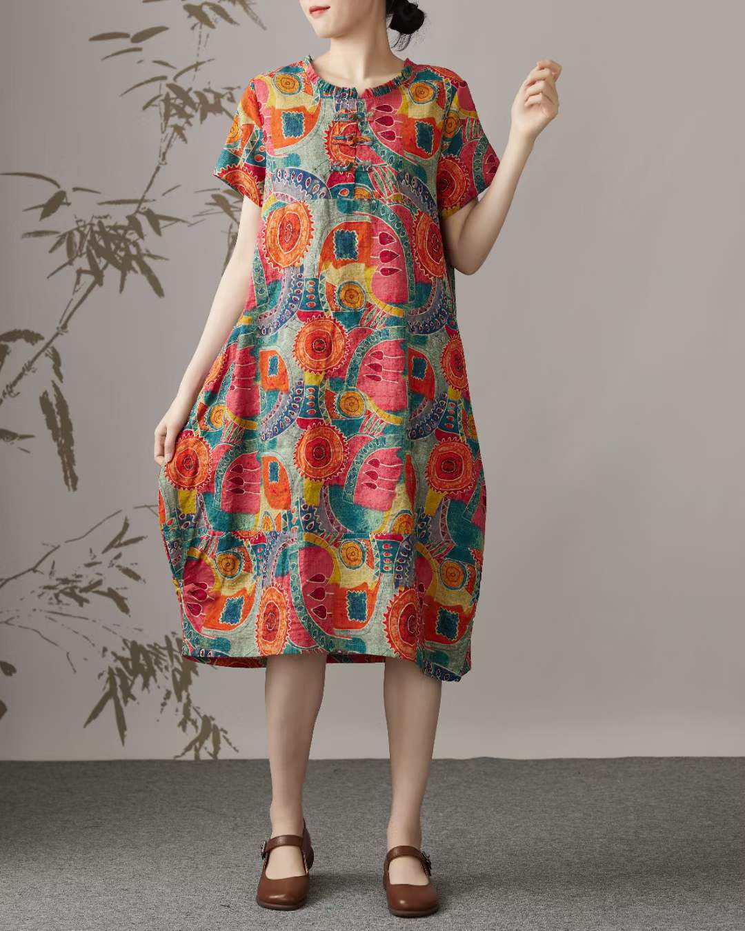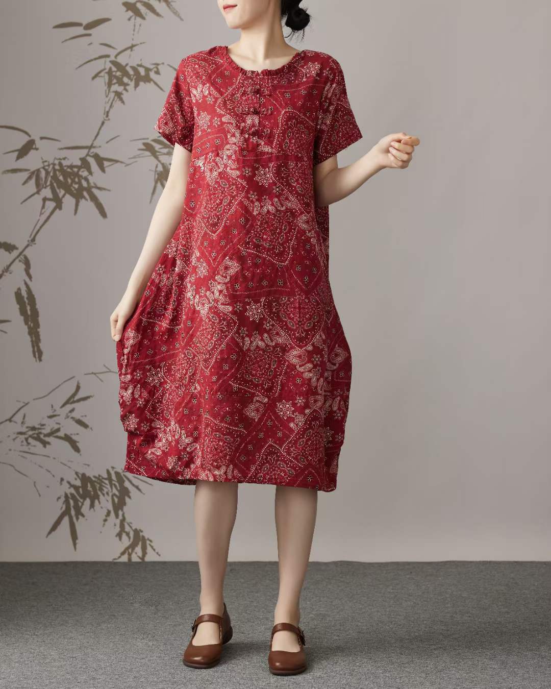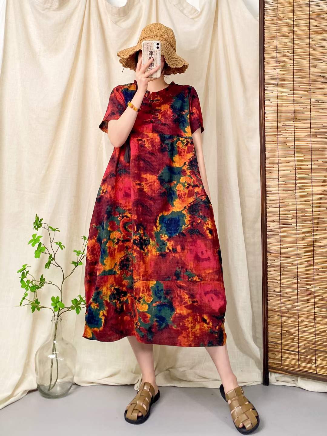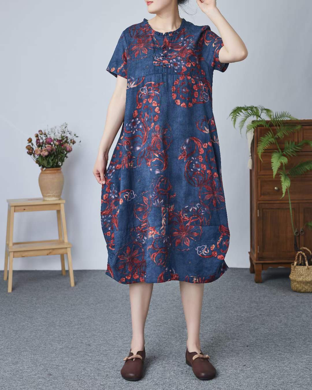 2023夏季碎花棉麻灯笼裙长款短袖花边领三盘扣宽松女式大码连衣裙