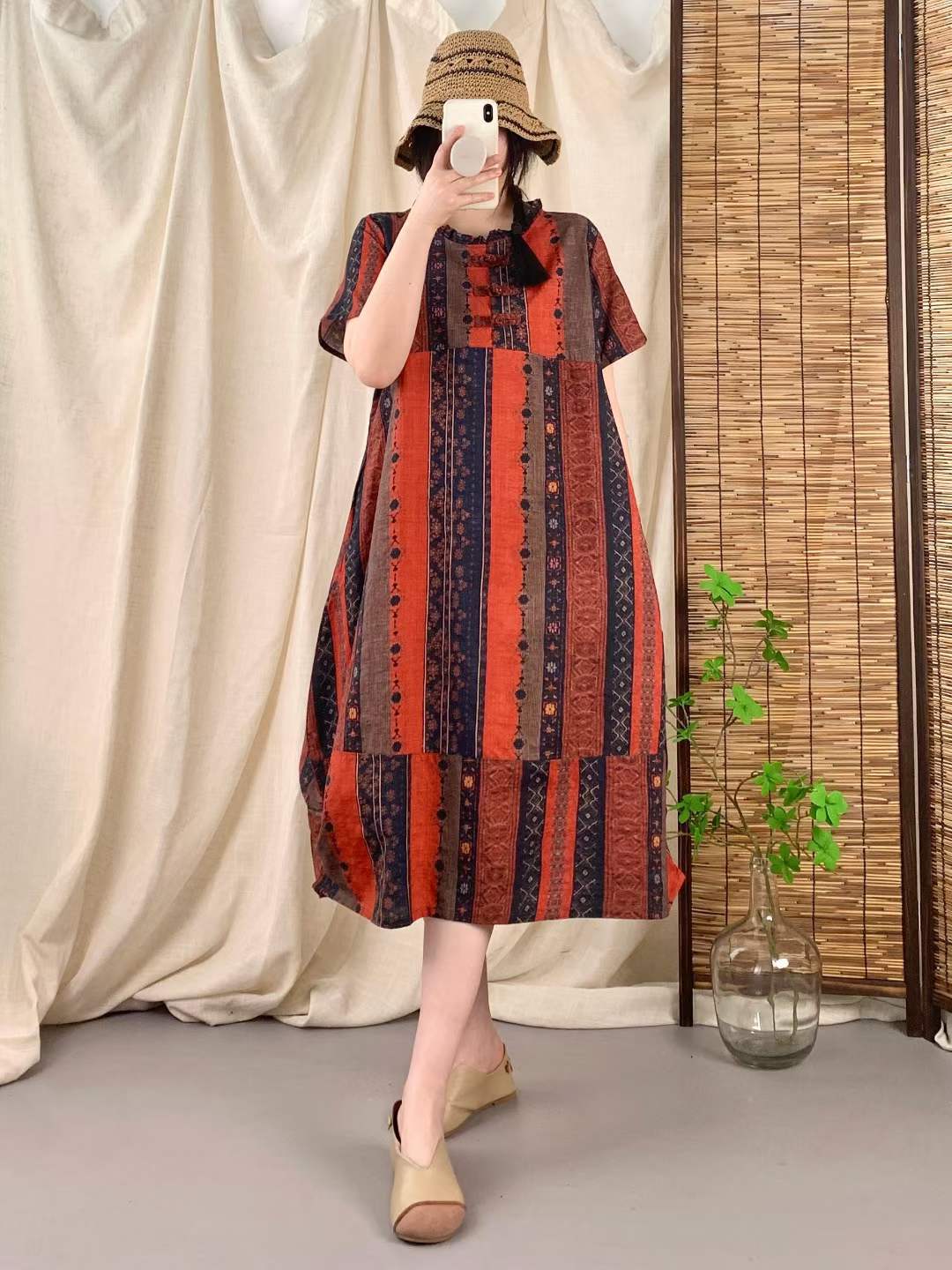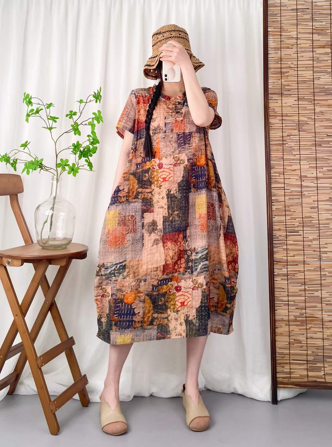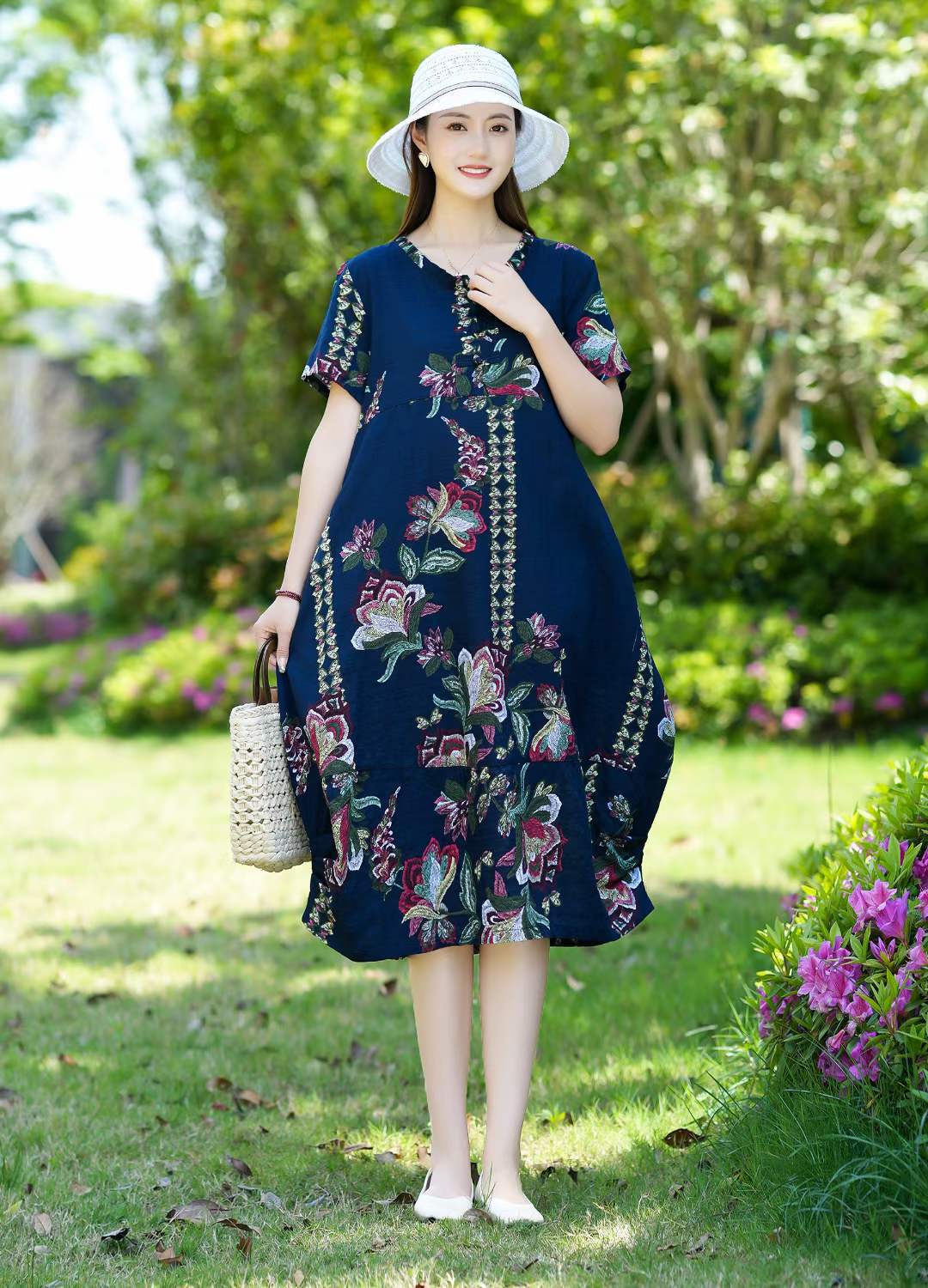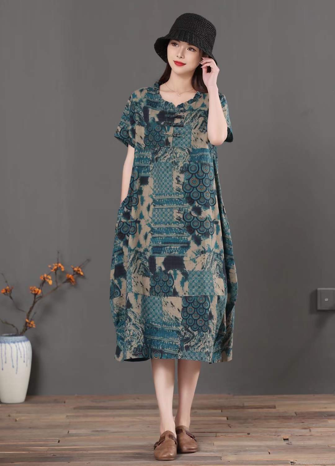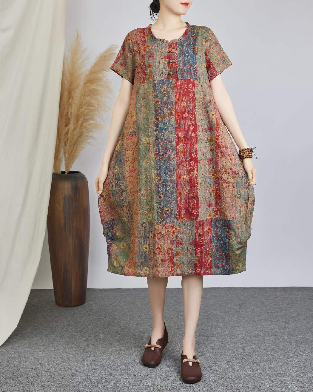 2023夏季碎花棉麻灯笼裙长款短袖花边领三盘扣宽松女式大码连衣裙