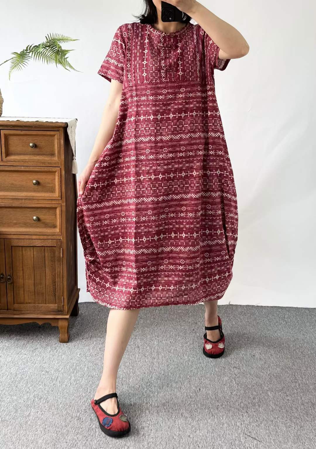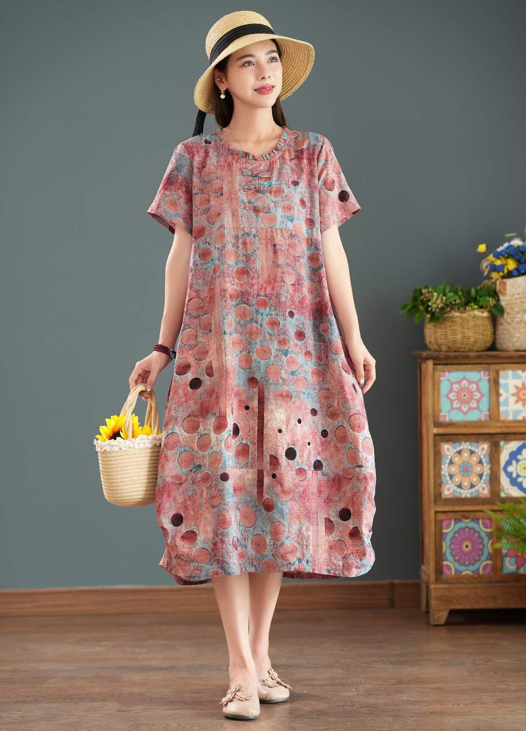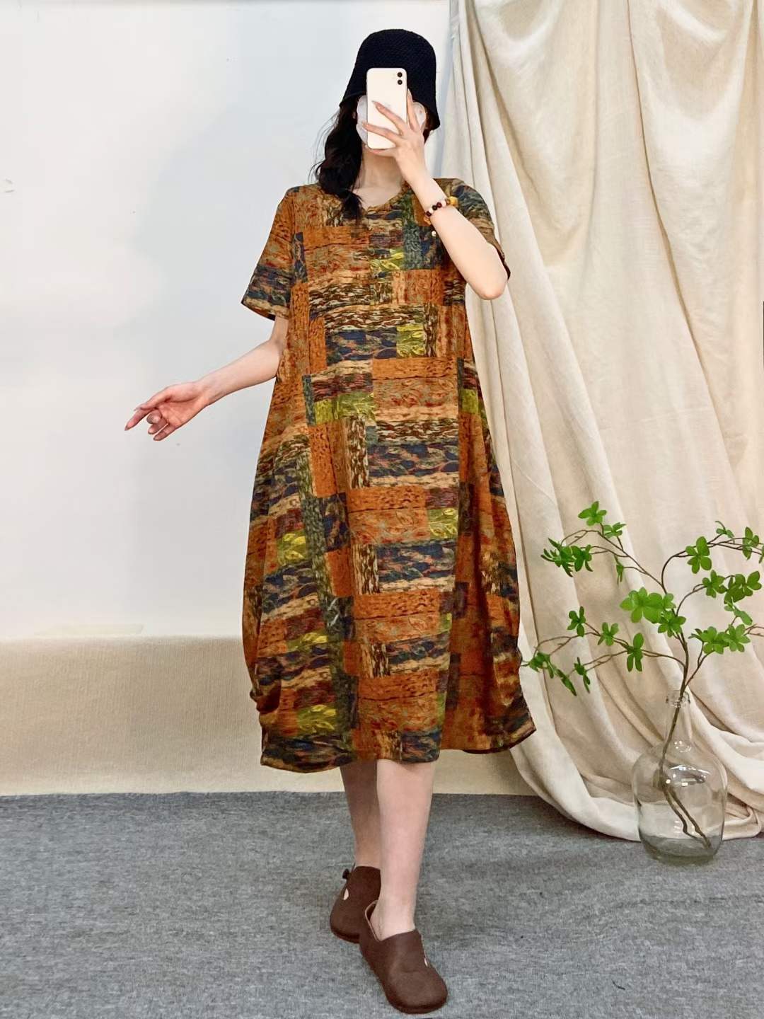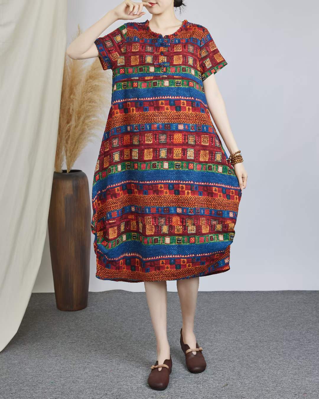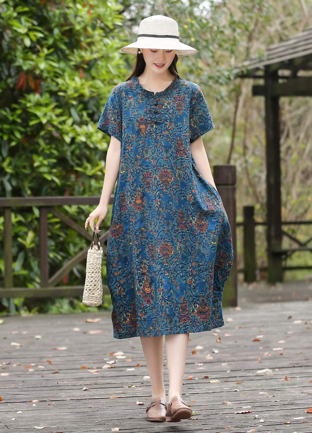 2023夏季碎花棉麻灯笼裙长款短袖花边领三盘扣宽松女式大码连衣裙