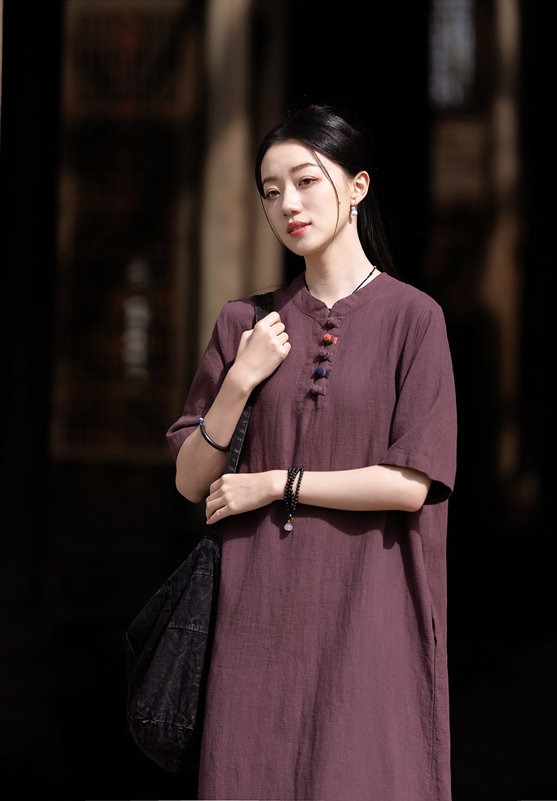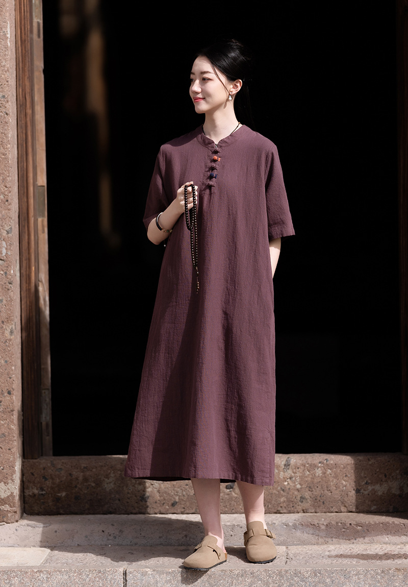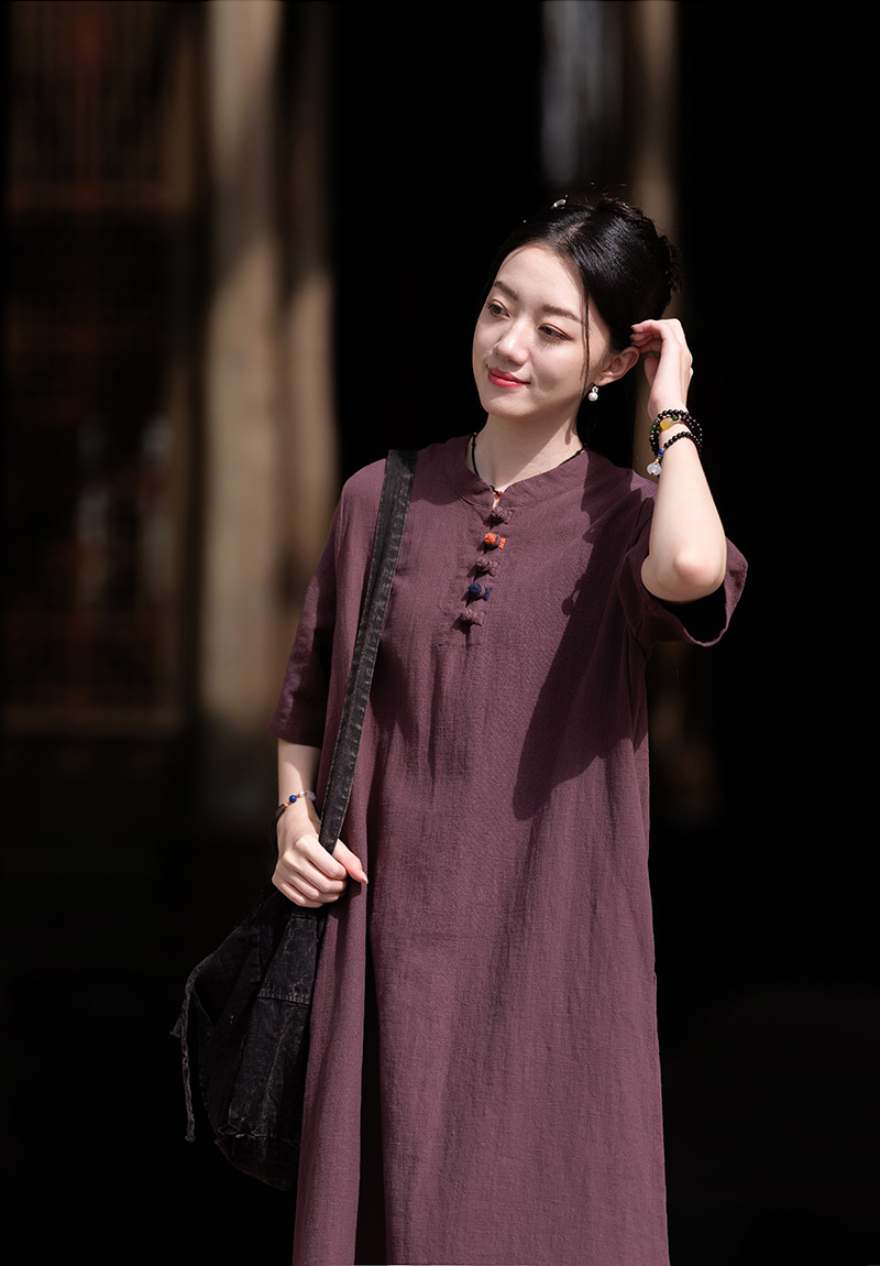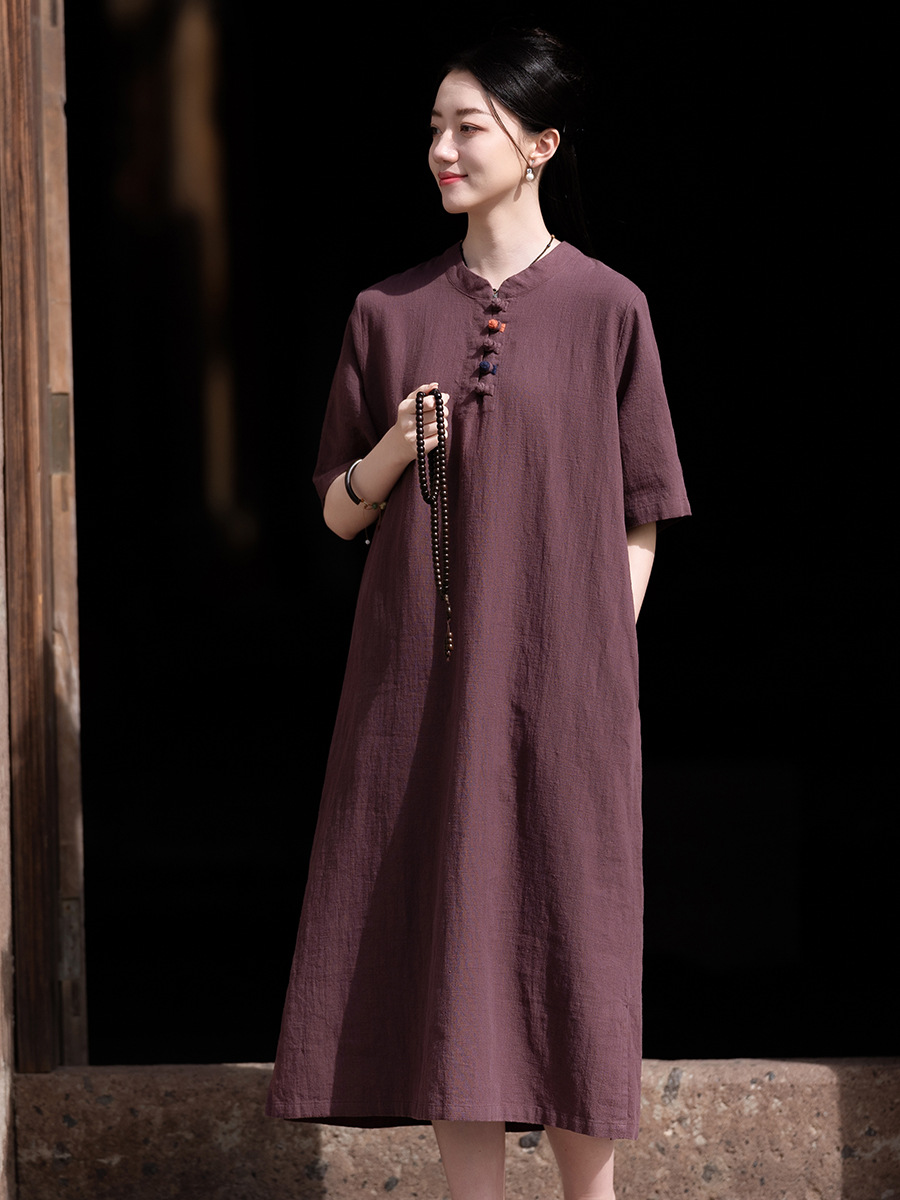 24棉麻女装夏季中式国风立领短袖砂洗改良旗袍长裙女式袍子连衣裙