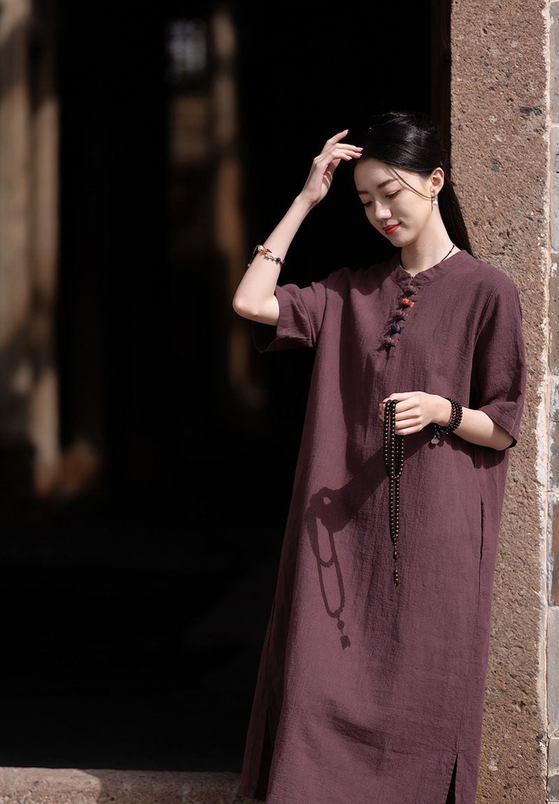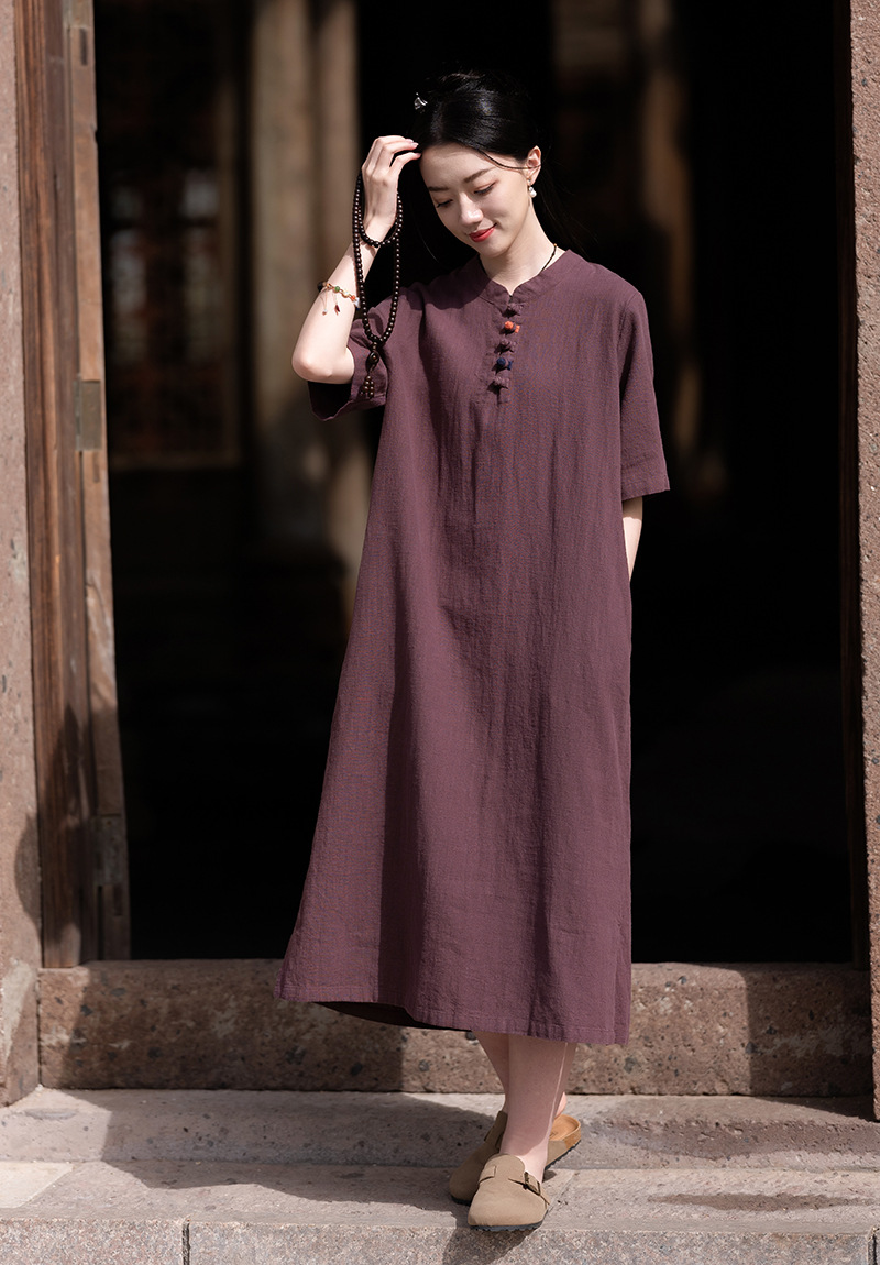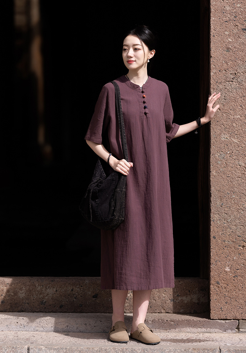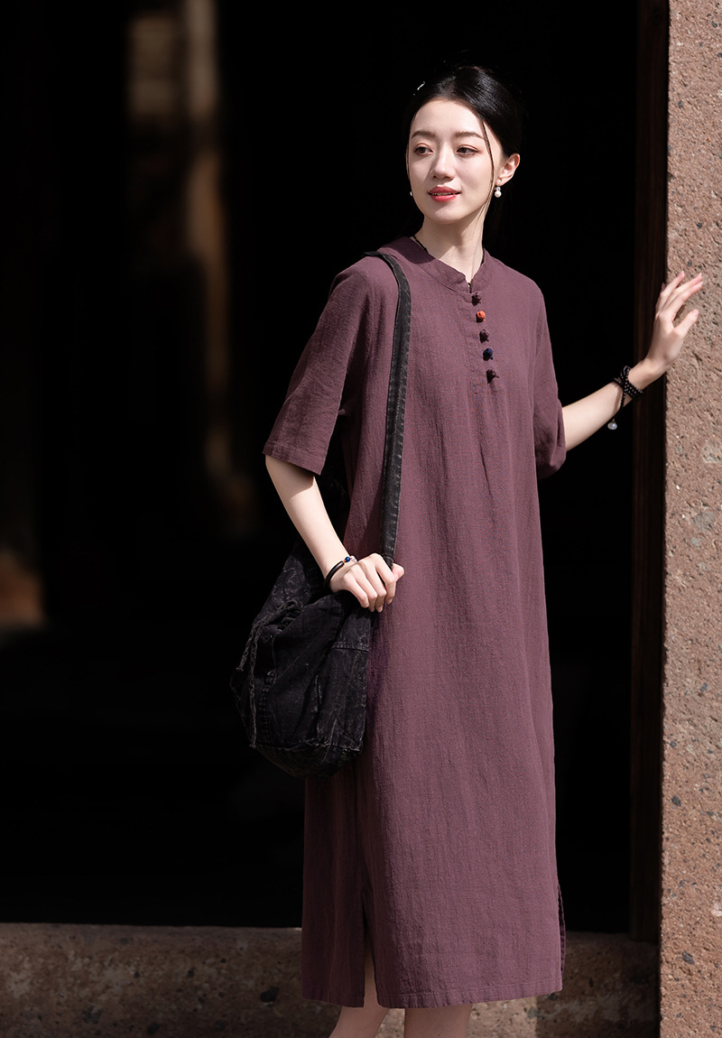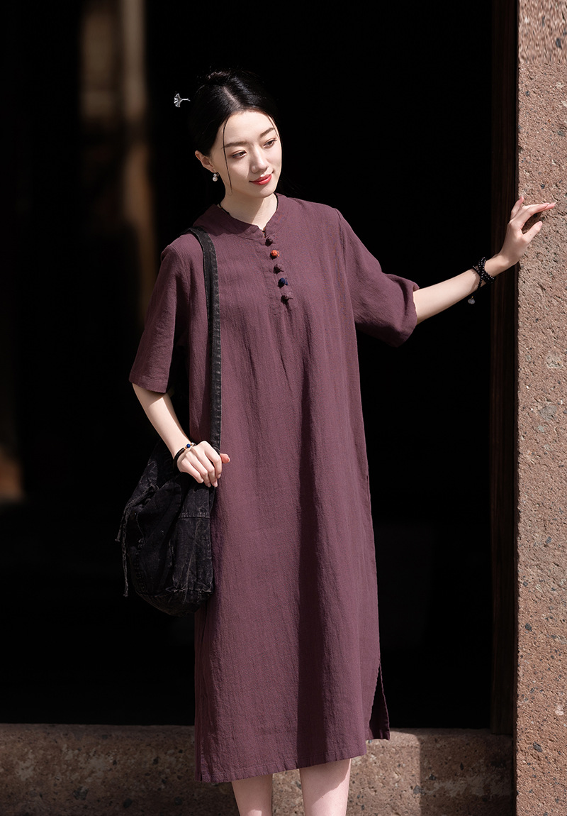 24棉麻女装夏季中式国风立领短袖砂洗改良旗袍长裙女式袍子连衣裙