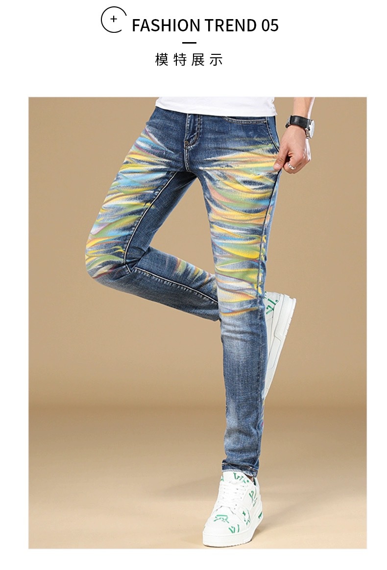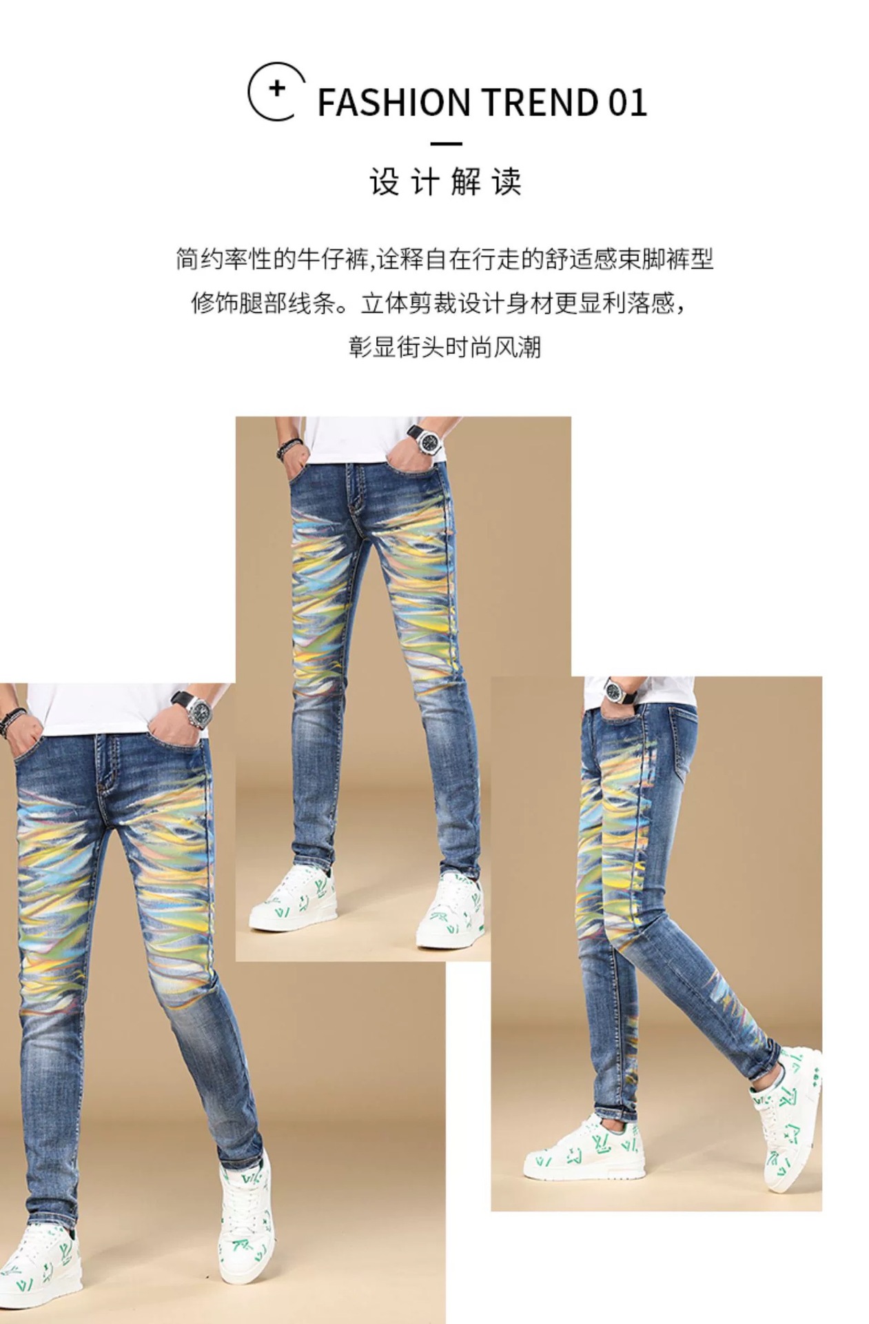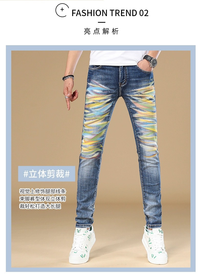 男士潮牌牛仔裤2024年新款春季修身小脚裤个性印花蓝色百搭长裤子