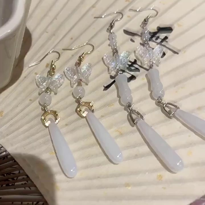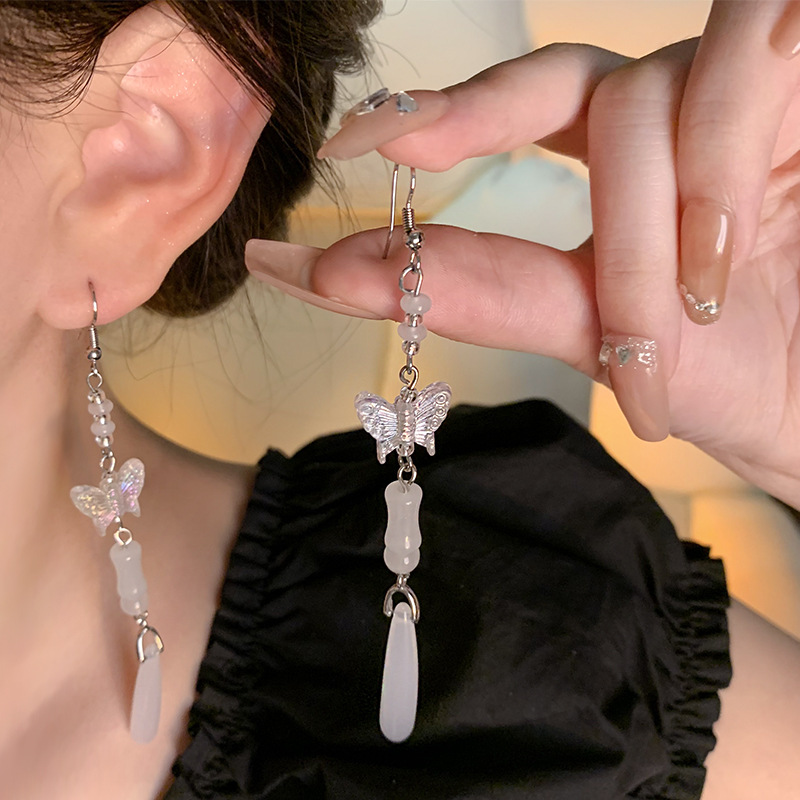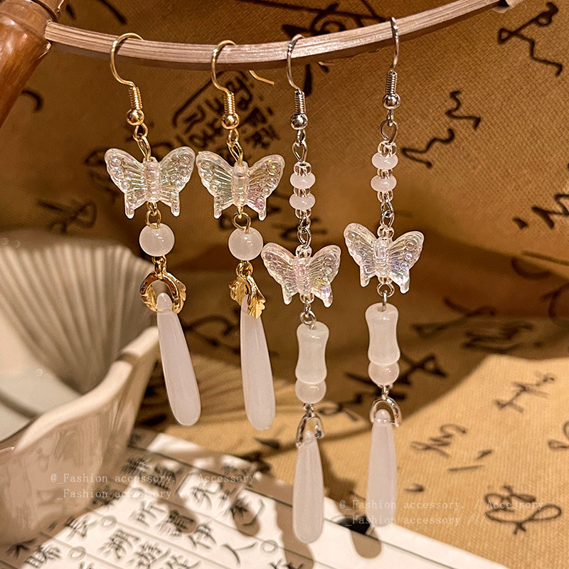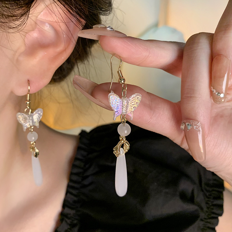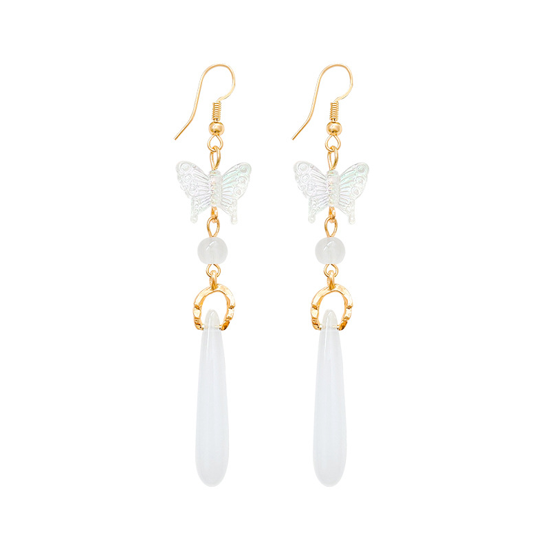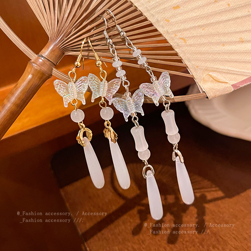 饰品中古风百搭气质蝴蝶耳钉网红耳饰复古厂库流苏仿玉髓耳环女