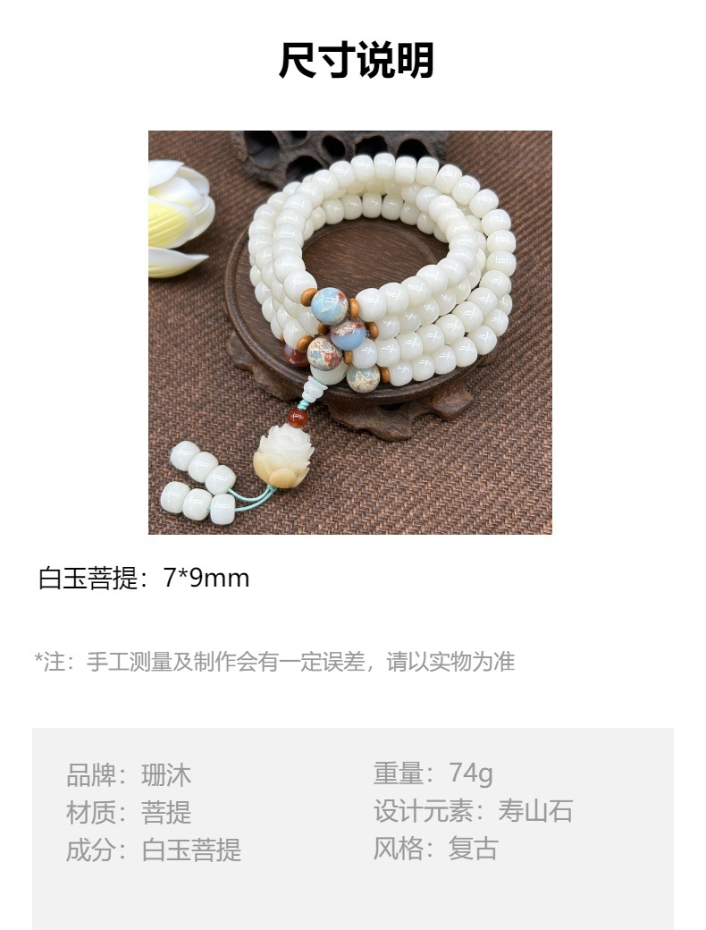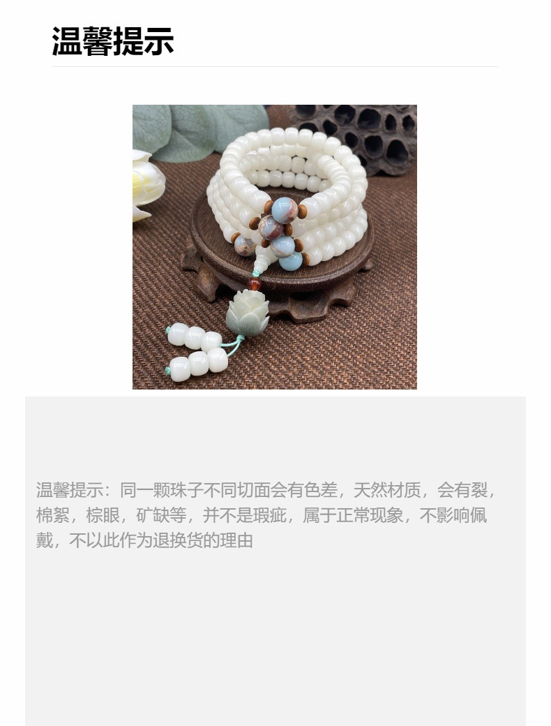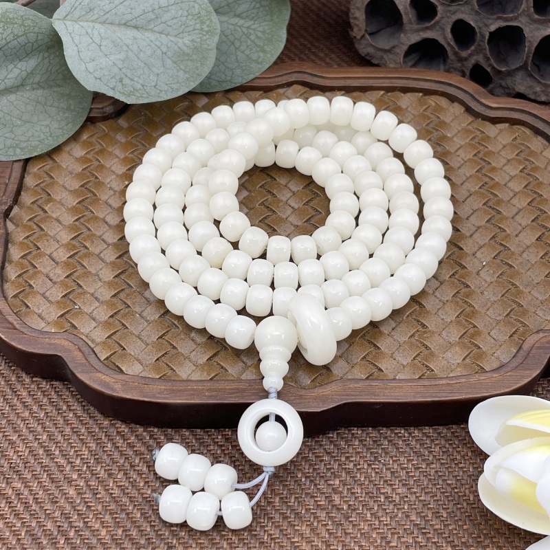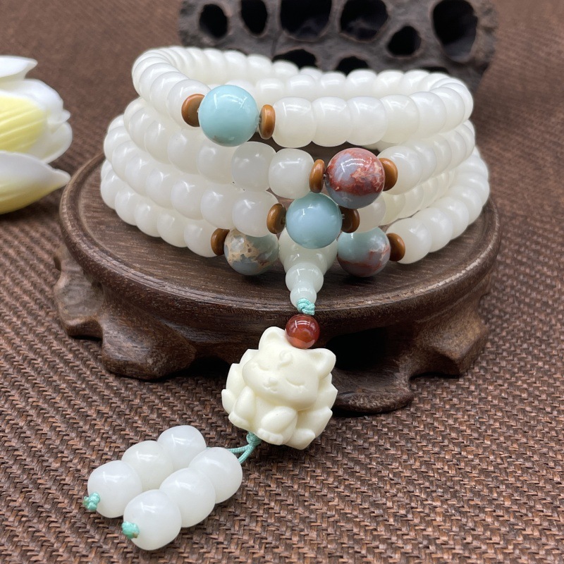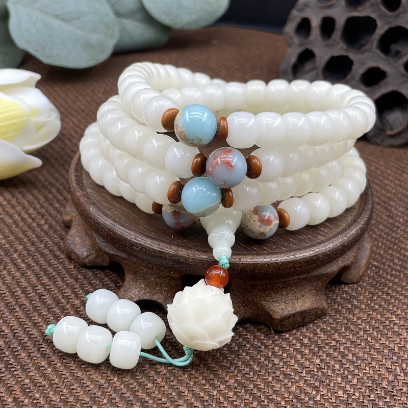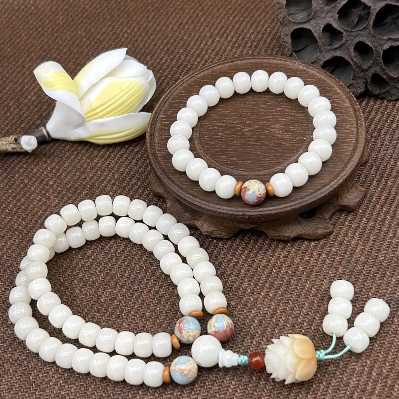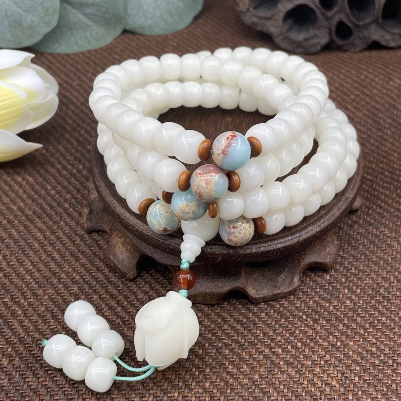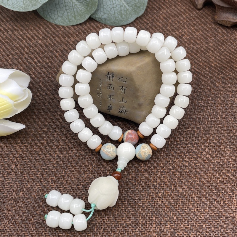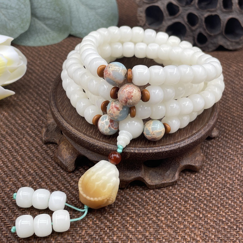 白玉菩提根108颗佛珠手串寿山石配饰莲花菩提籽佛珠念珠文玩手链