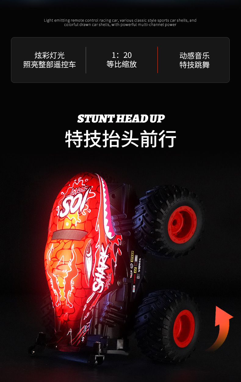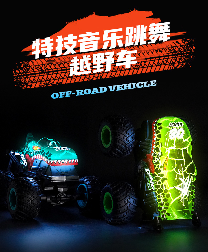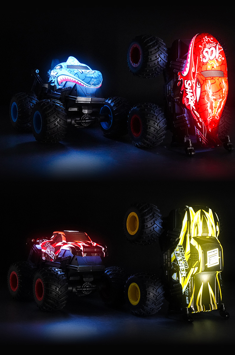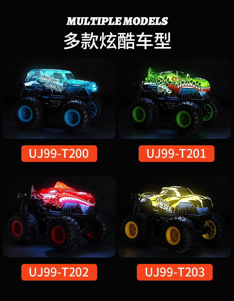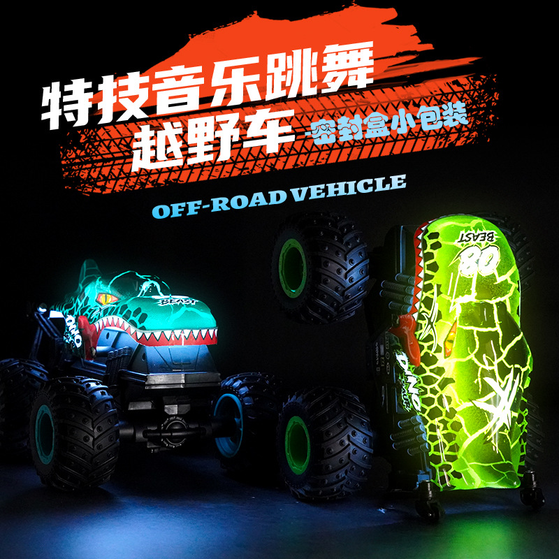 新款音乐灯光遥控特技车360度旋转大脚车恐龙头鲨鱼头儿童玩具车