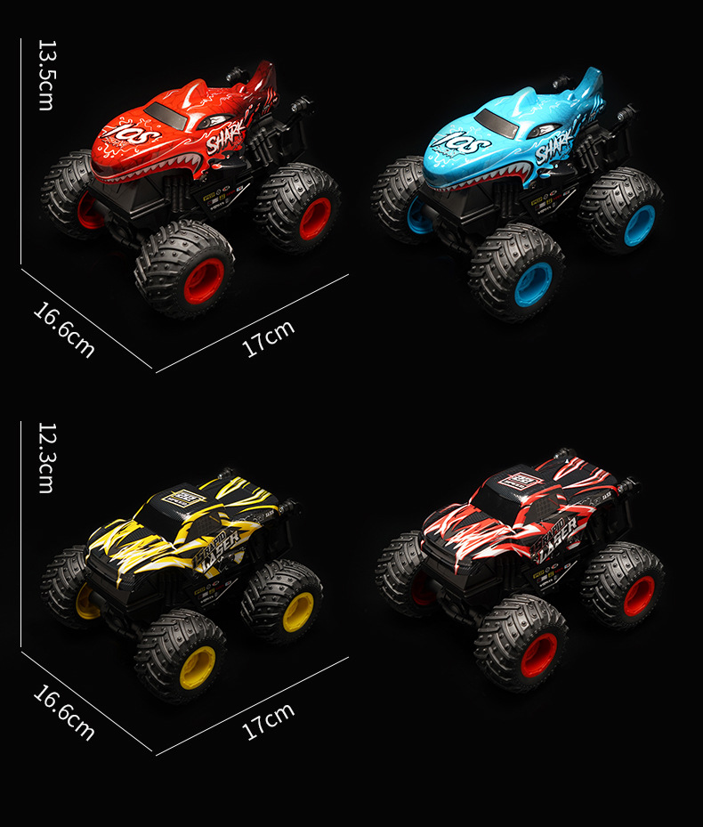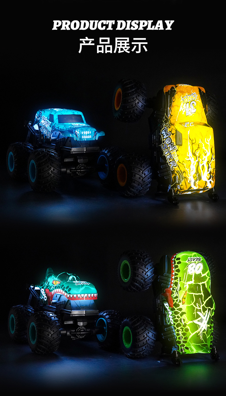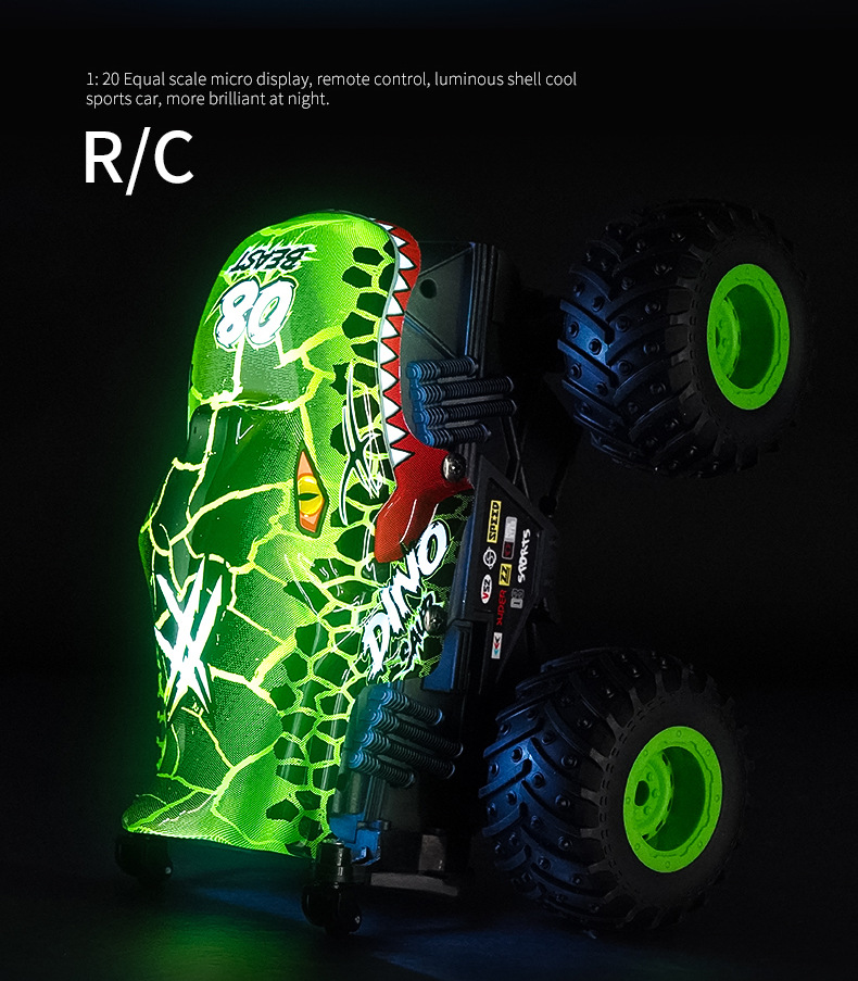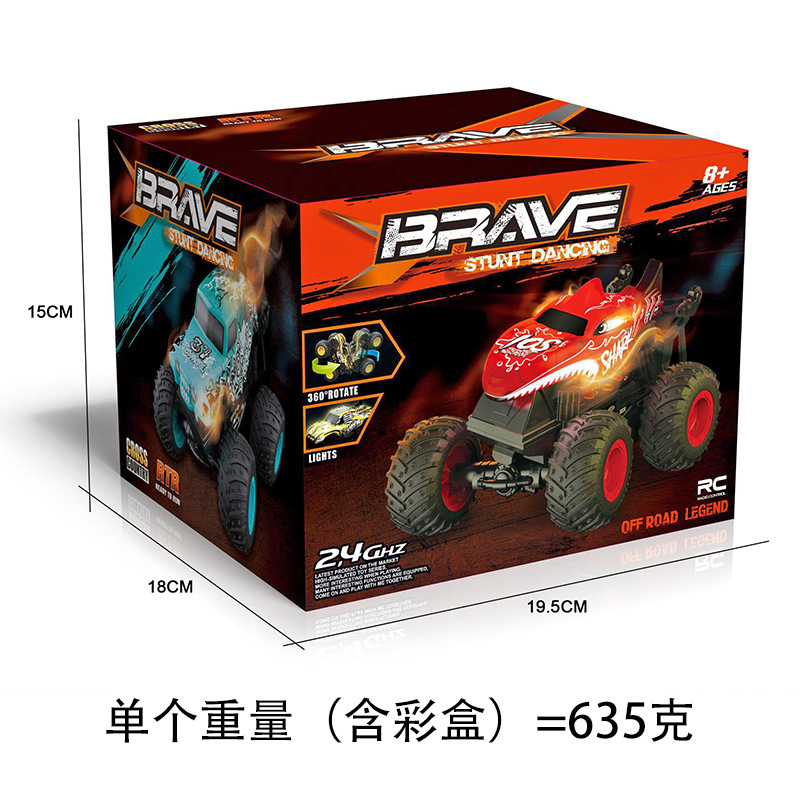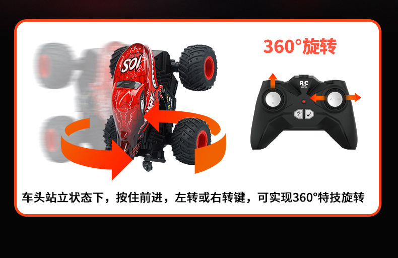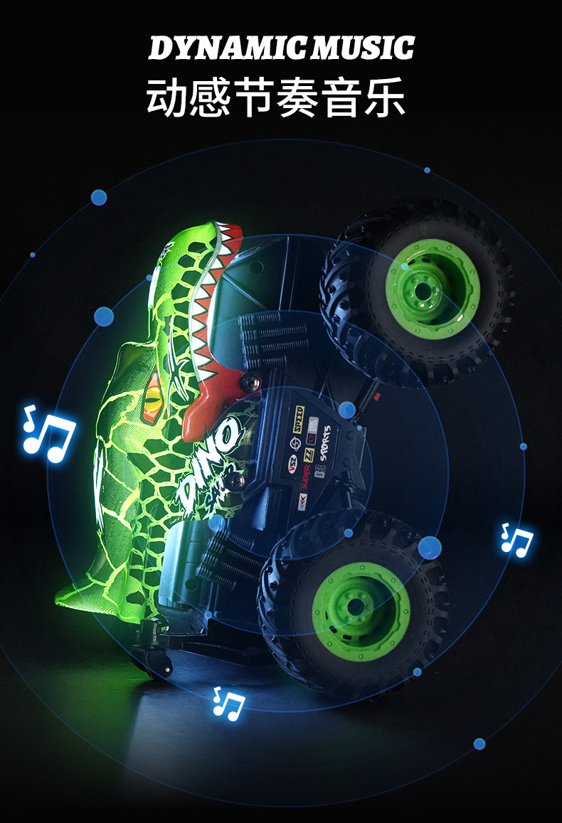 新款音乐灯光遥控特技车360度旋转大脚车恐龙头鲨鱼头儿童玩具车