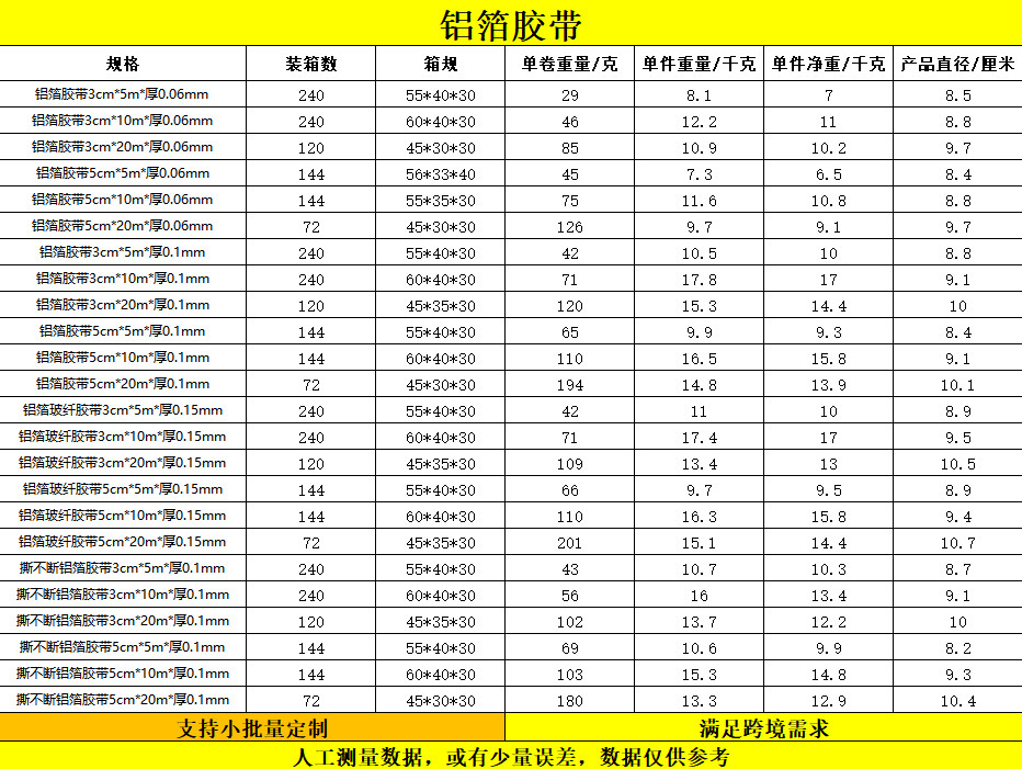 | aluminum foil tape 5cm * 5m * thickness 0.06mm(铝箔胶带5cm*5m*厚0.06mm) | USD $0.23 | 456123 volume available |