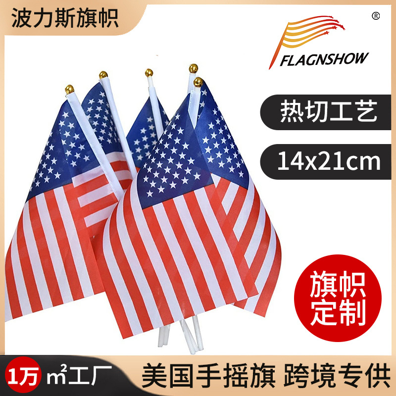 跨境独立日美国手摇旗14*21cm涤纶数码印塑料旗杆竞选美国旗定 制