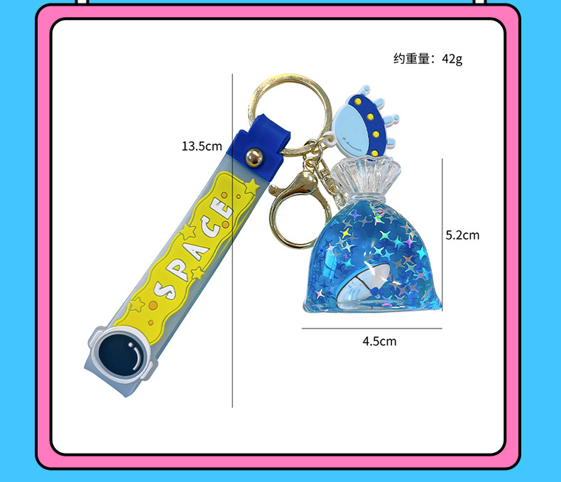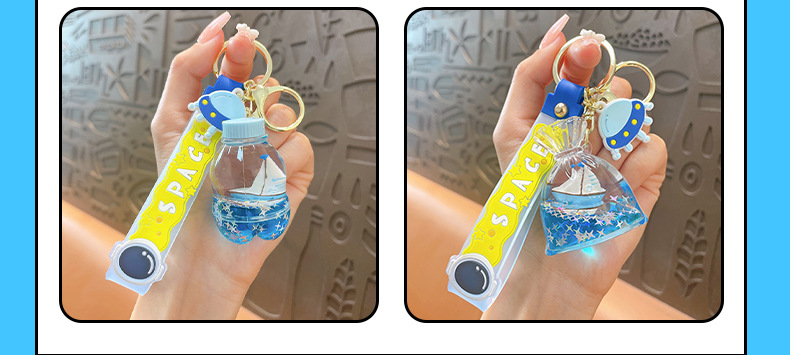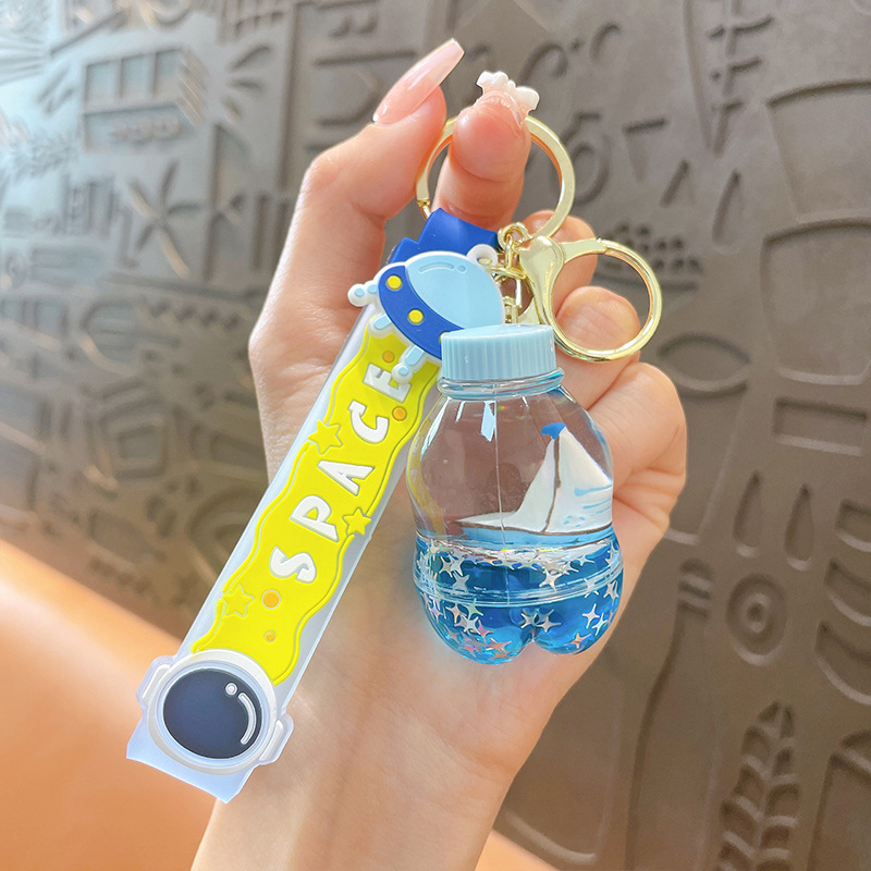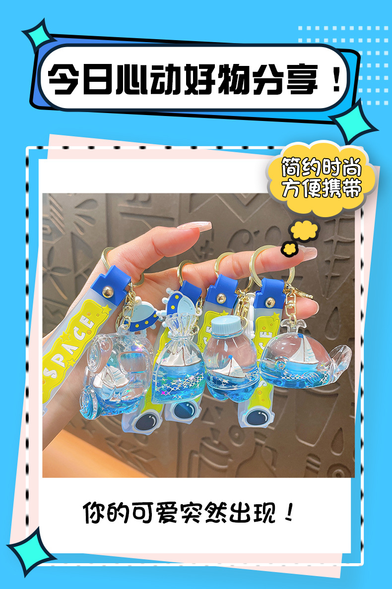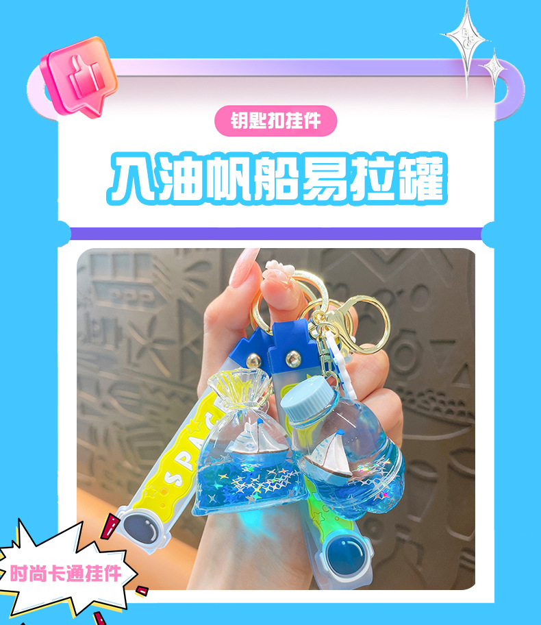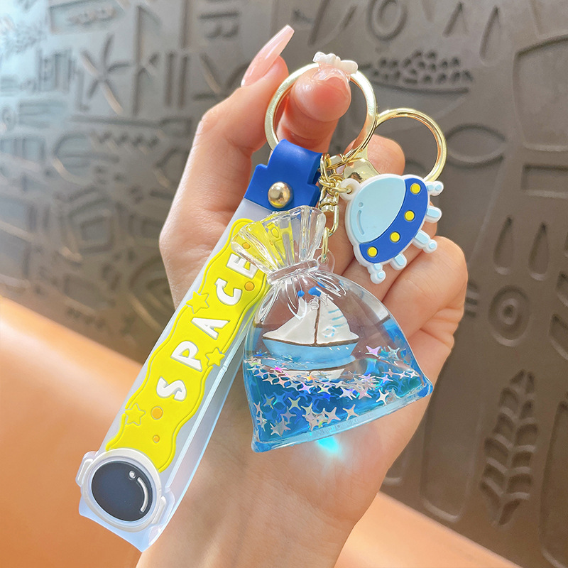 入油蓝色帆船漂浮瓶钥匙扣链可爱液体流沙汽车挂件包包小礼品批发