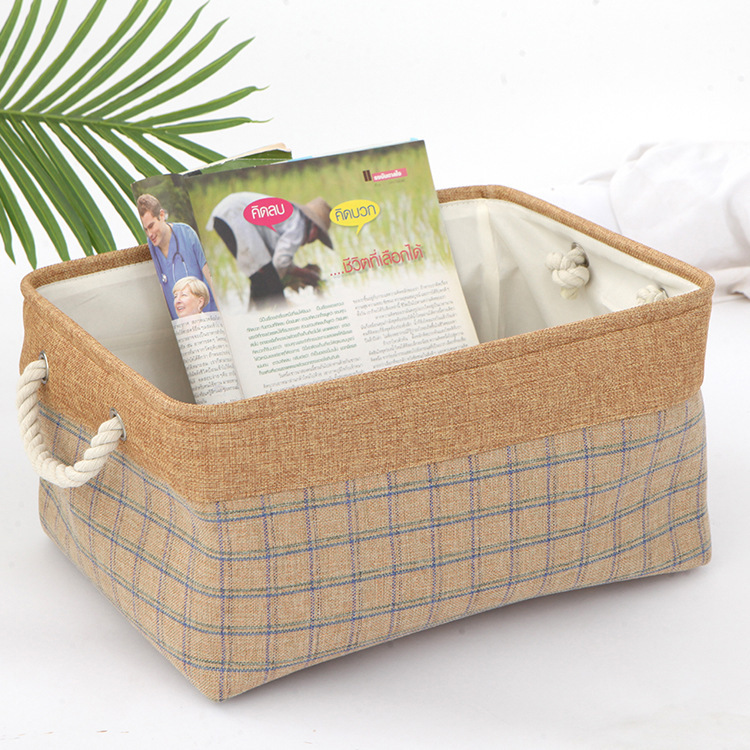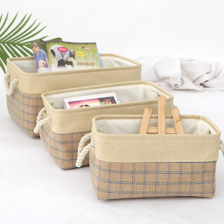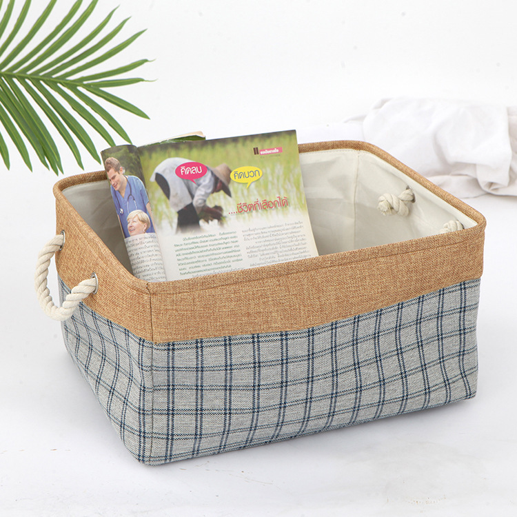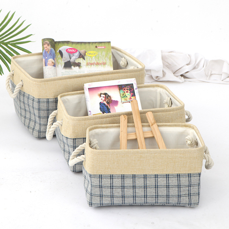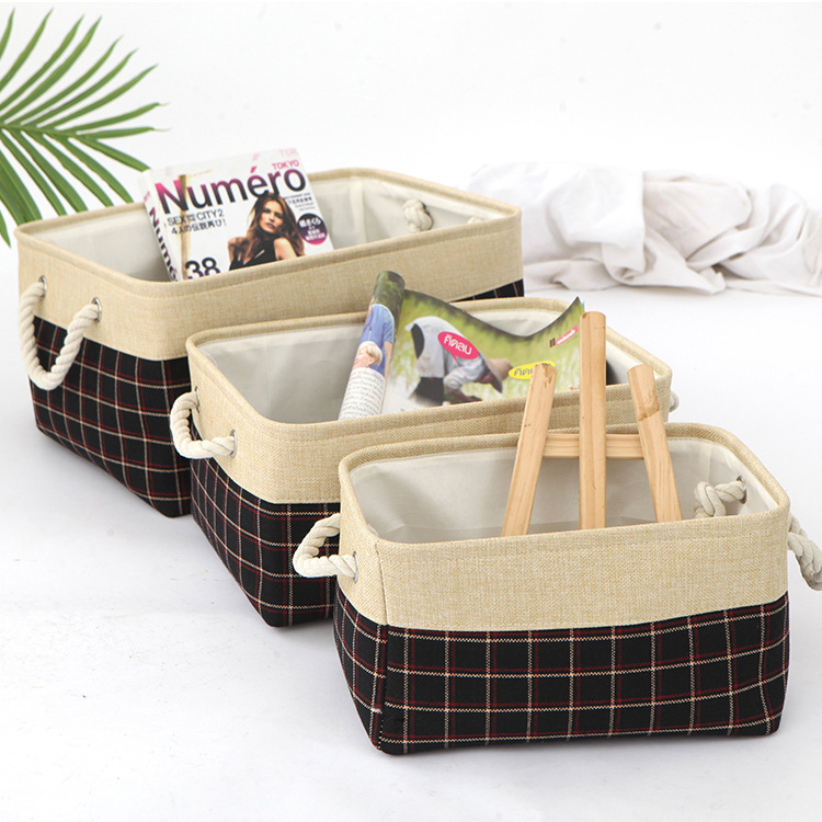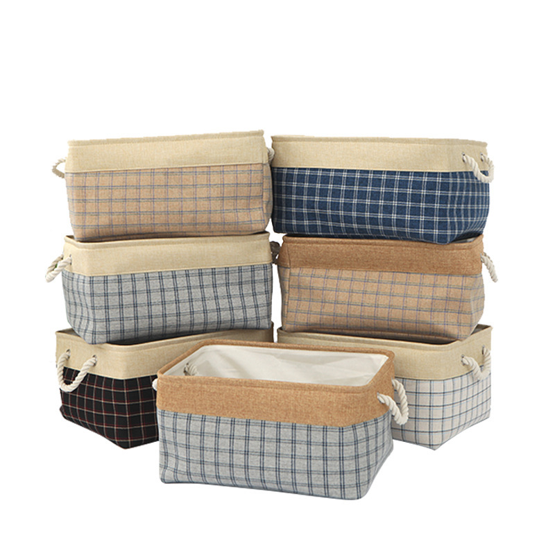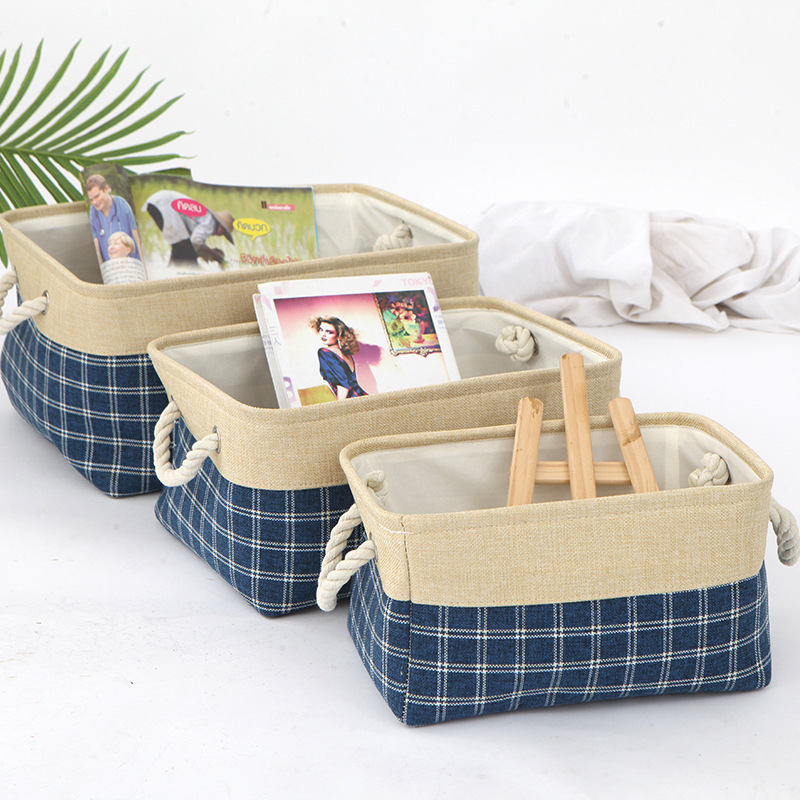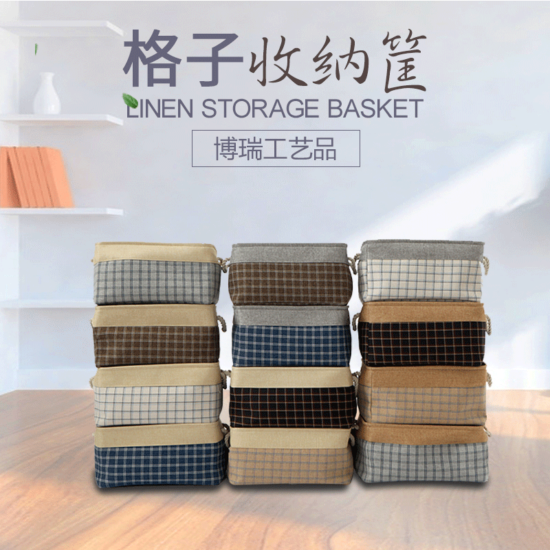 简约现代文具置物筐家用桌面杂物整理收纳筐亚麻布拼接格子收纳筐