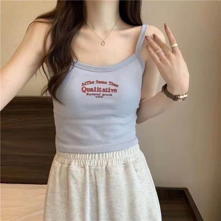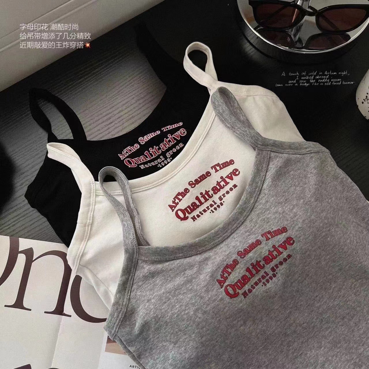 纯棉少女吊带背心带胸垫女字母印花内搭外穿运动辣妹短款打底上衣