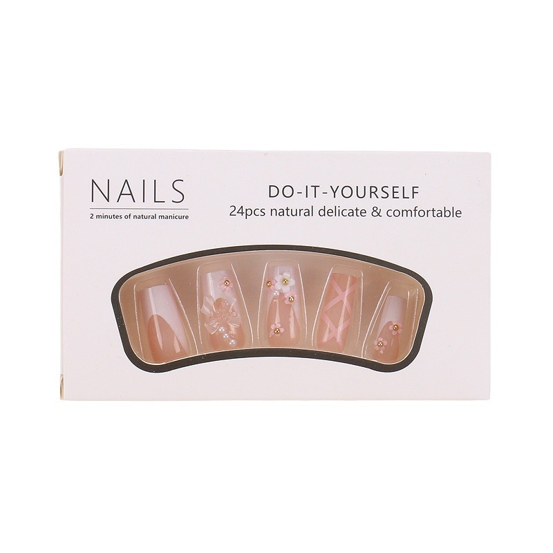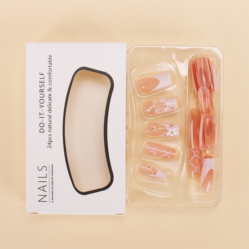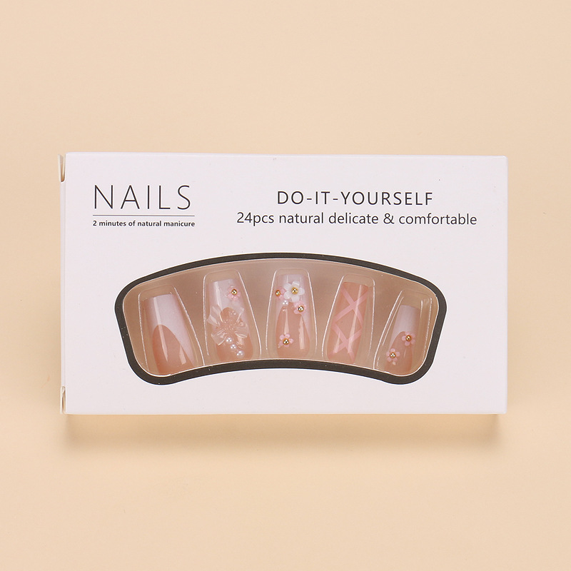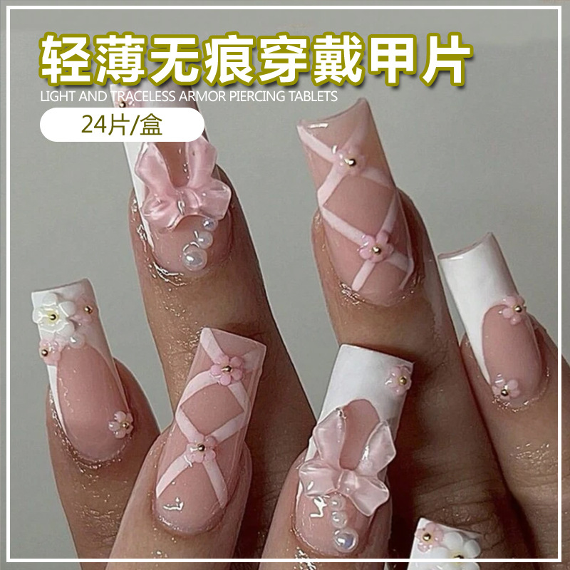 外贸爆款穿戴甲法式白边美甲贴片花朵珍珠蝴蝶结假指甲片成品24片