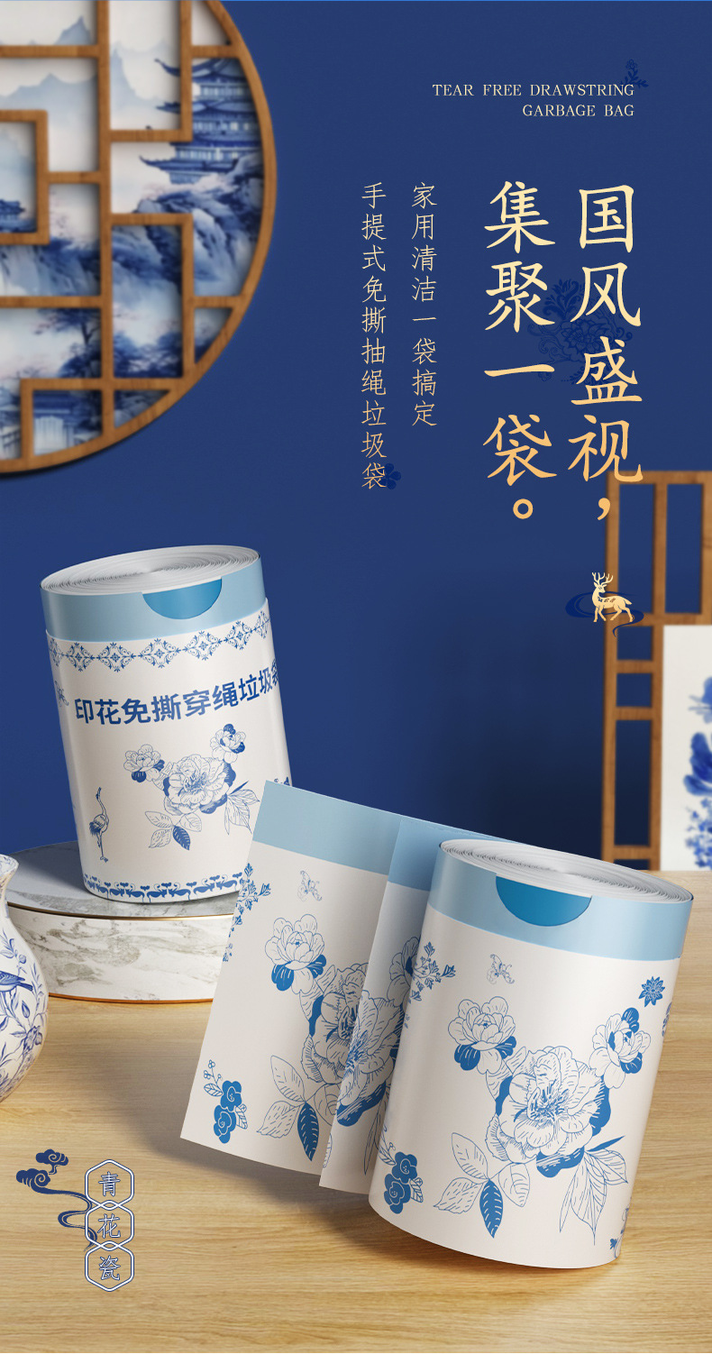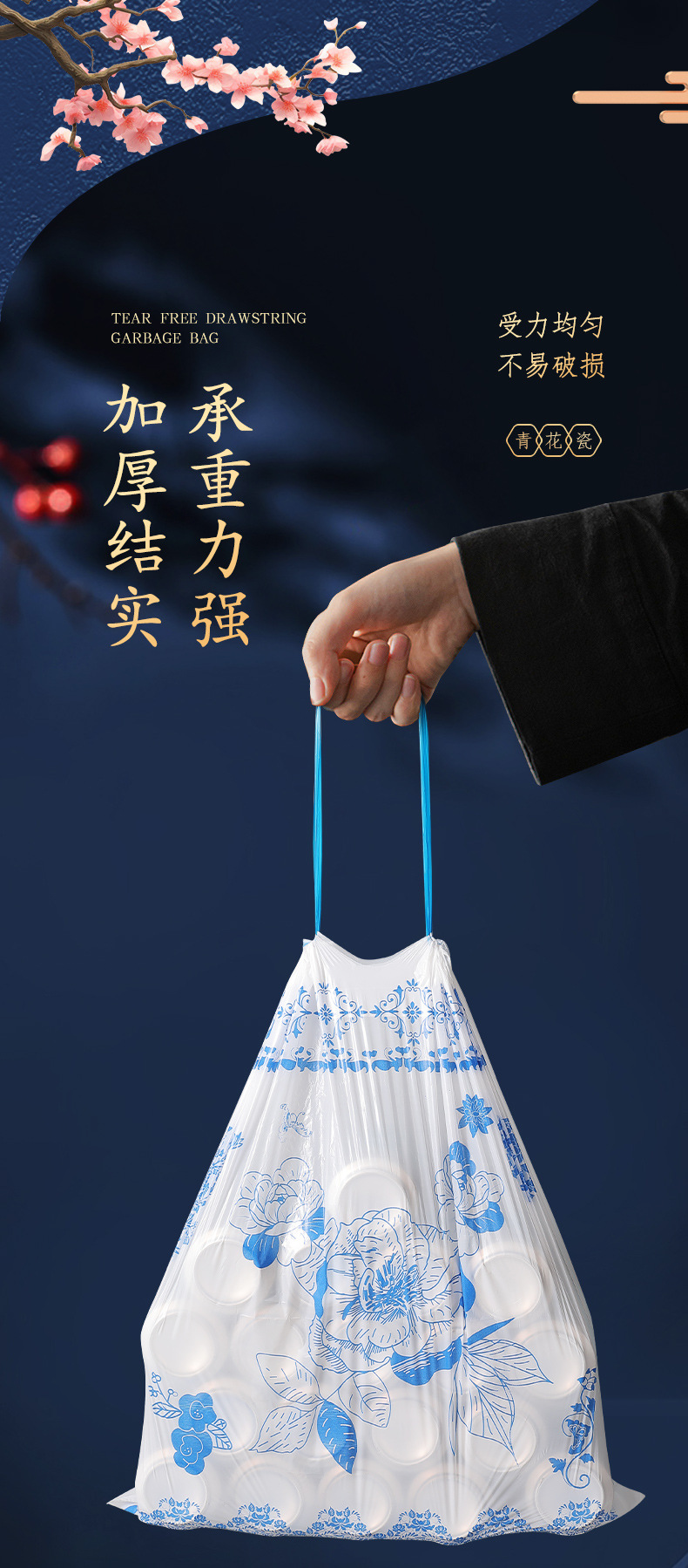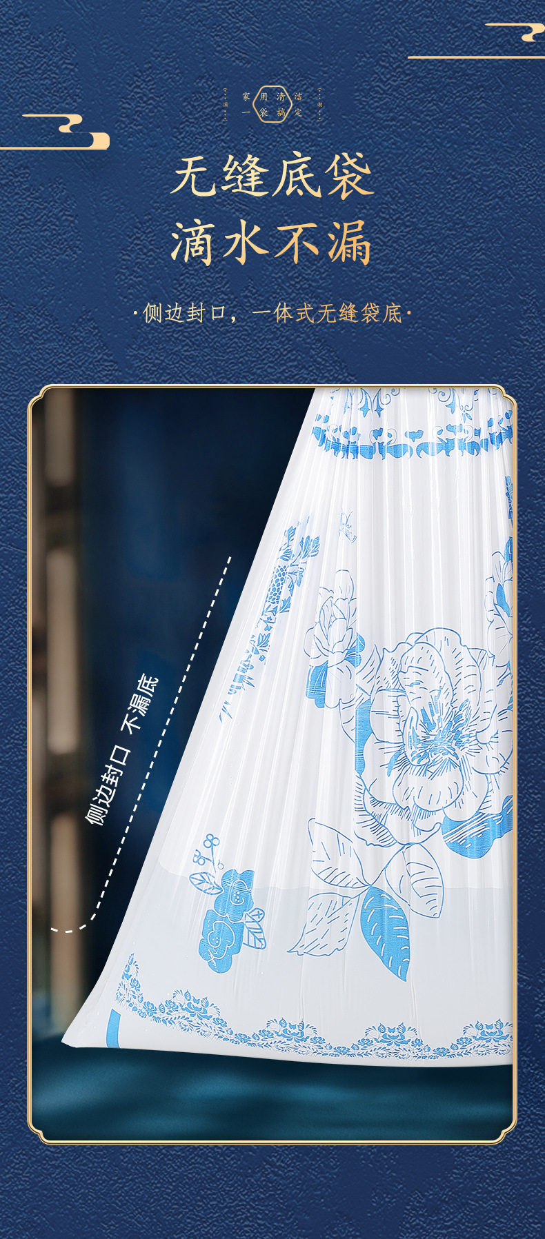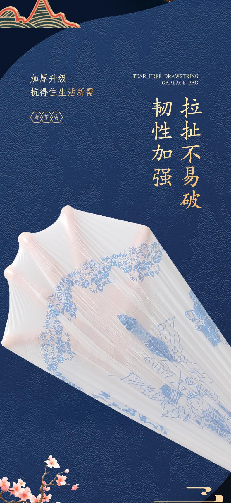 欧凯斯免撕抽绳垃圾袋 国风青花瓷彩色加厚抽取式大号印花垃圾袋