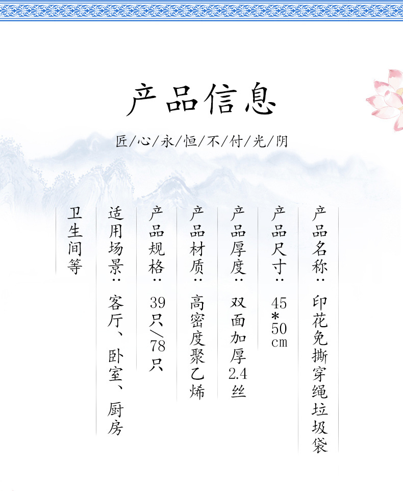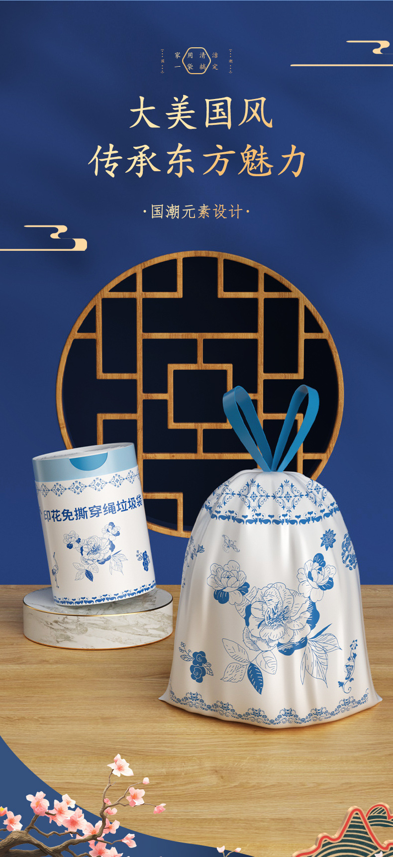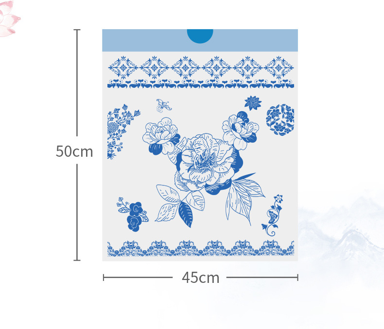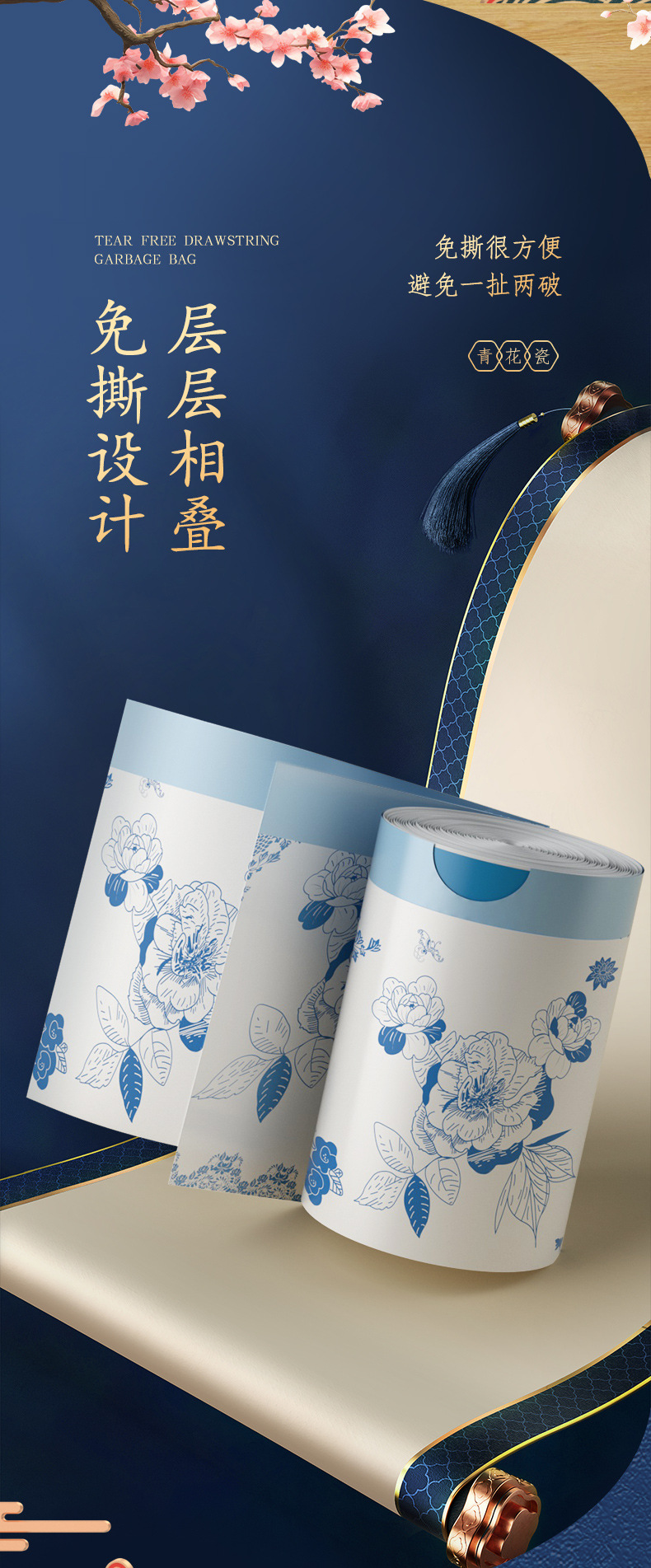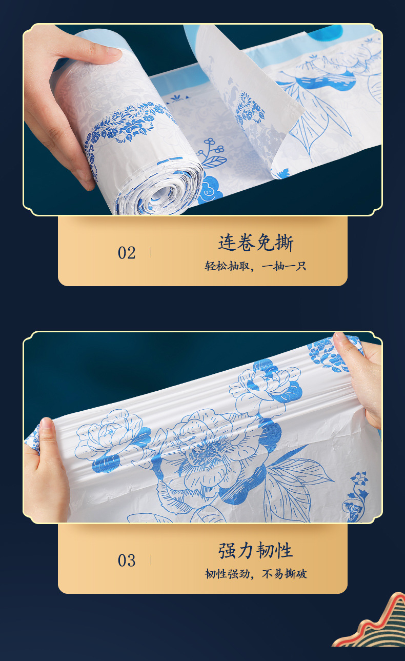 欧凯斯免撕抽绳垃圾袋 国风青花瓷彩色加厚抽取式大号印花垃圾袋