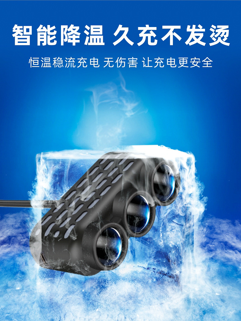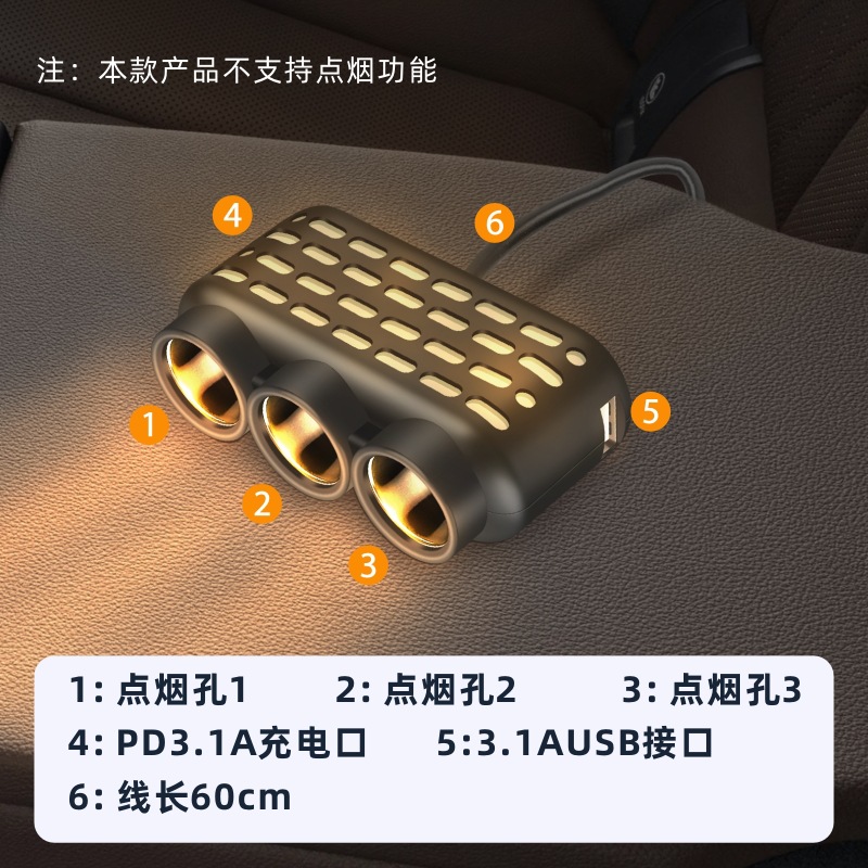 七彩灯车载一拖三点烟器充电器车充QC3.0+USB+PD快充接口