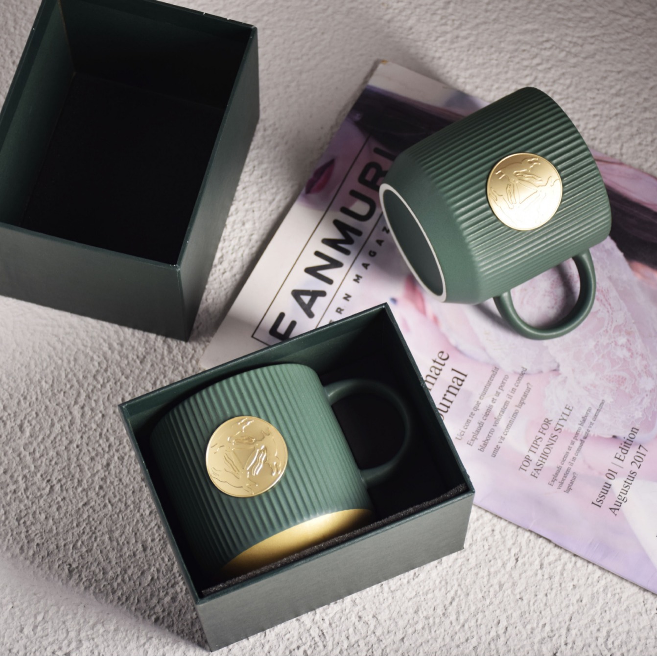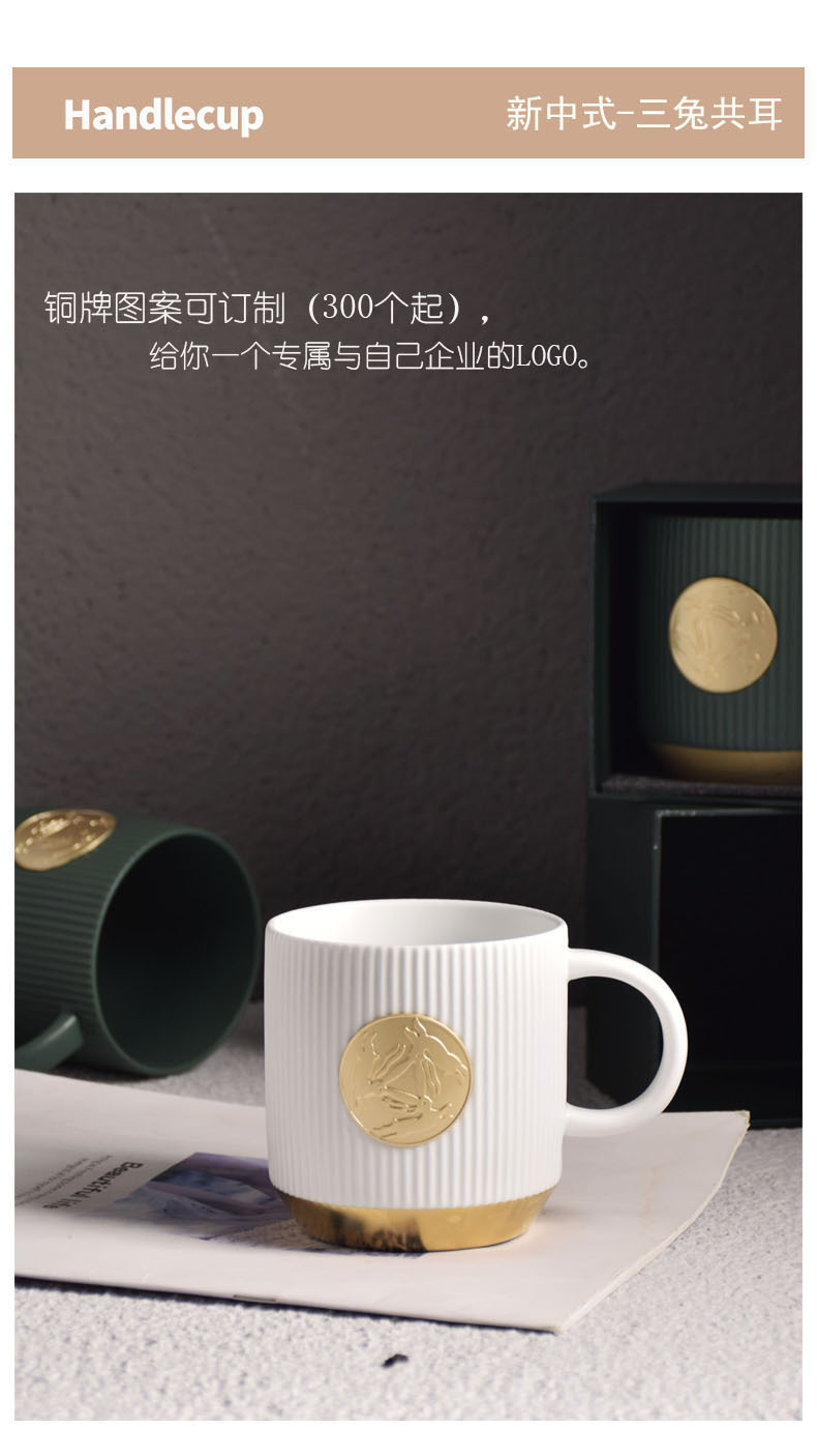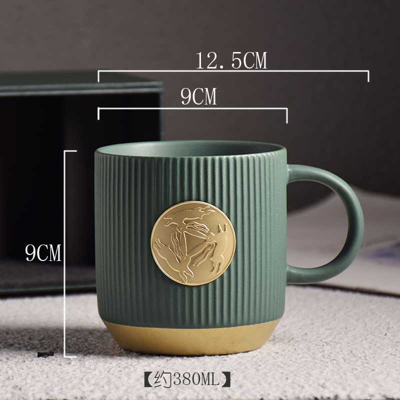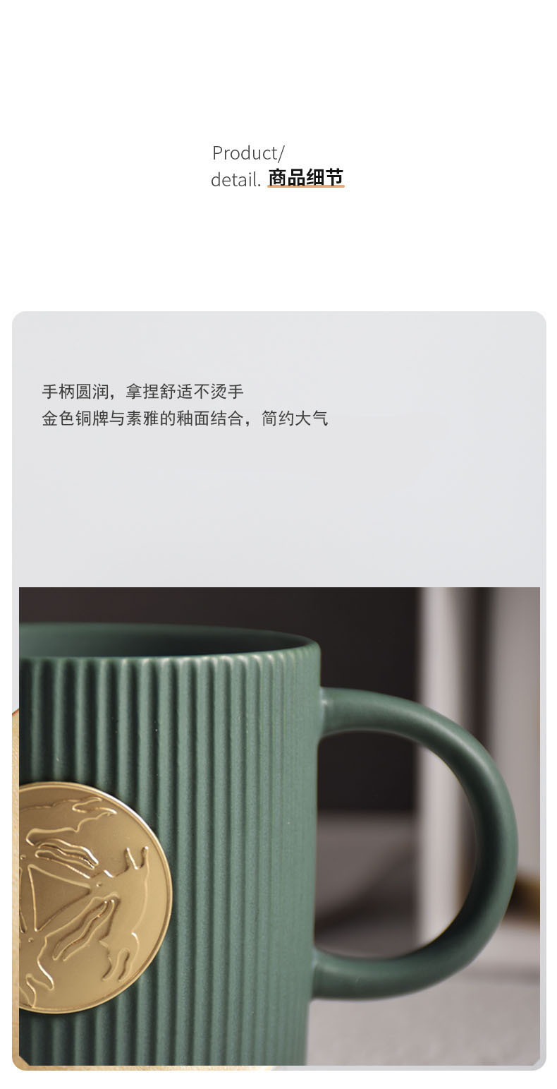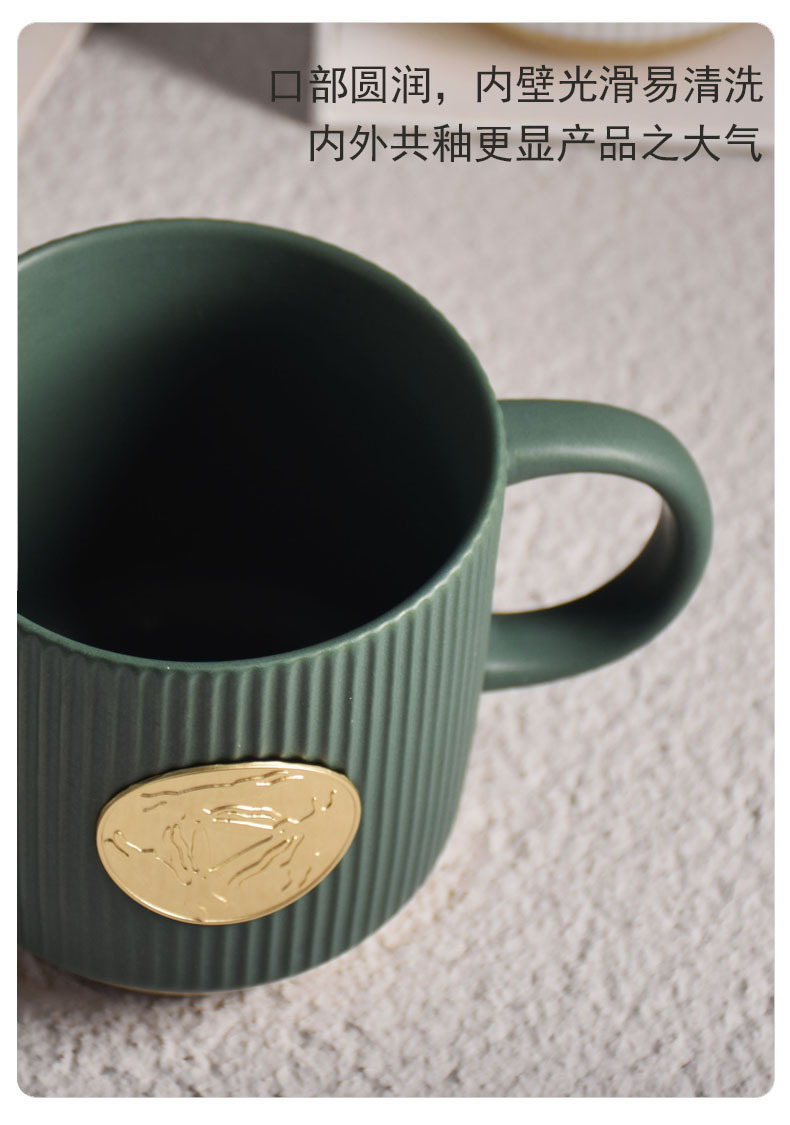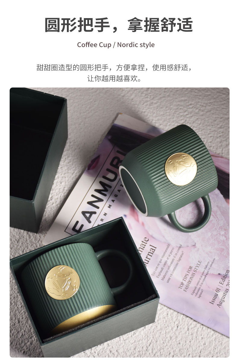 北欧风陶瓷咖啡杯竖条纹铜章马克杯办公室水杯牛奶杯伴手礼印Logo