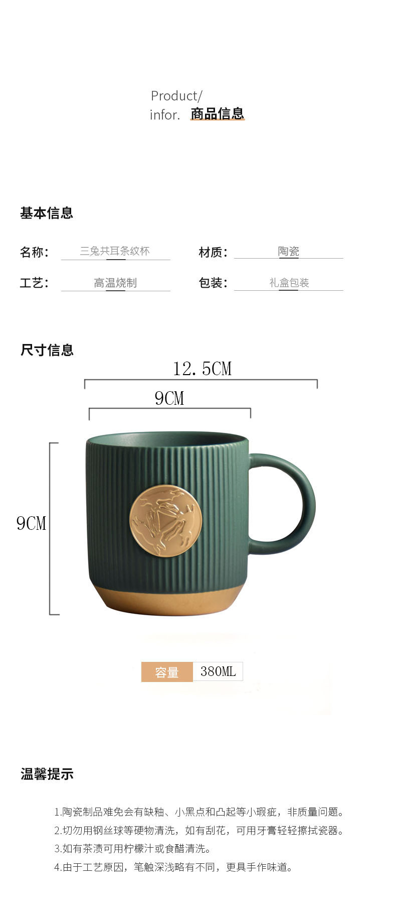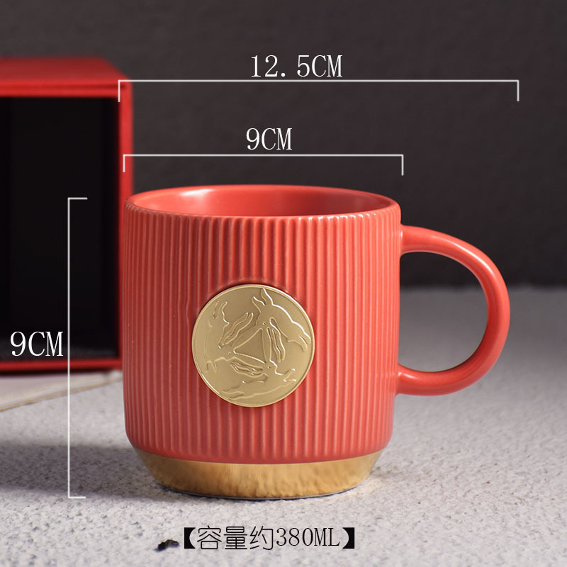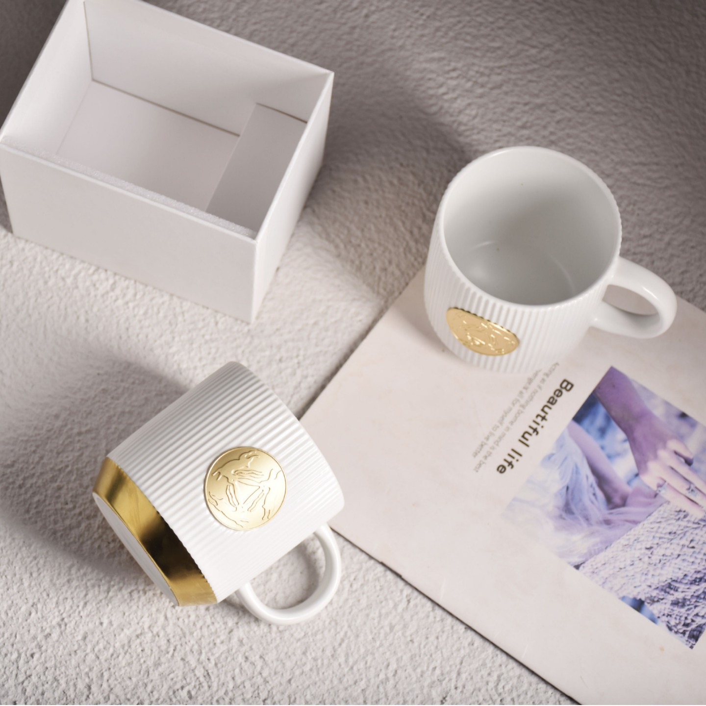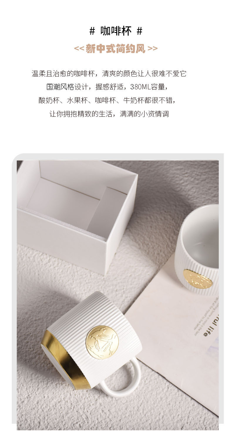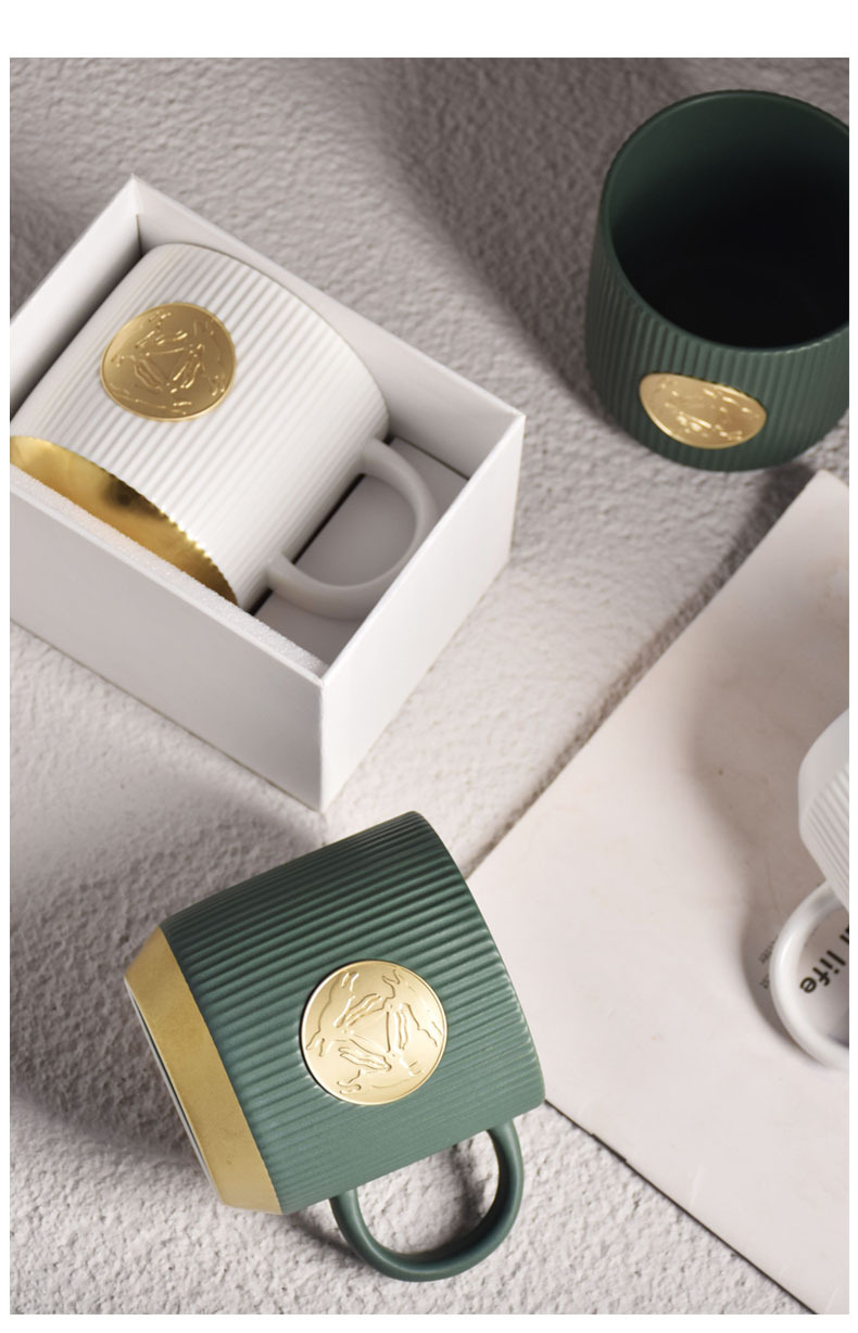 北欧风陶瓷咖啡杯竖条纹铜章马克杯办公室水杯牛奶杯伴手礼印Logo