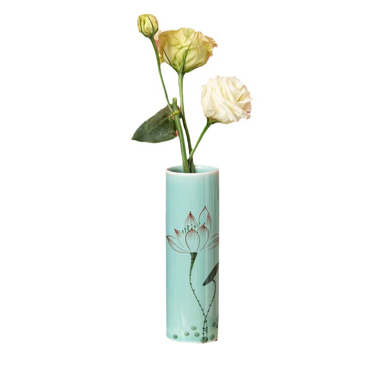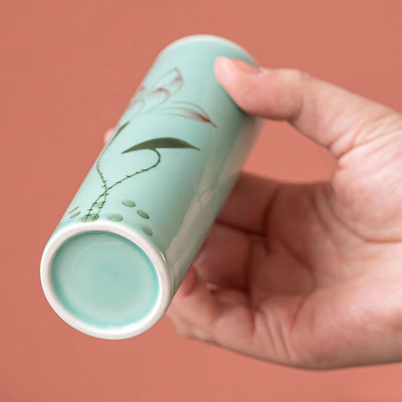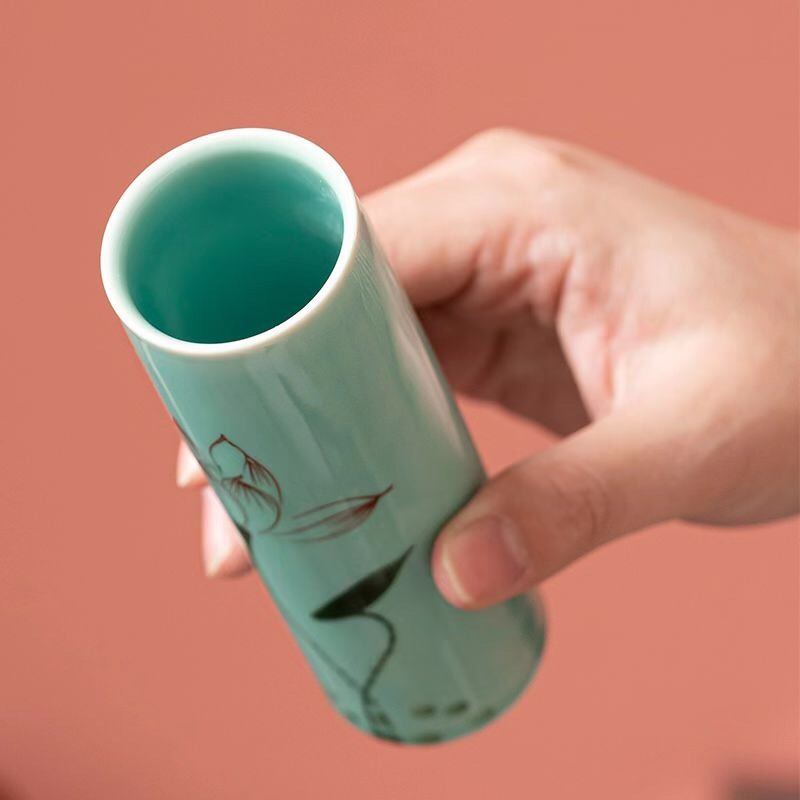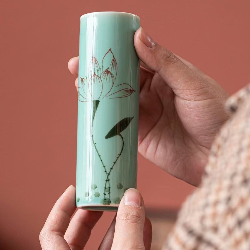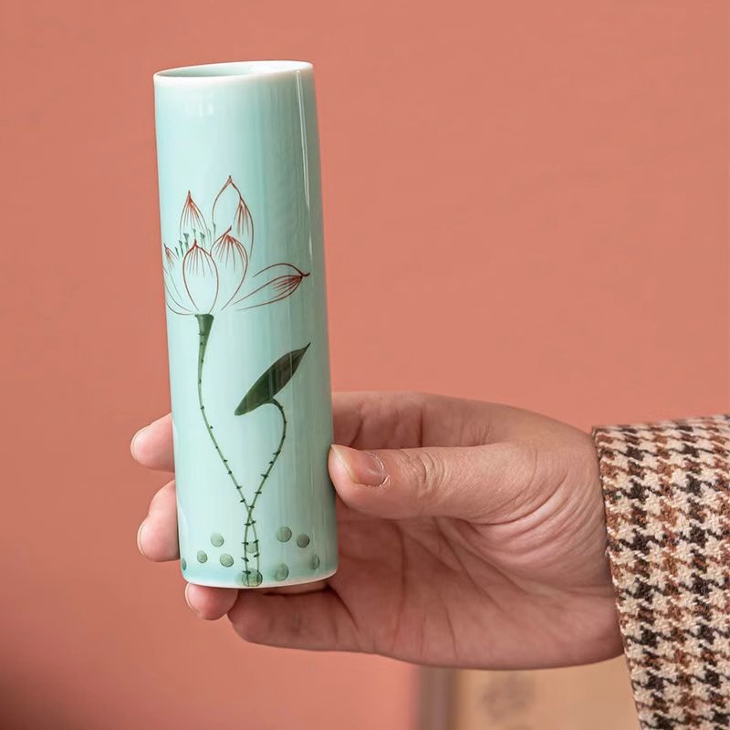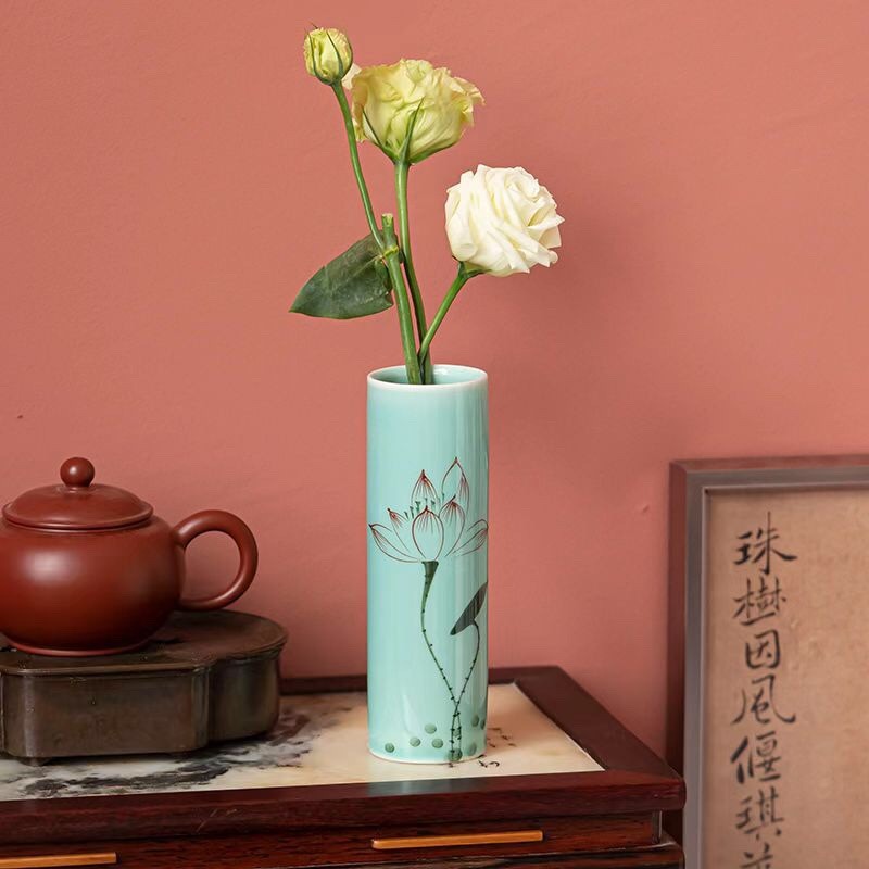 陶瓷手绘荷花摆件花瓶家居收纳笔筒插花摆茶桌面中式花瓶摆件花器