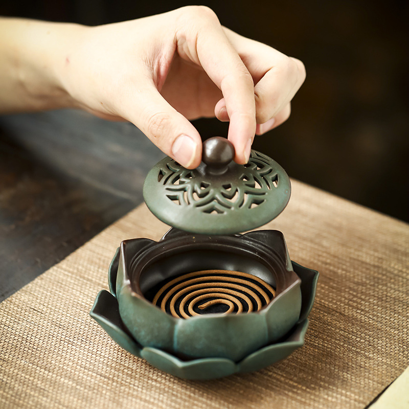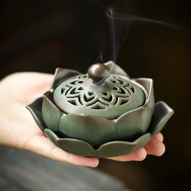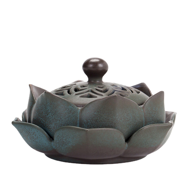 陶瓷莲花香炉 檀香家用香道摆件荷花薰香炉创意香炉香道批发代发
