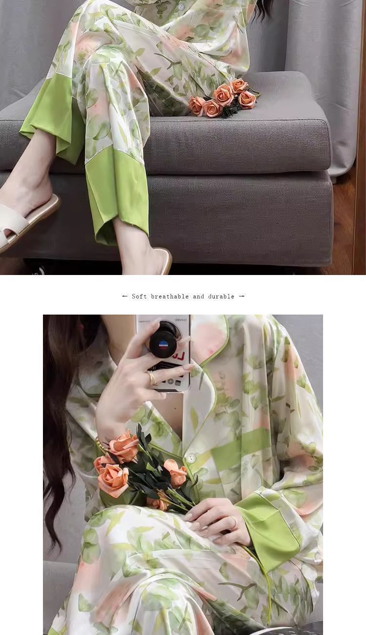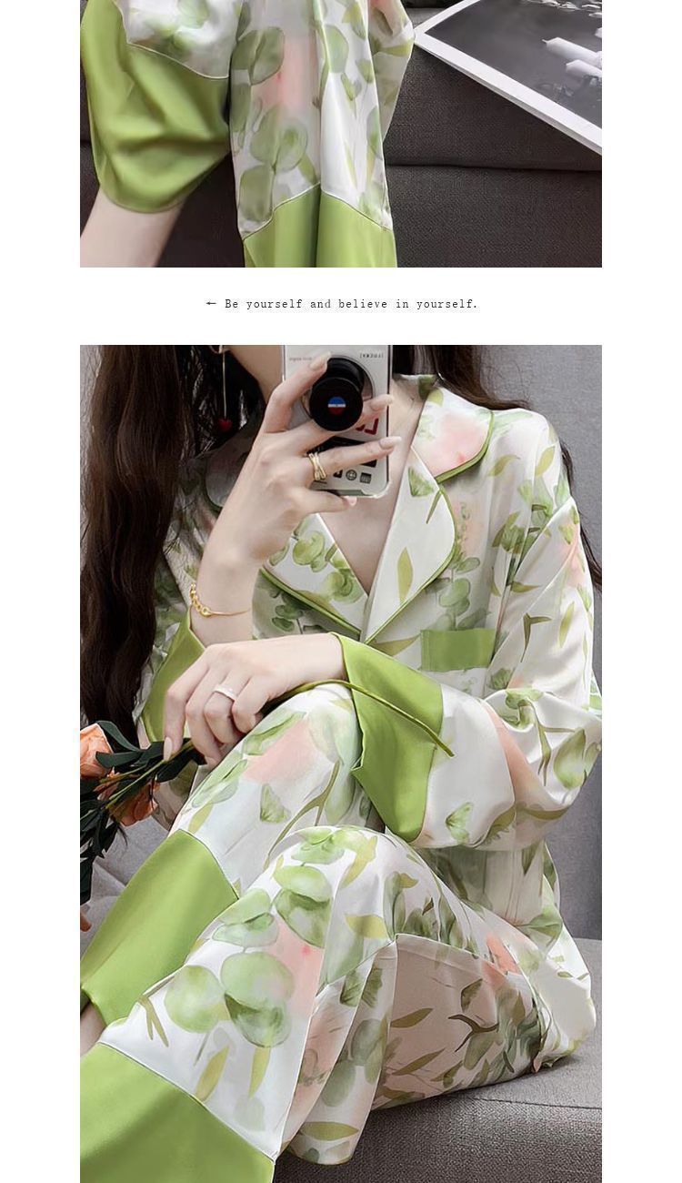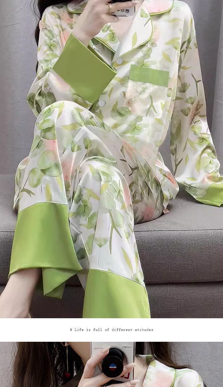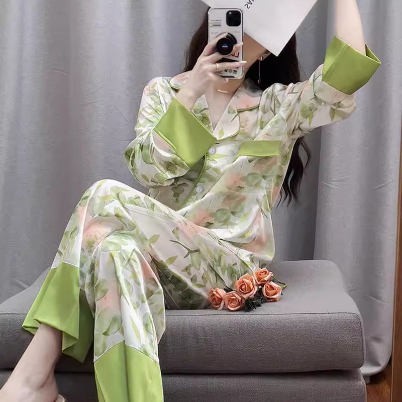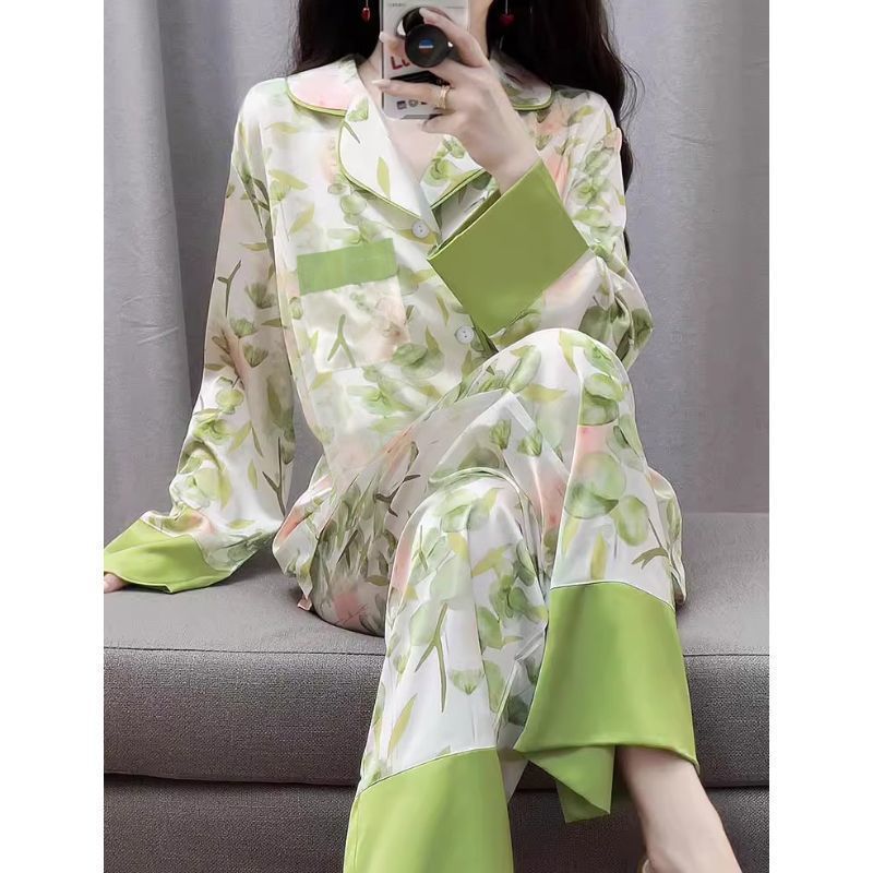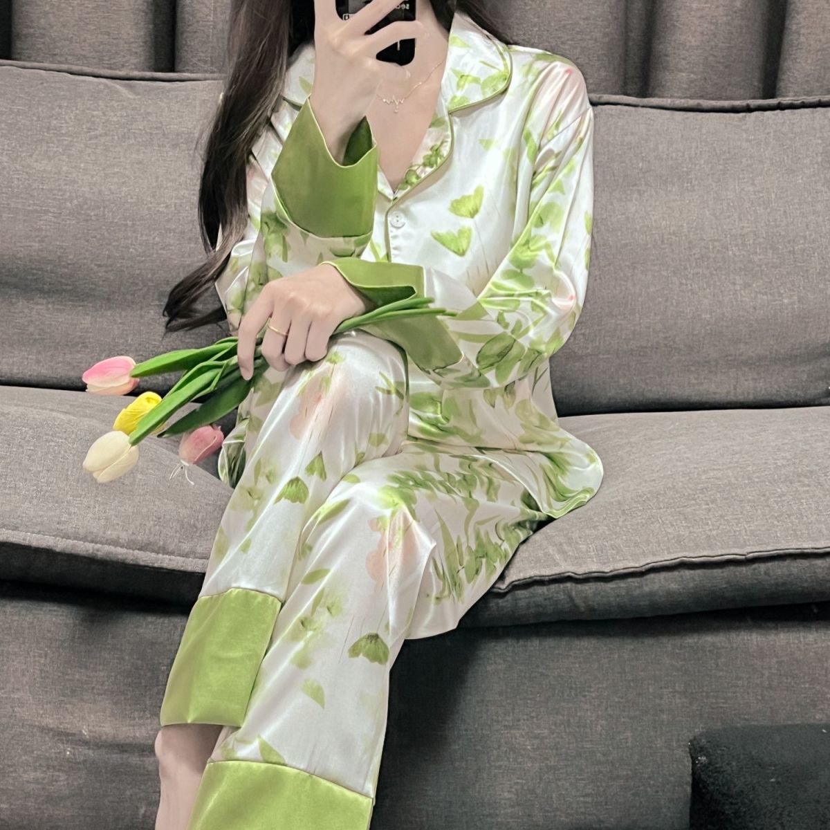高级感绿色花卉印花冰丝睡衣女春秋季2024新款长袖套装丝绸家居服