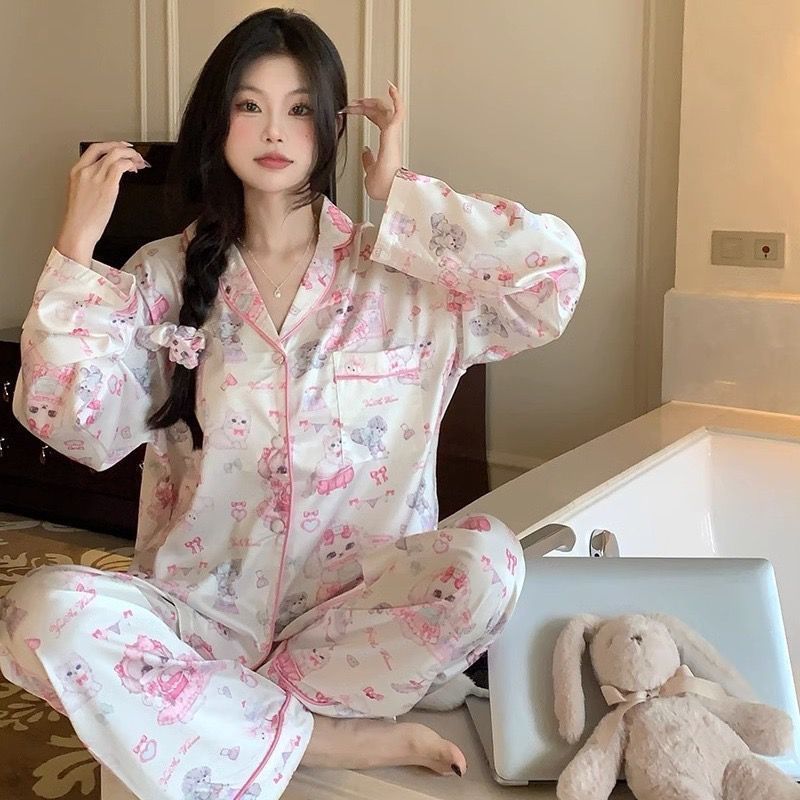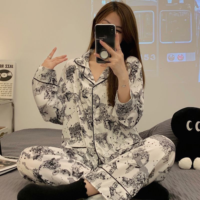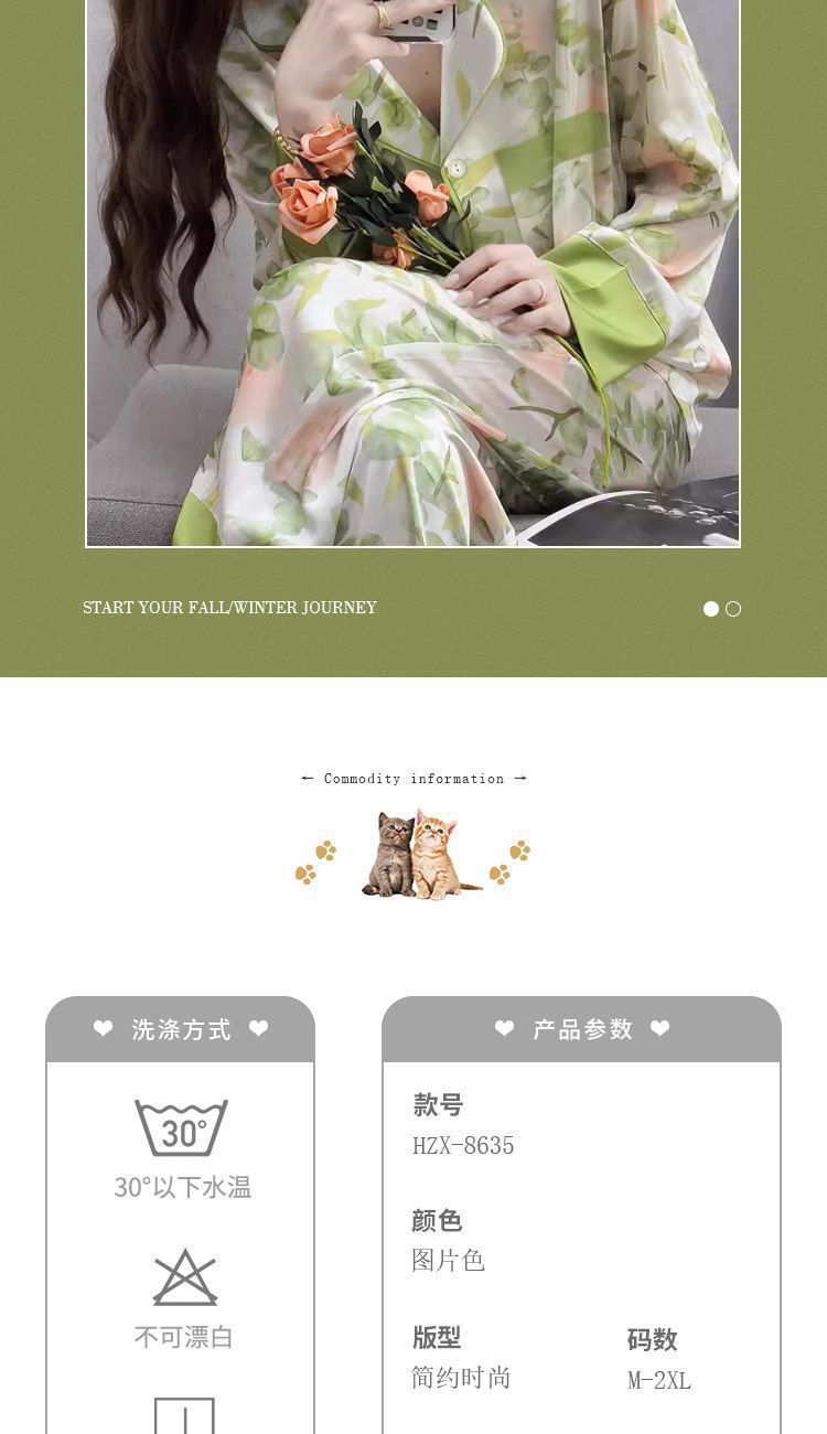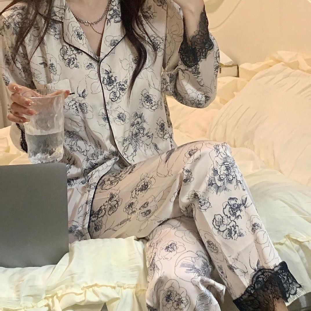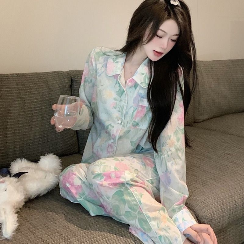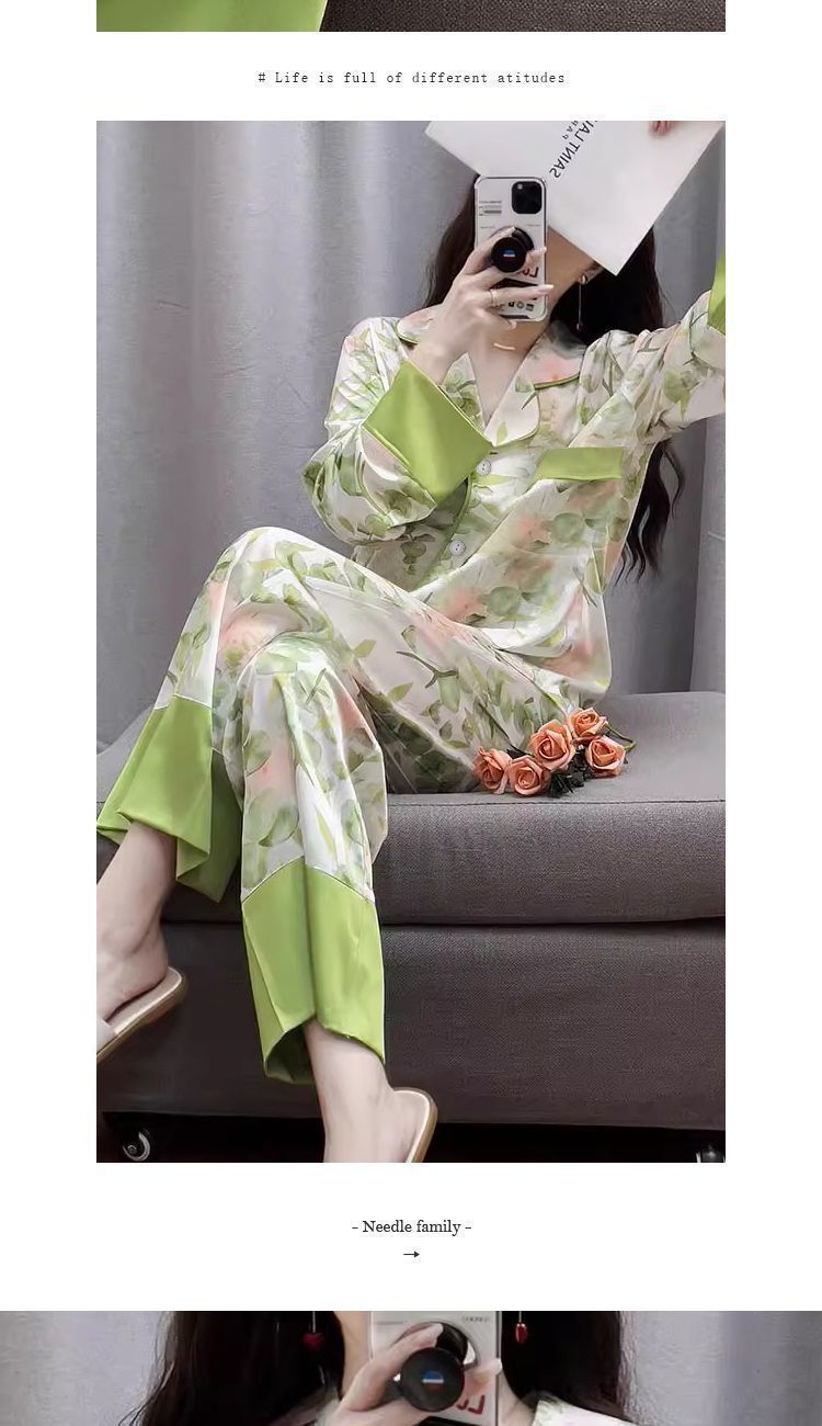 高级感绿色花卉印花冰丝睡衣女春秋季2024新款长袖套装丝绸家居服