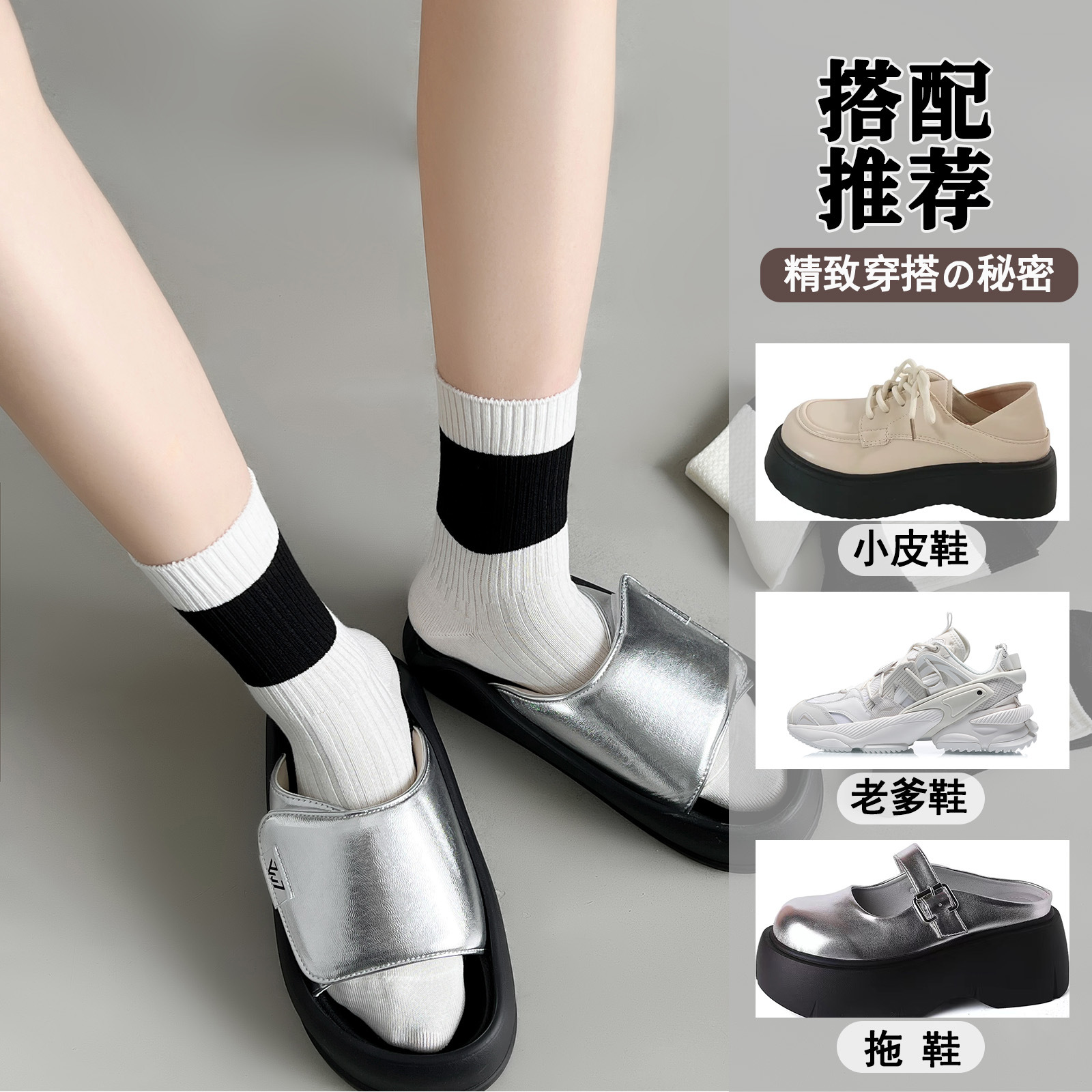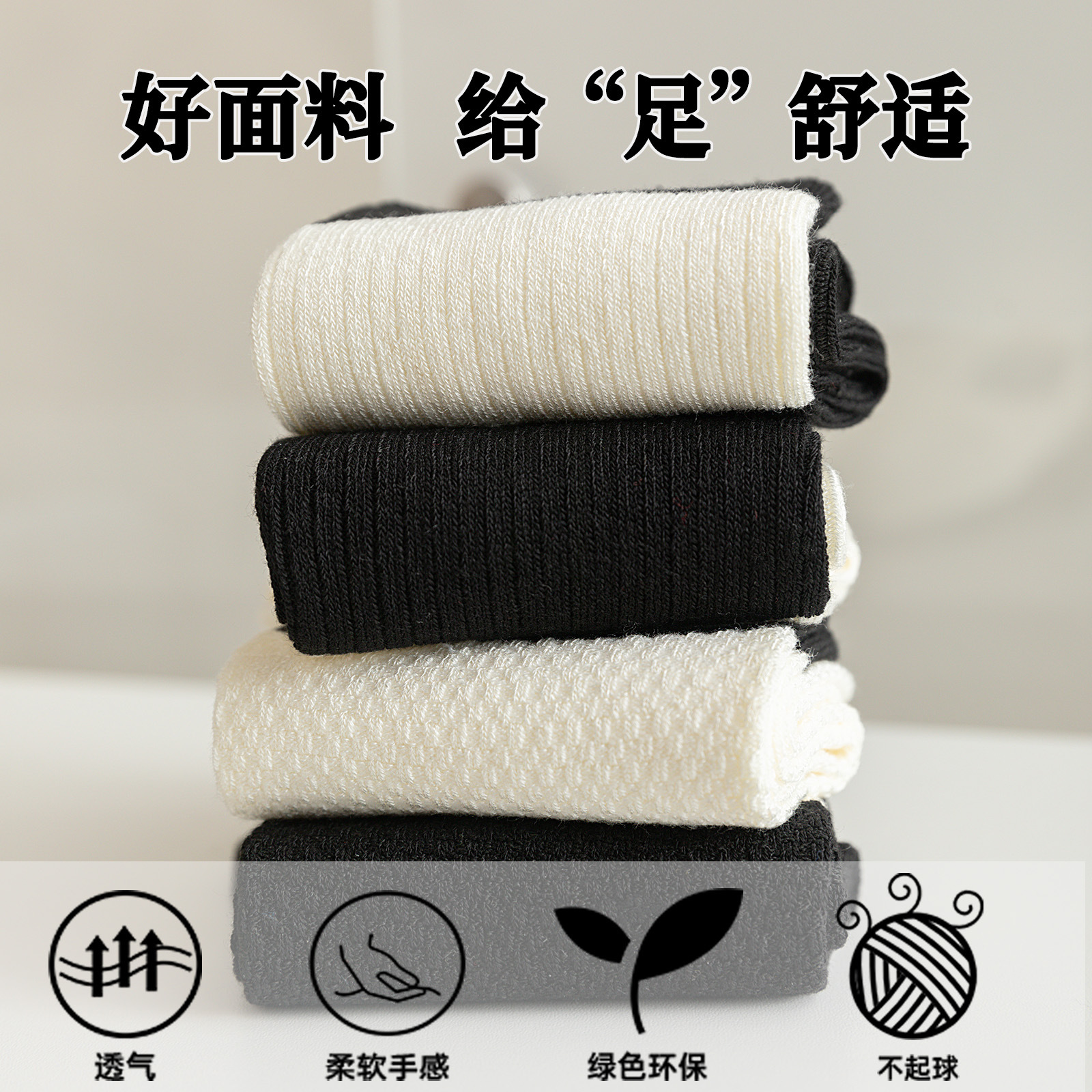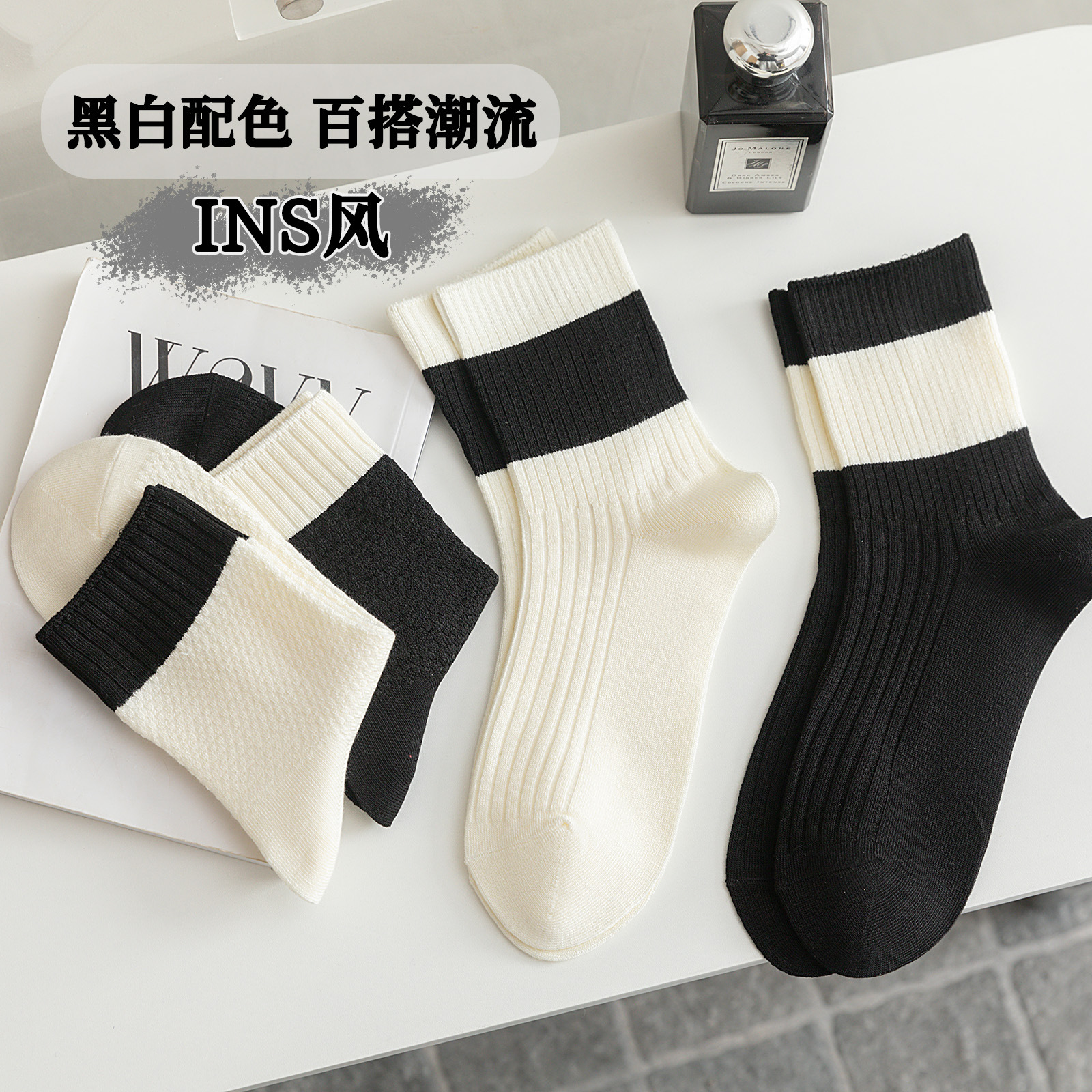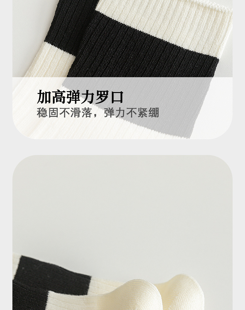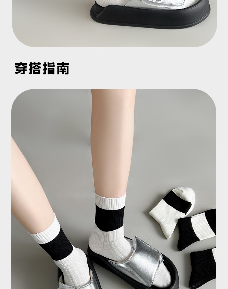 袜子女春夏薄款双针中筒袜黑白拼色吸汗防臭运动休闲百搭堆堆袜子