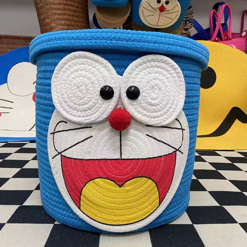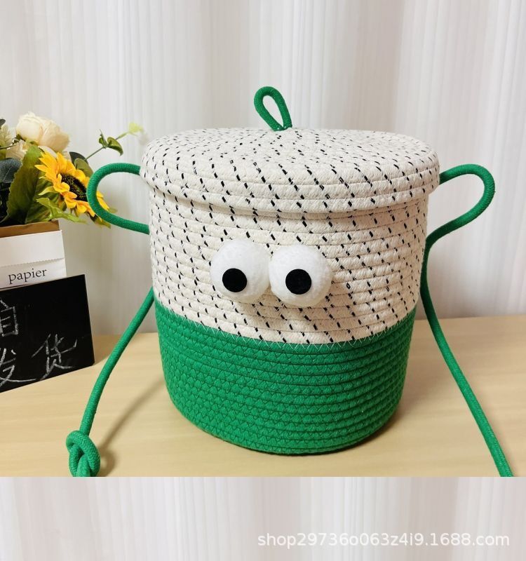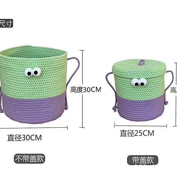 卡通圆形布艺收纳桶玩具桌面编织收纳筐带盖零食储物盒大眼怪兽
