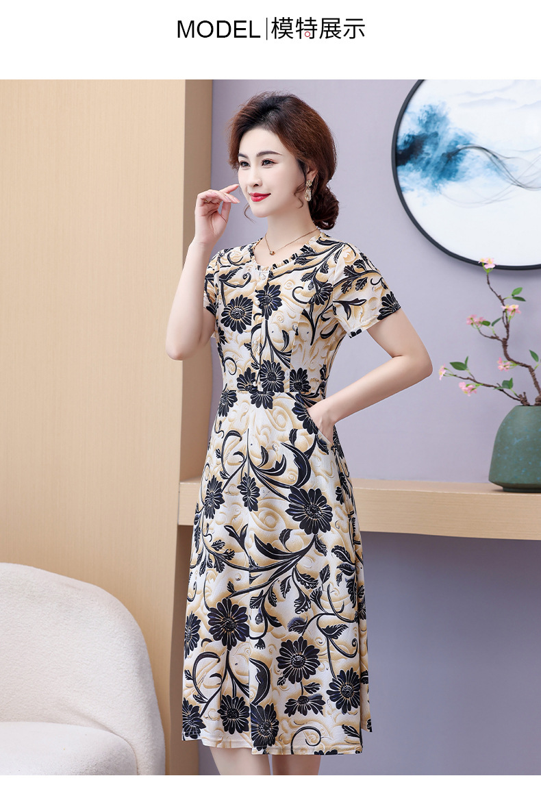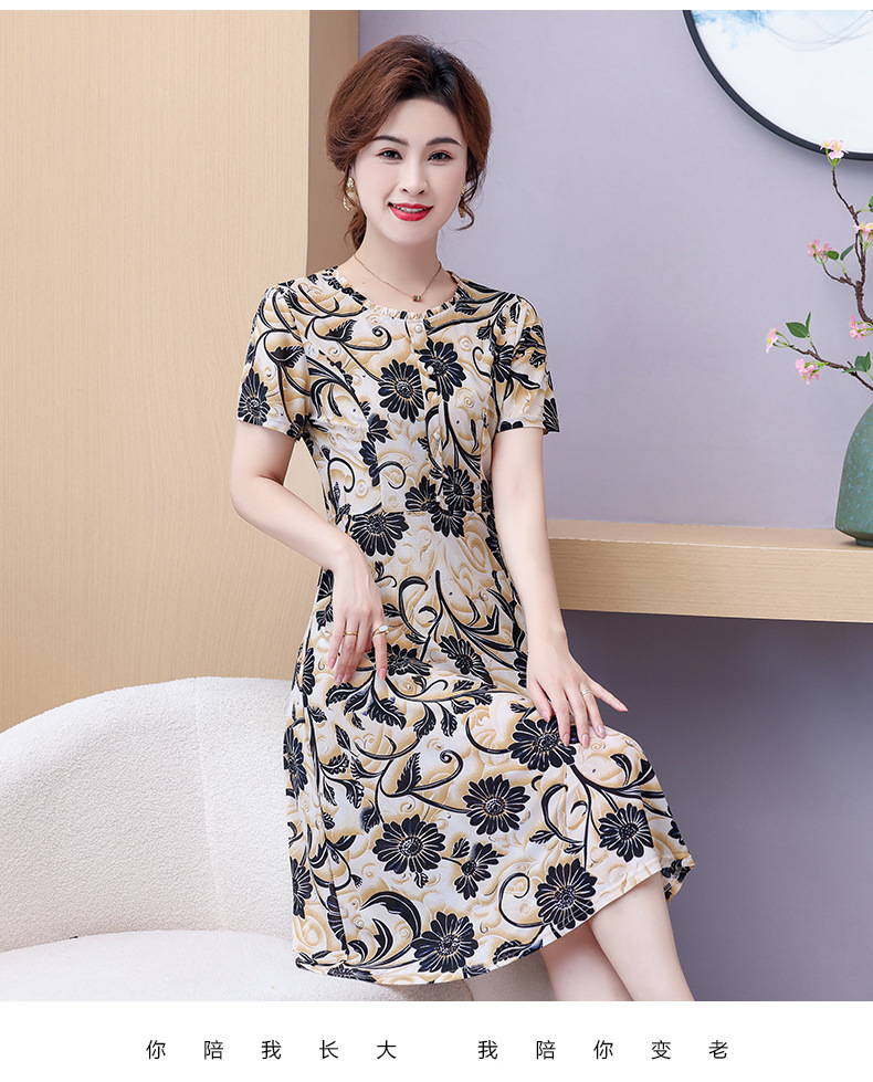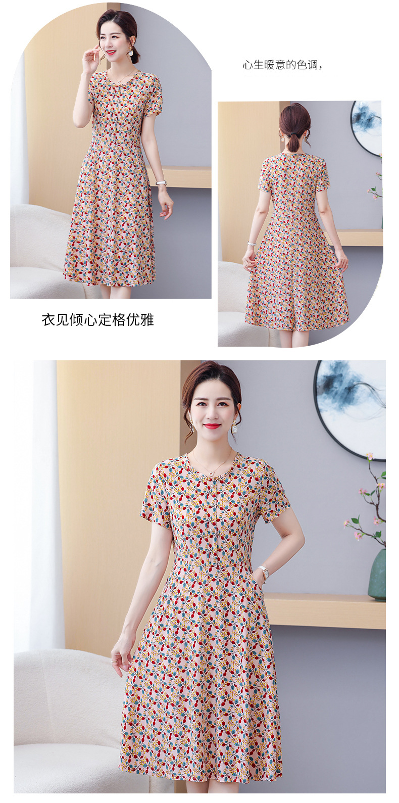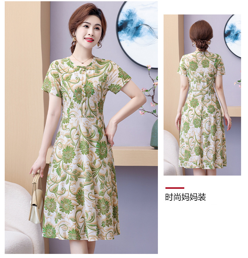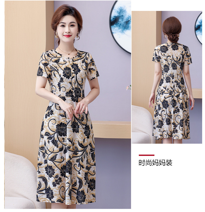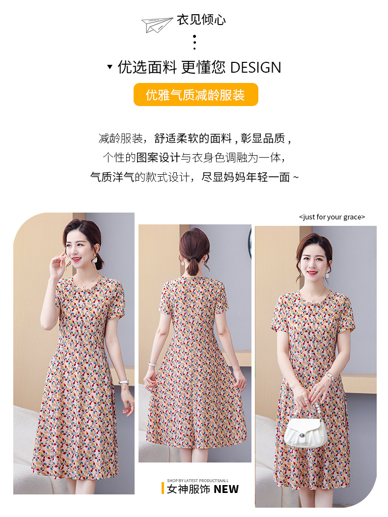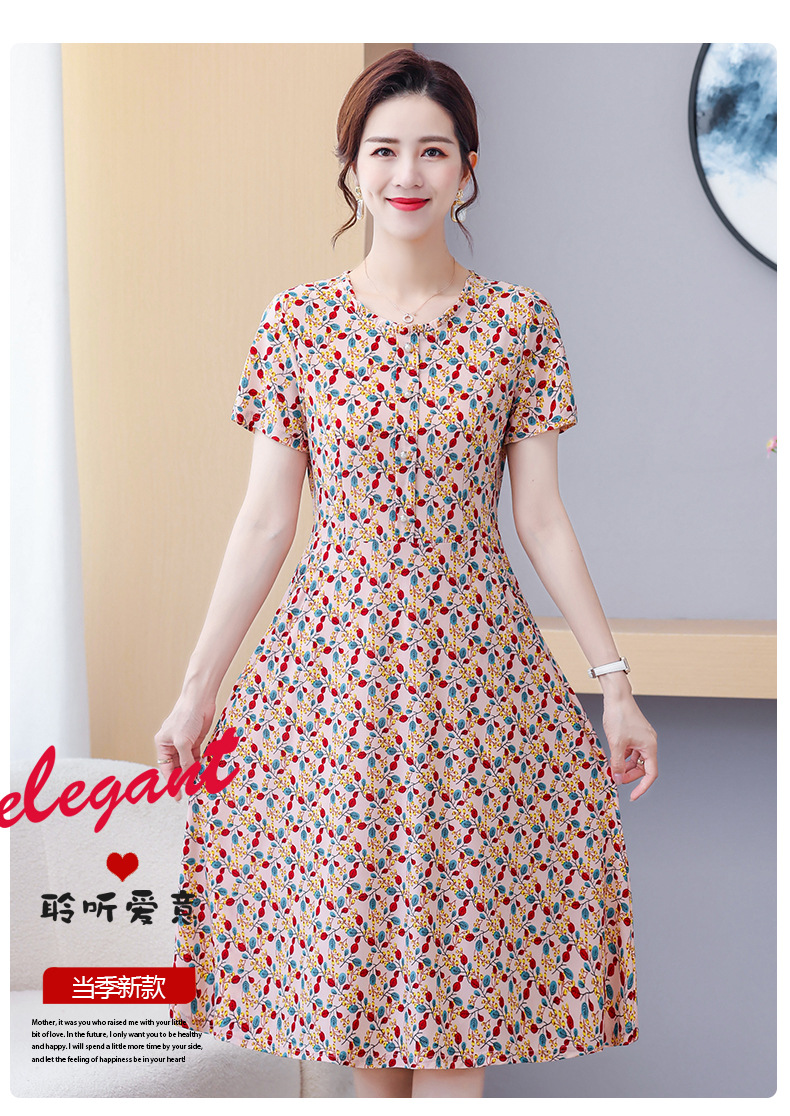 中年妈妈夏季碎花短袖圆领过膝连衣裙2024新款秋装收腰A字版裙子