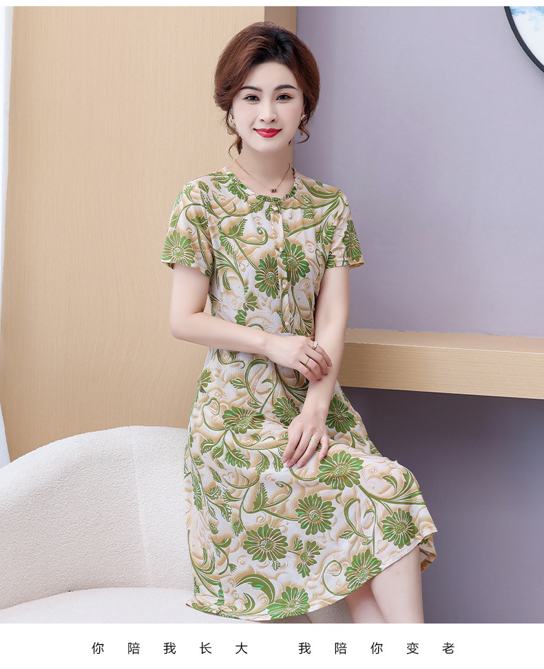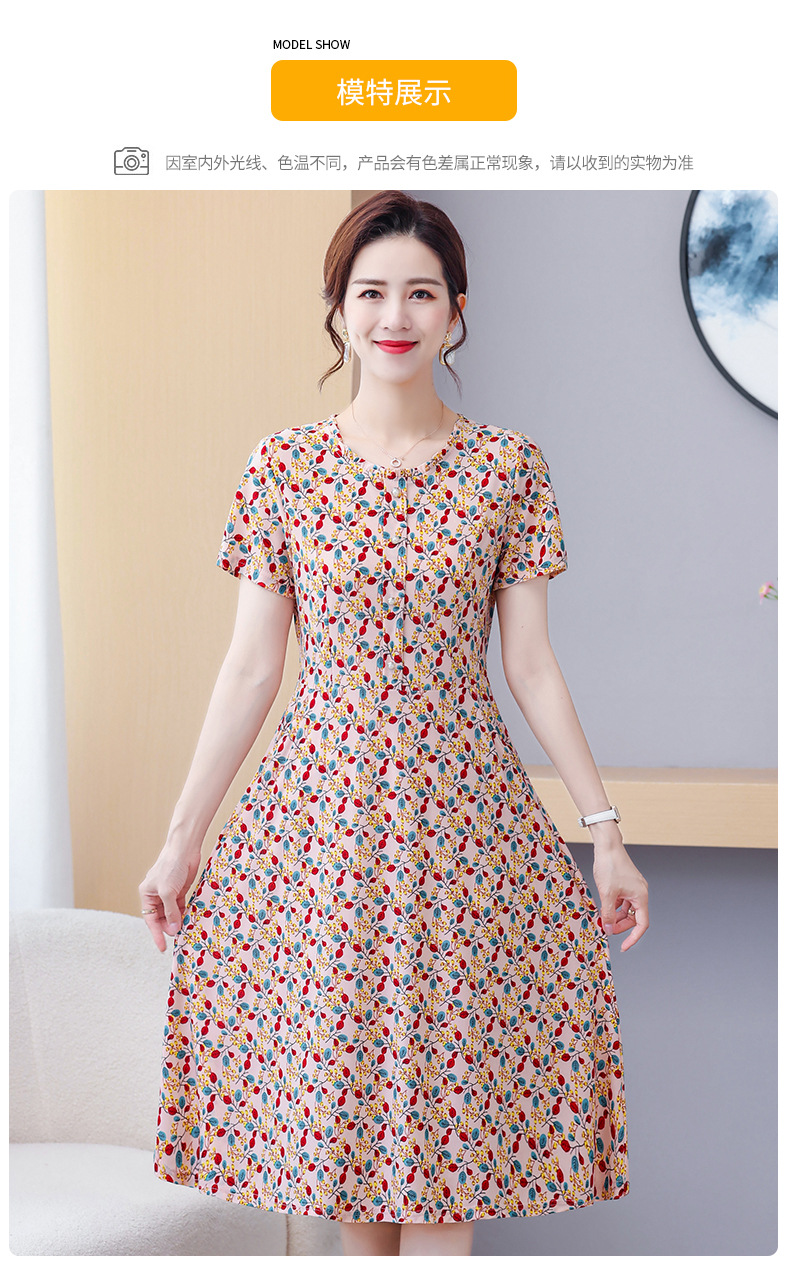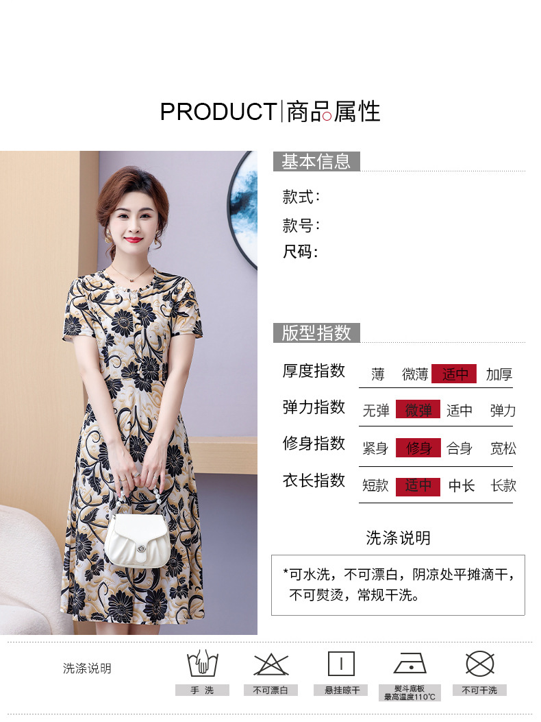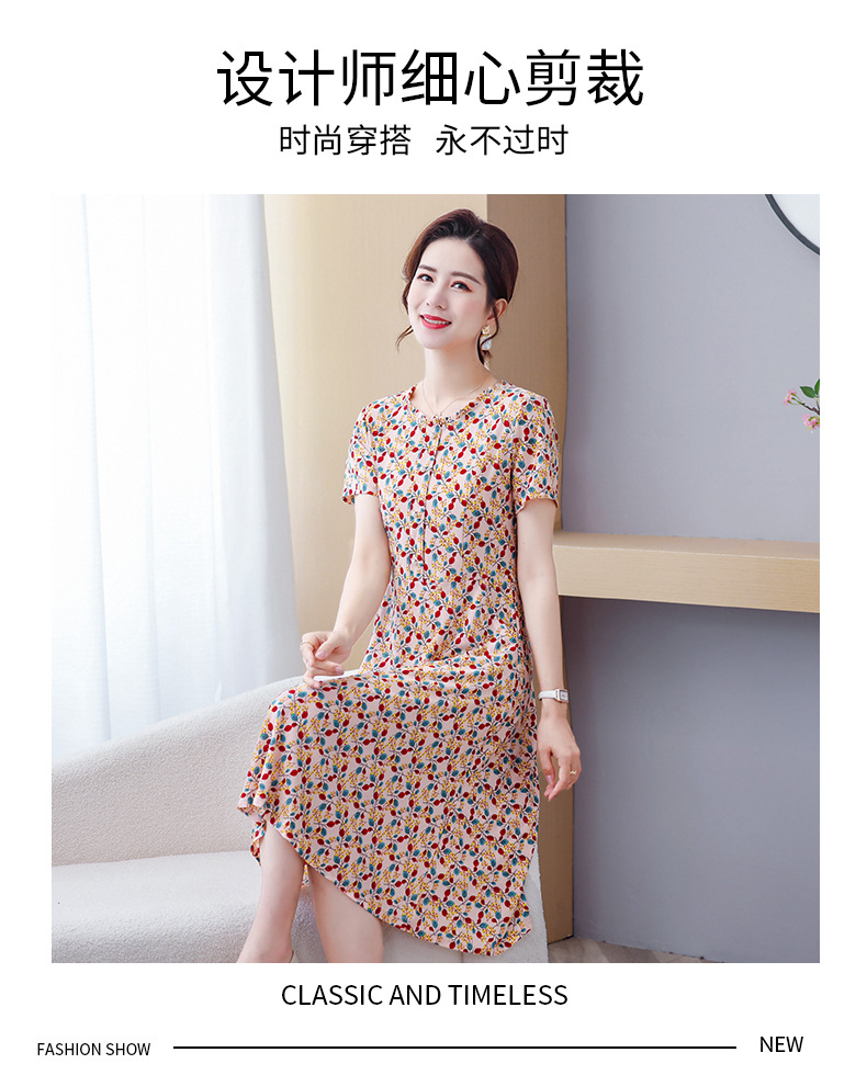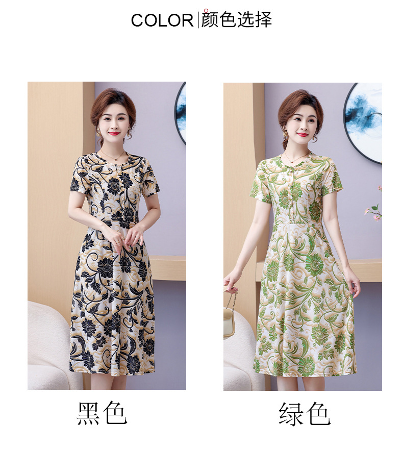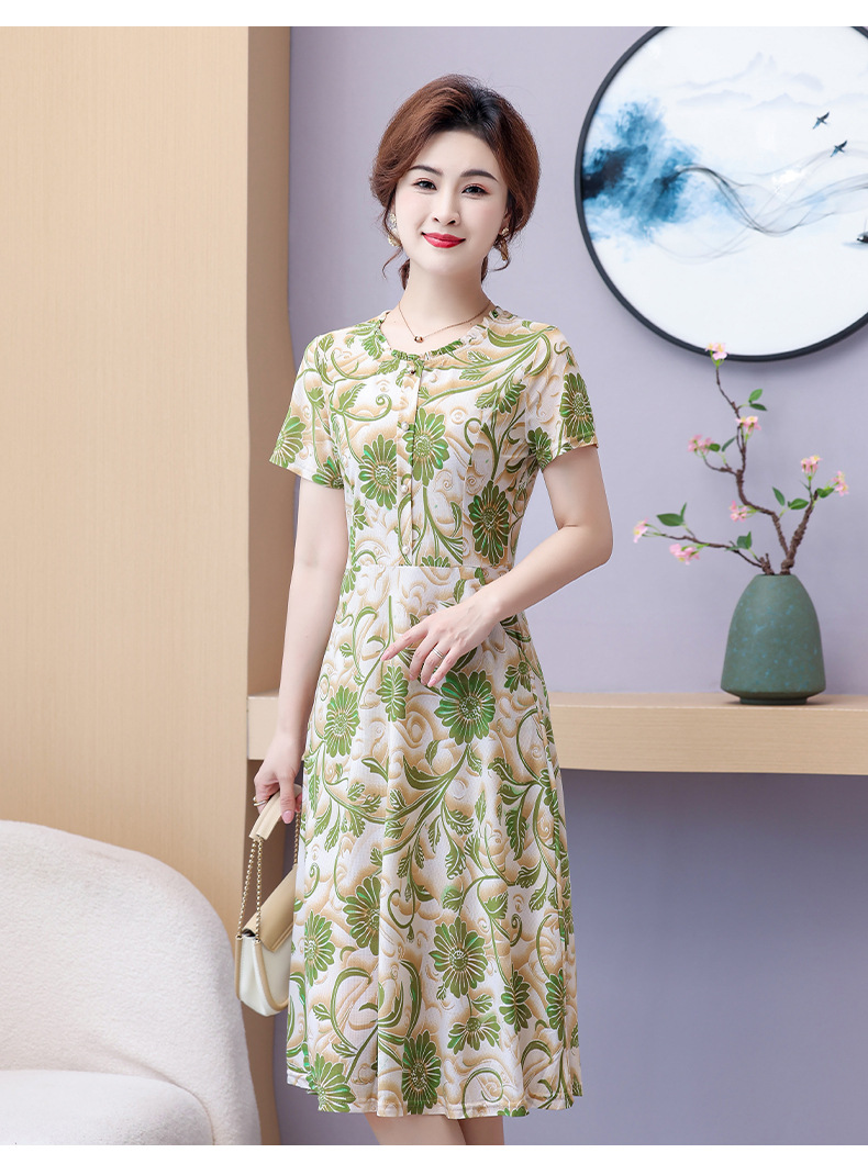 中年妈妈夏季碎花短袖圆领过膝连衣裙2024新款秋装收腰A字版裙子