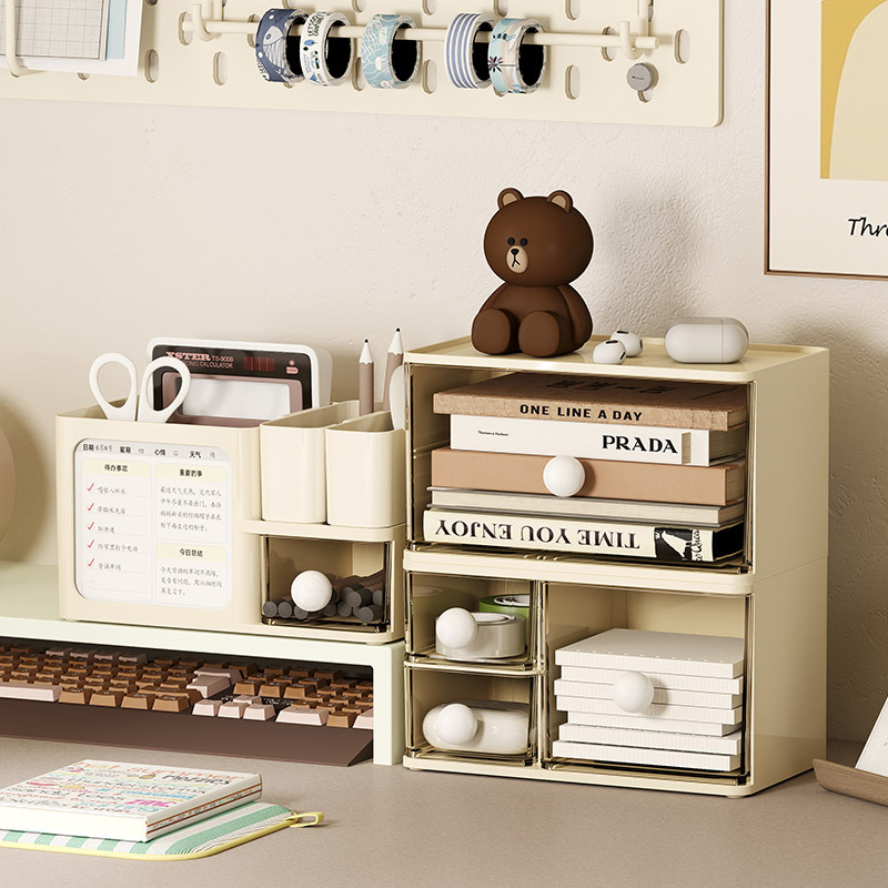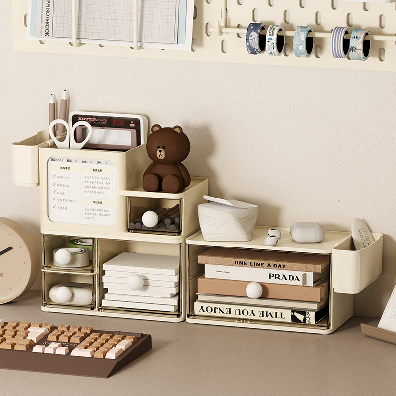 居家日用抽屉式桌面收纳盒储物盒文具杂物奶油风书房收纳架防尘