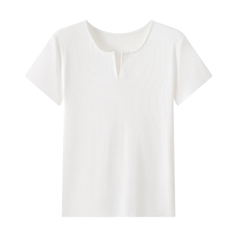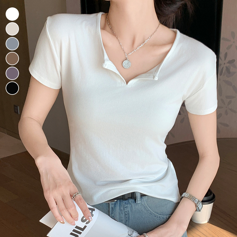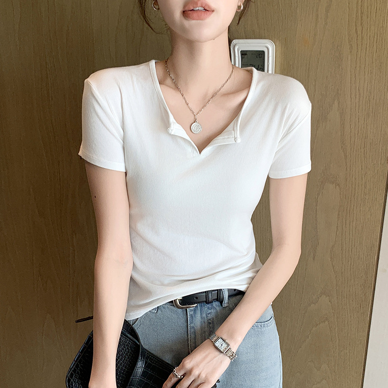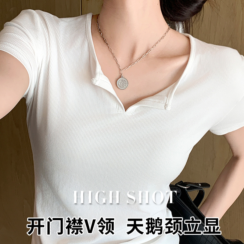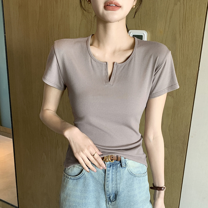 8710夏新款韩版气质半开领修身短袖T恤女小个子休闲百搭短款上衣