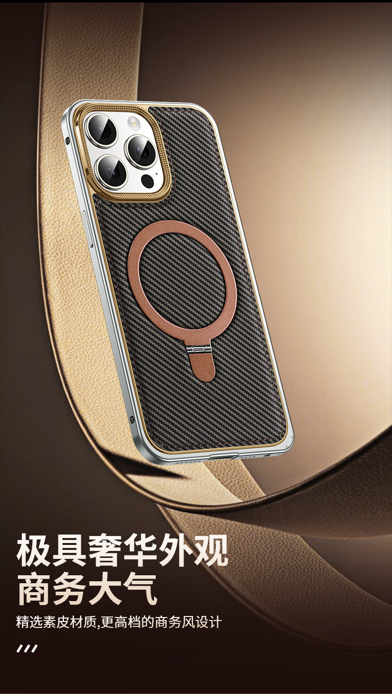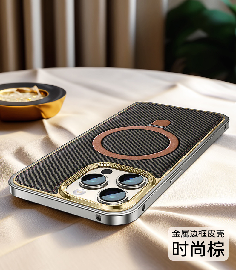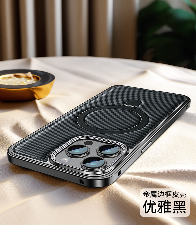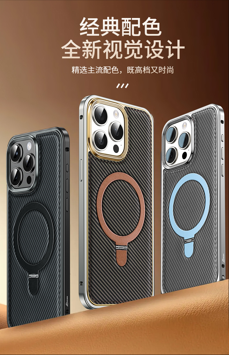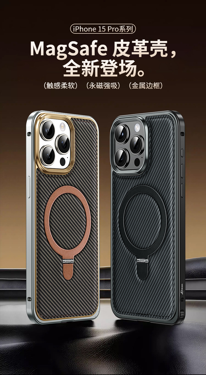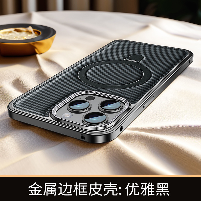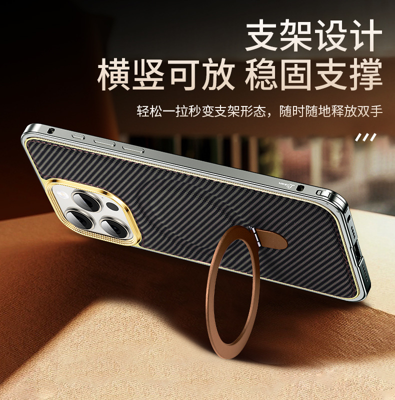 新款适用苹果15弹力扣金属边框碳纤纹支架手机壳iPhone14保护套