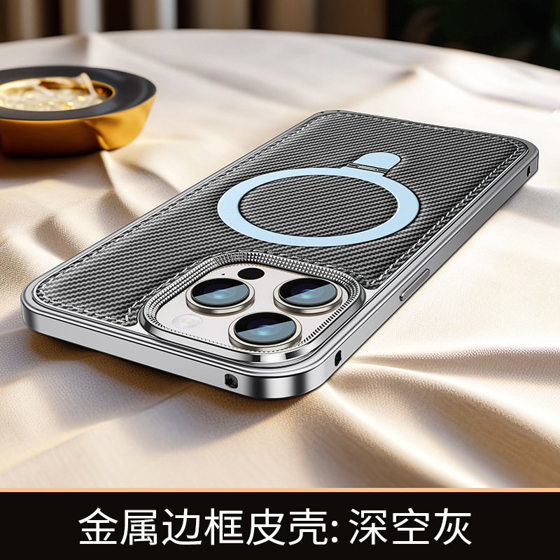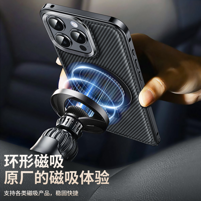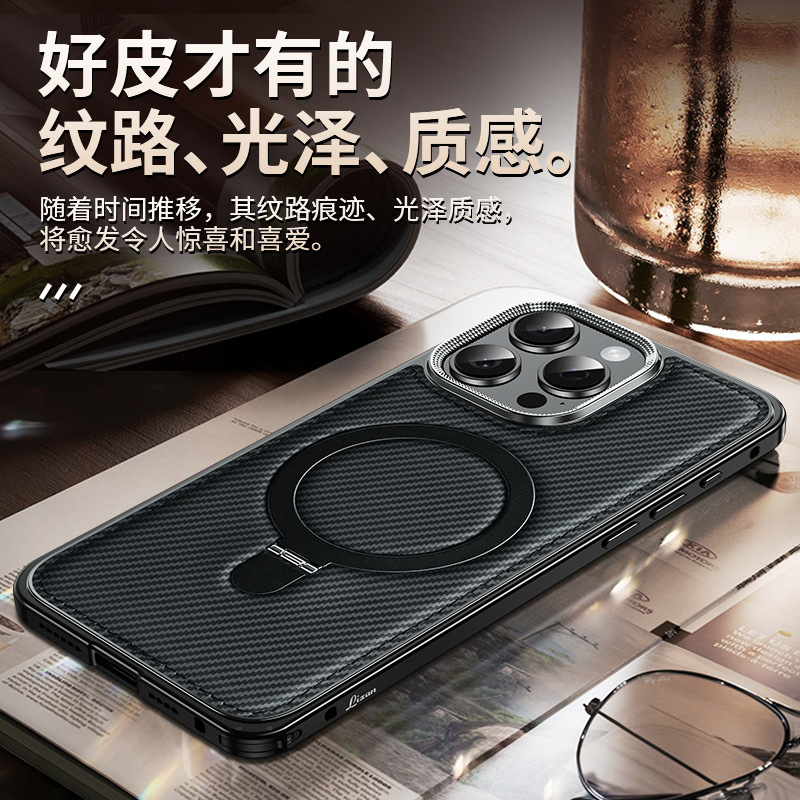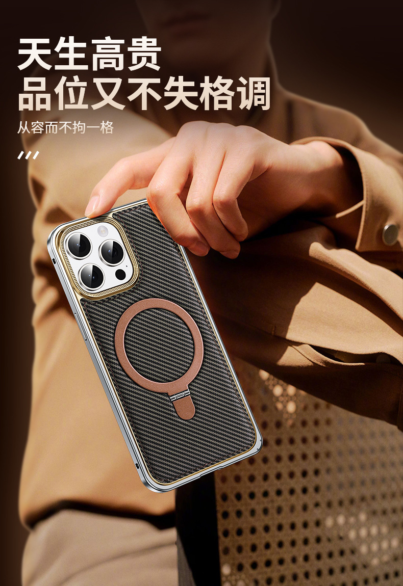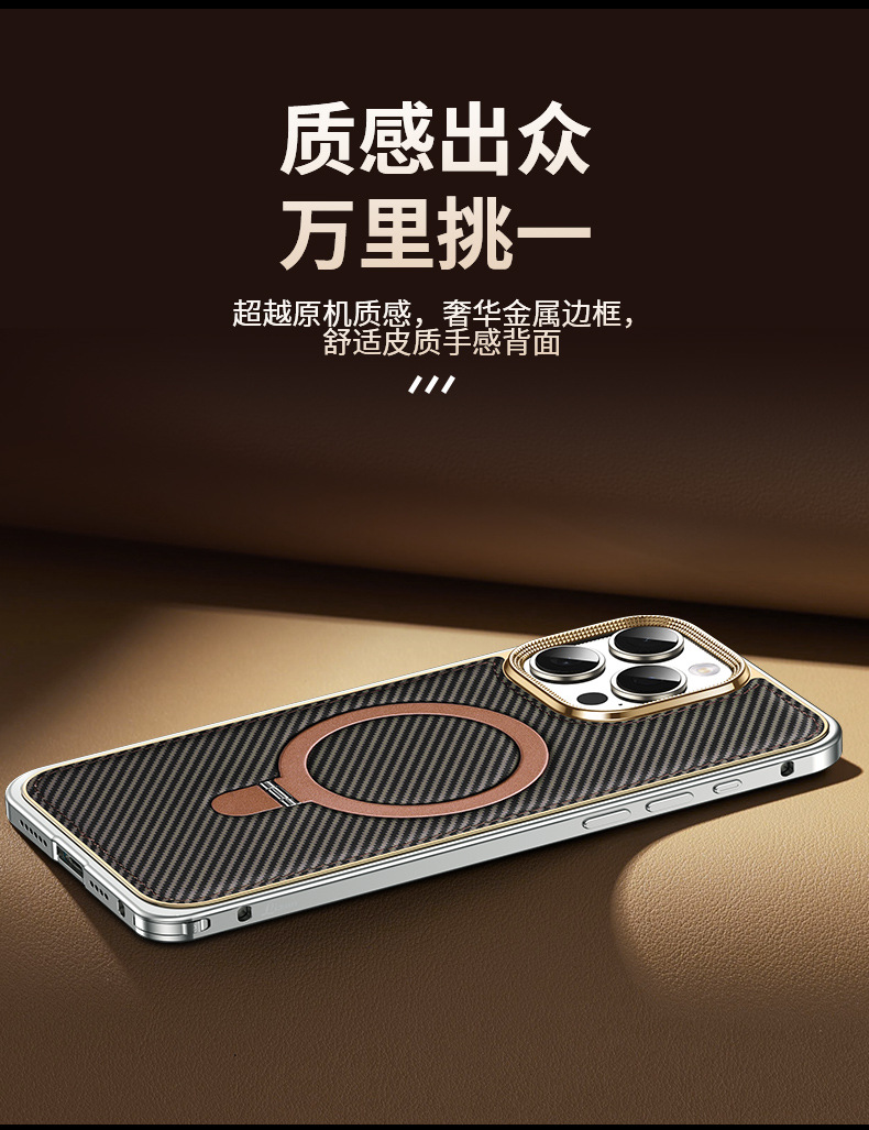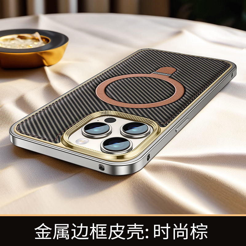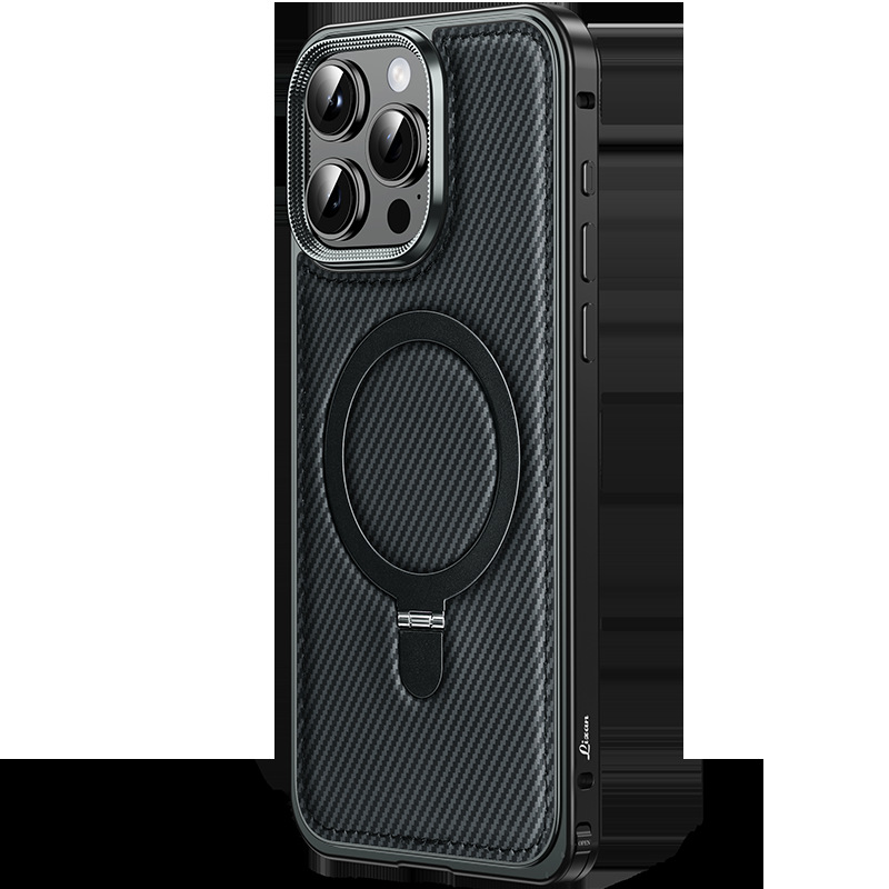 新款适用苹果15弹力扣金属边框碳纤纹支架手机壳iPhone14保护套