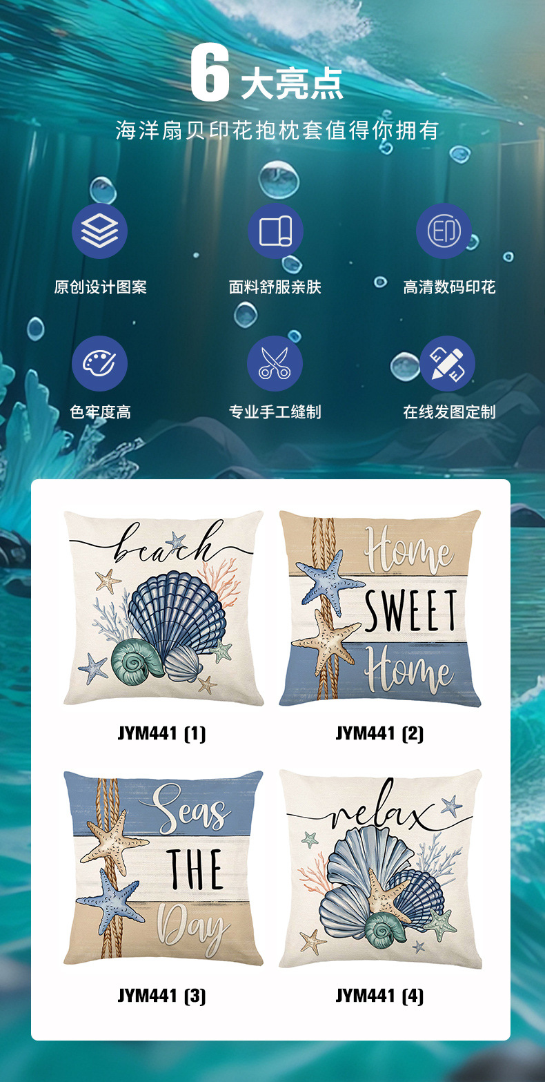 temu新款海洋扇贝印花靠枕套夏日字母海星抱枕套客厅卧室靠垫批发