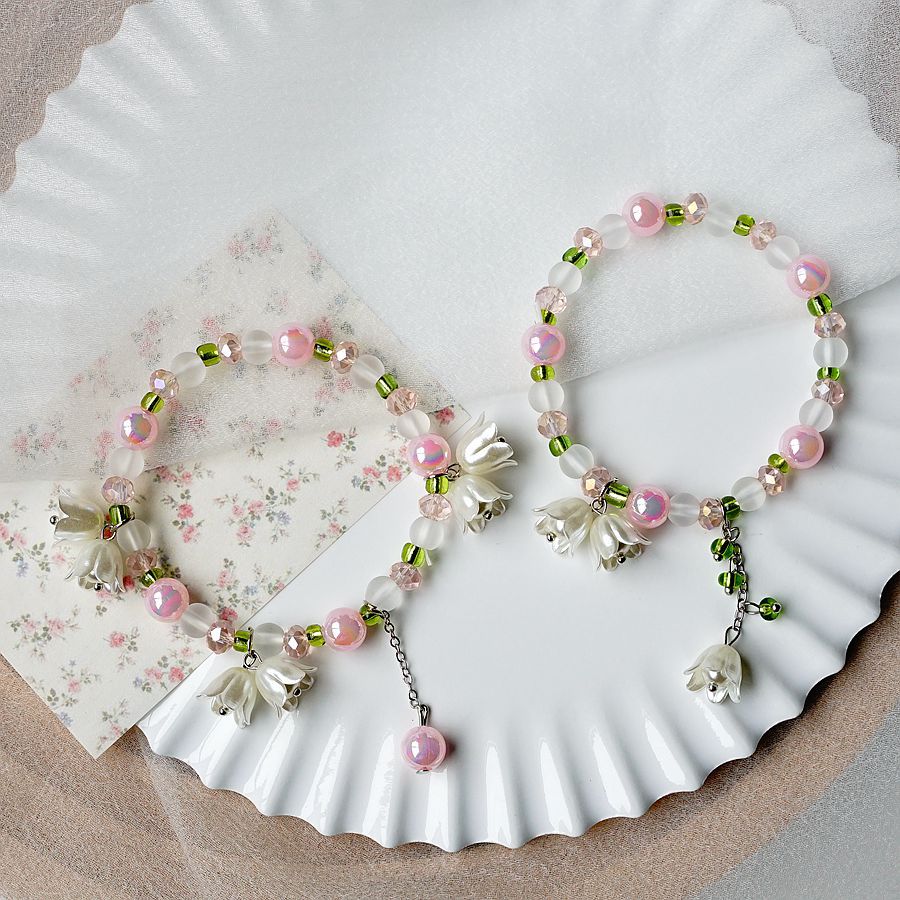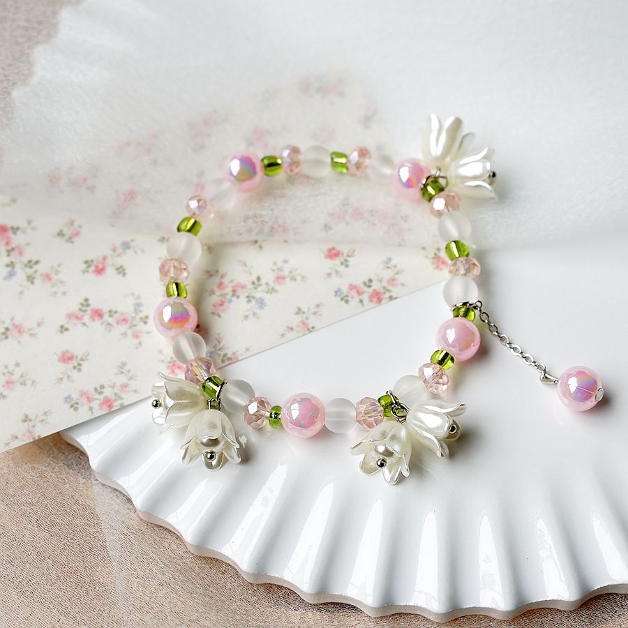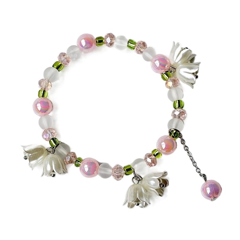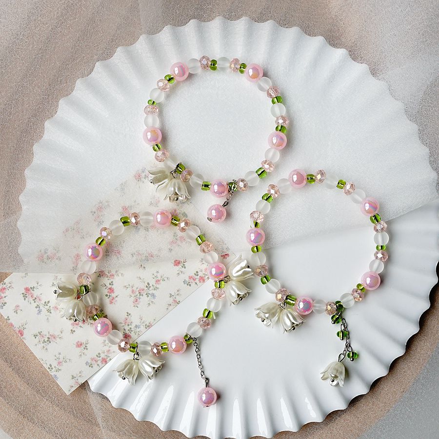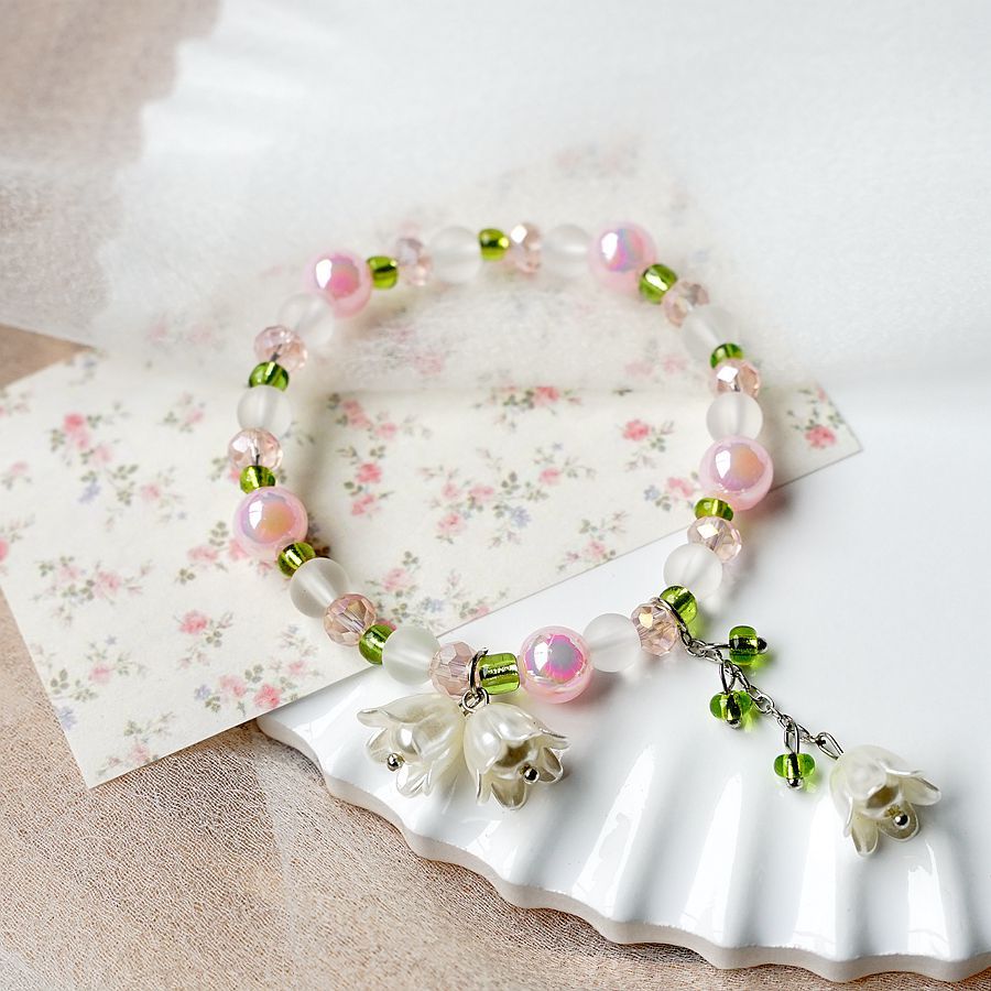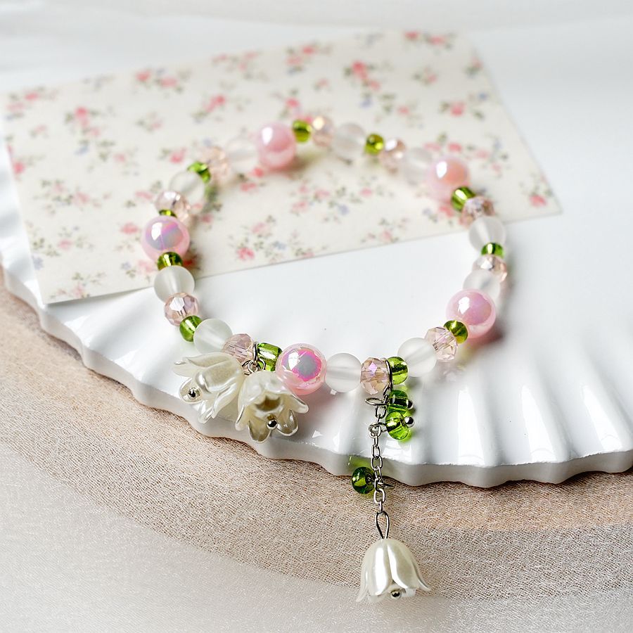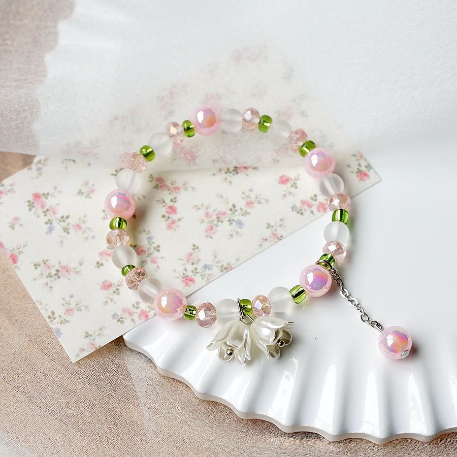 2024新款日韩流行珍珠铃兰花手串批发 简约文艺粉色渐变学生手链