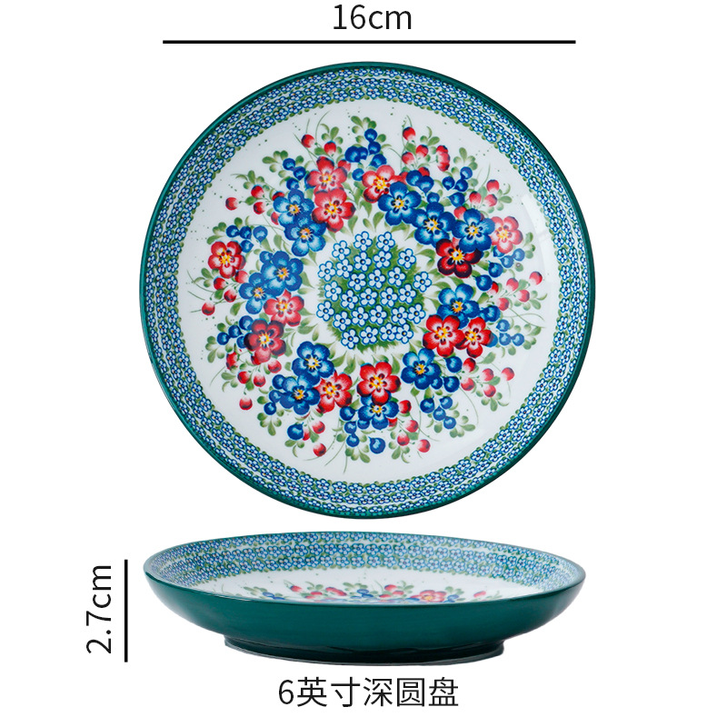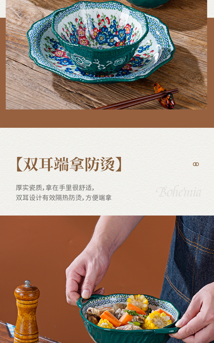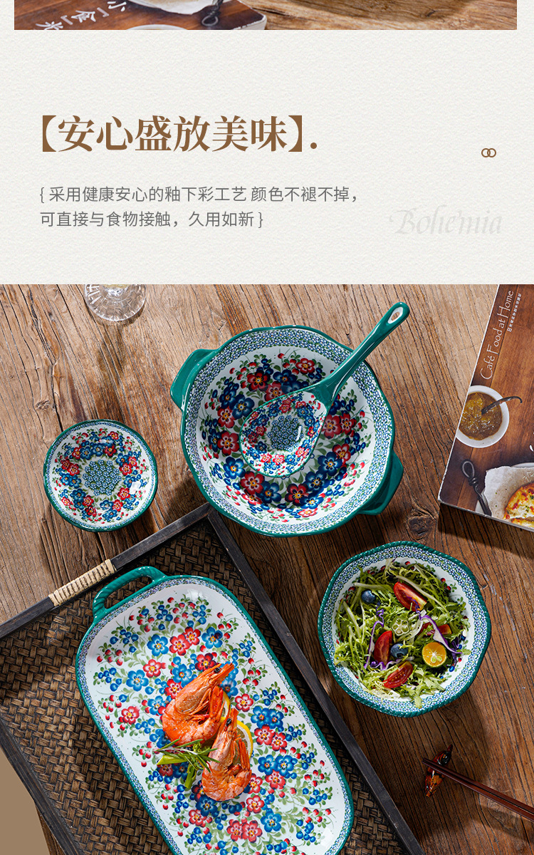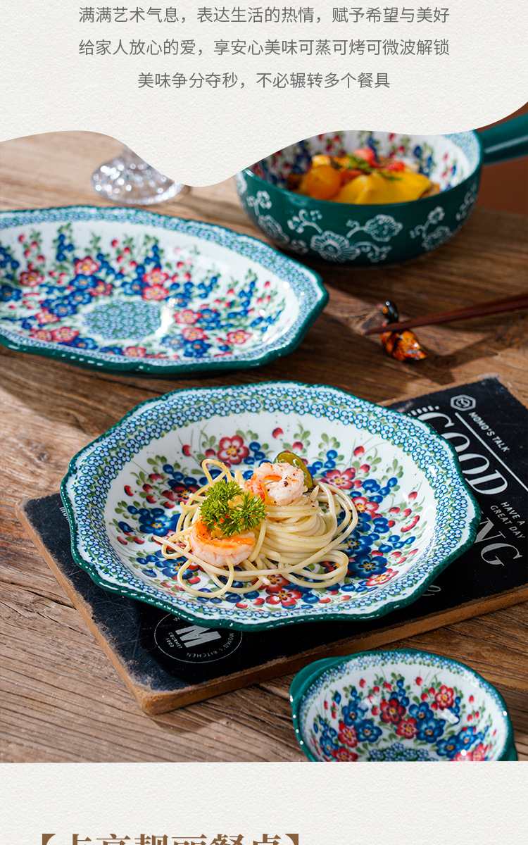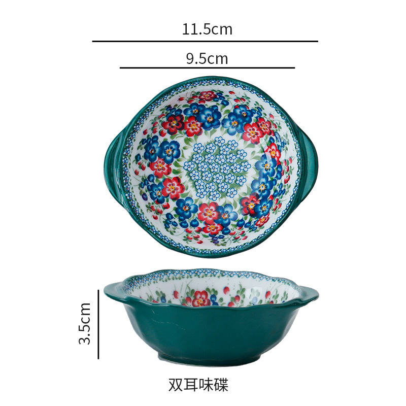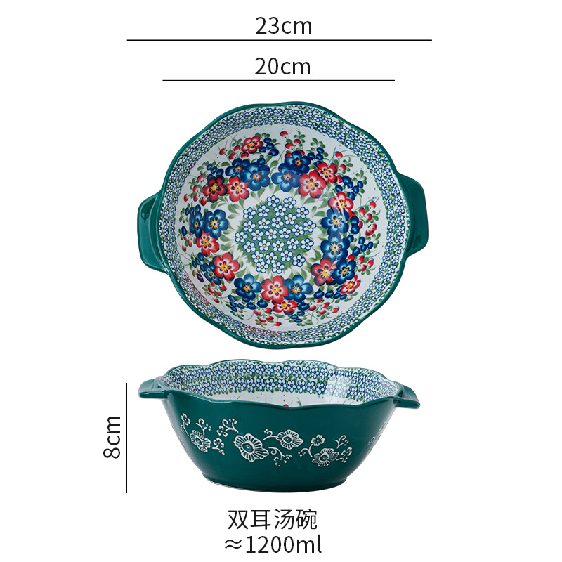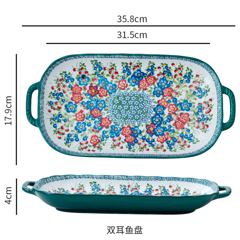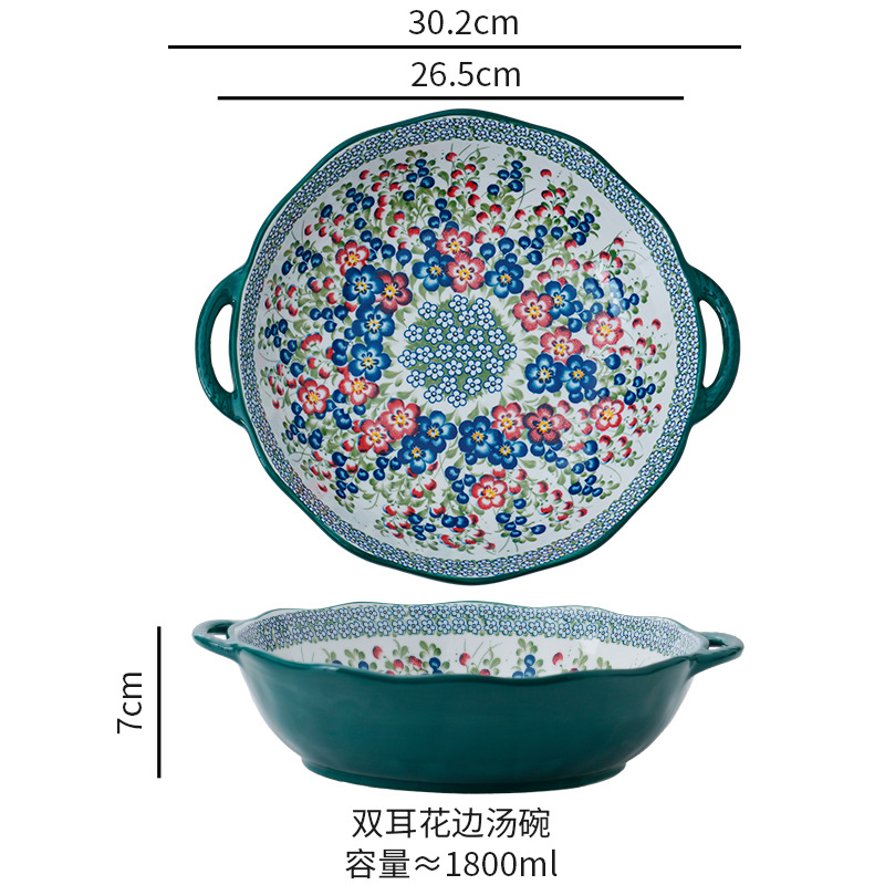 波兰彩陶瓷餐具手绘釉下彩家用菜盘双耳汤碗手柄碗双耳鱼盘饭碗汤